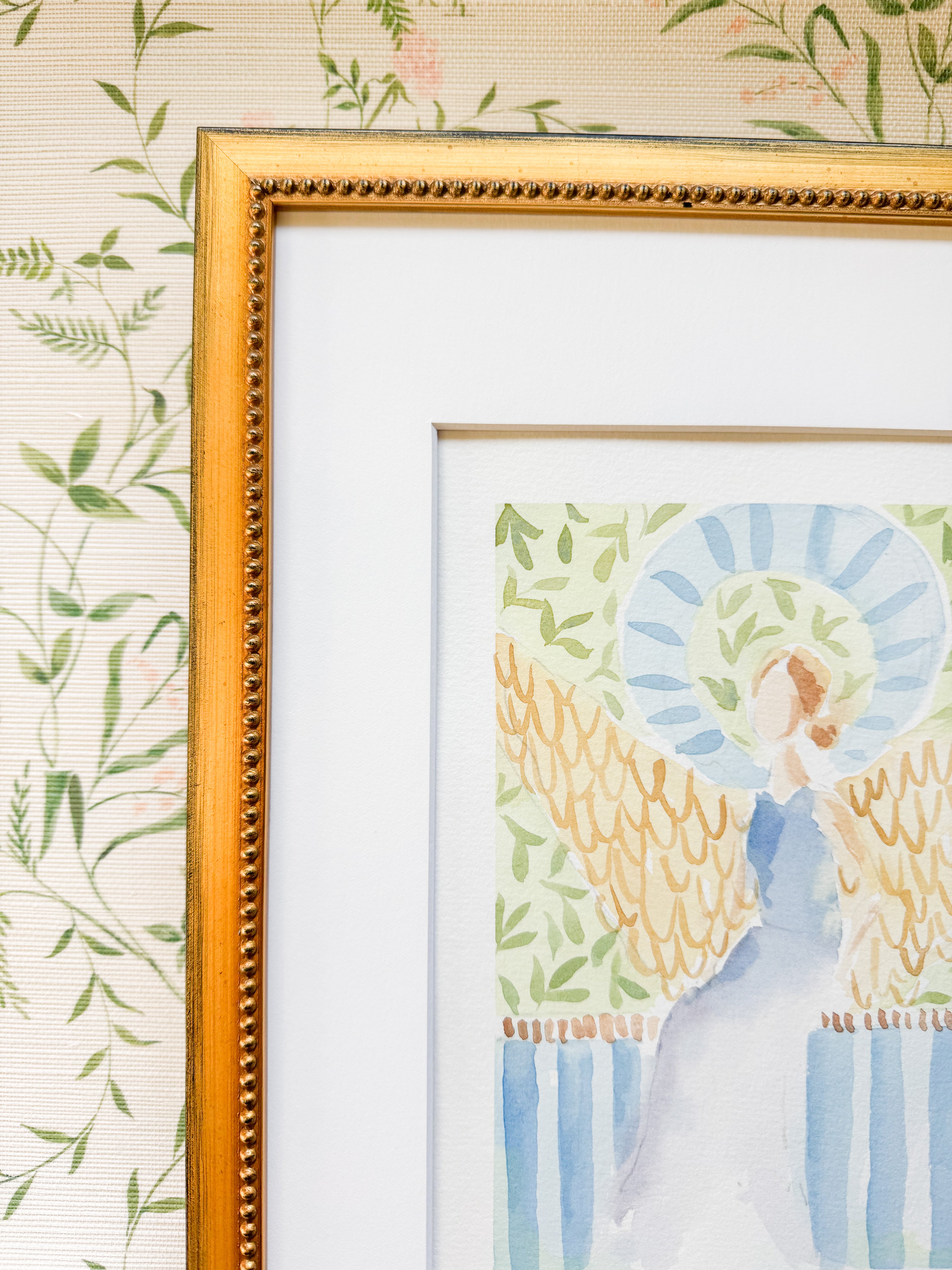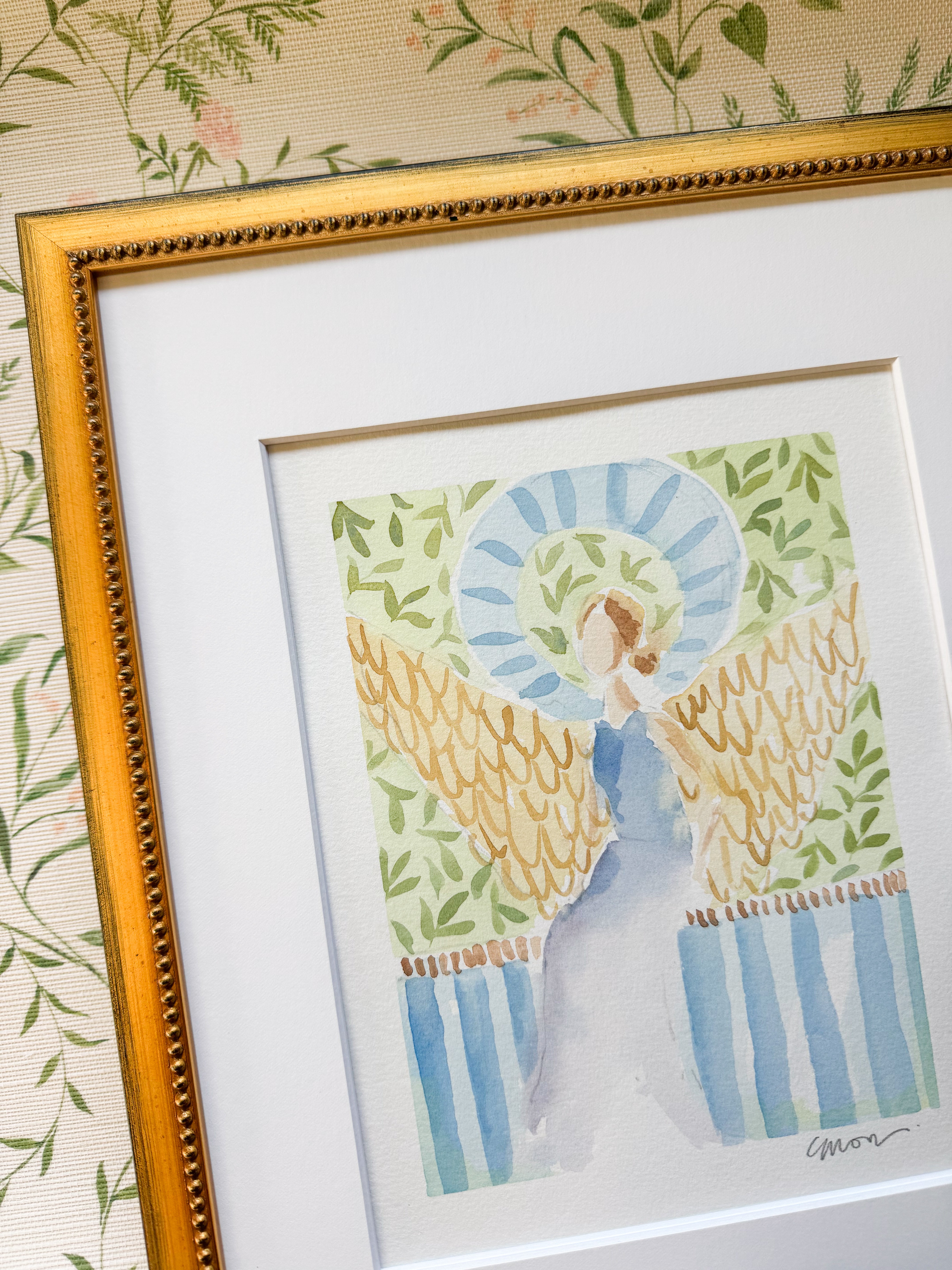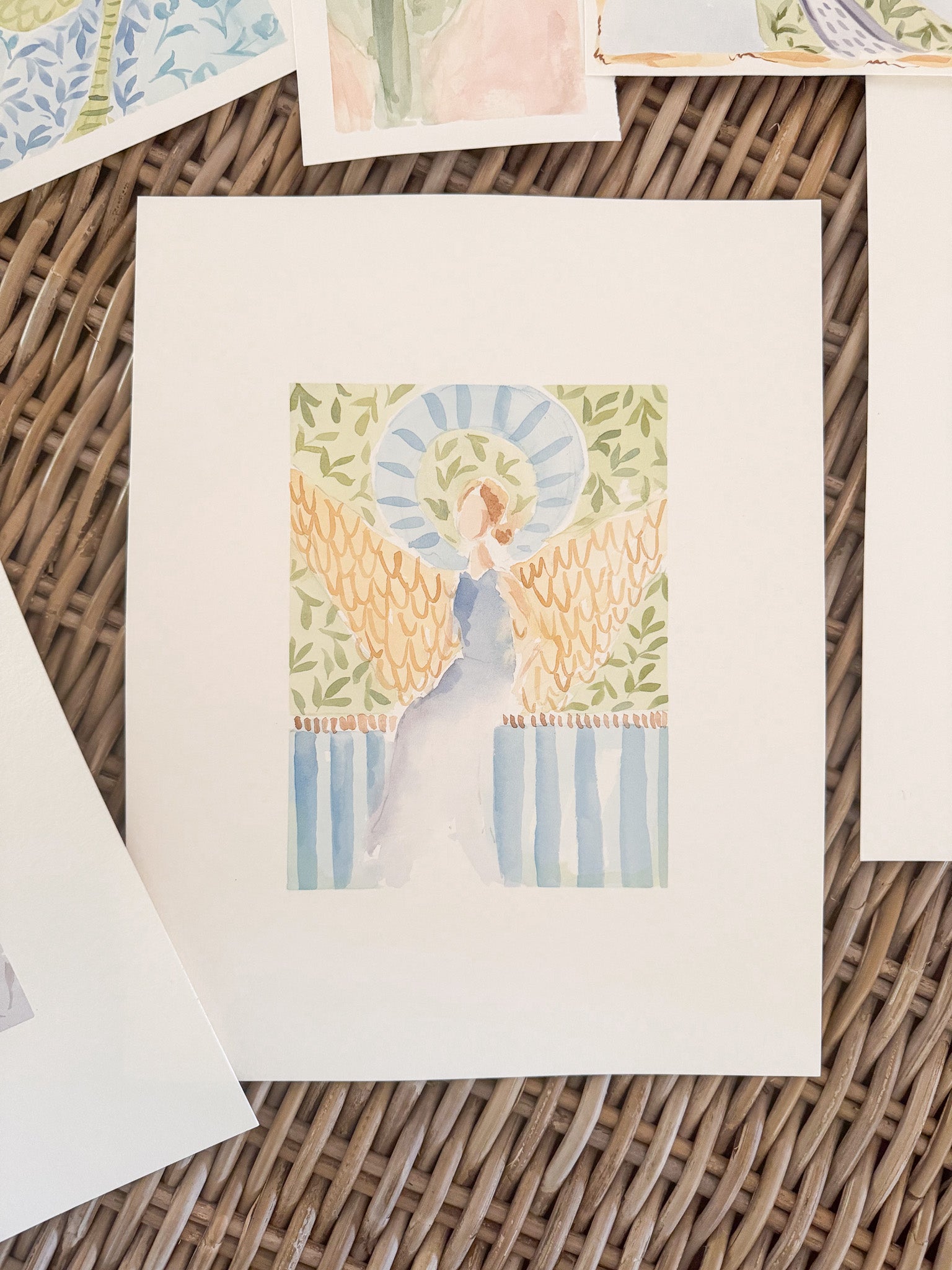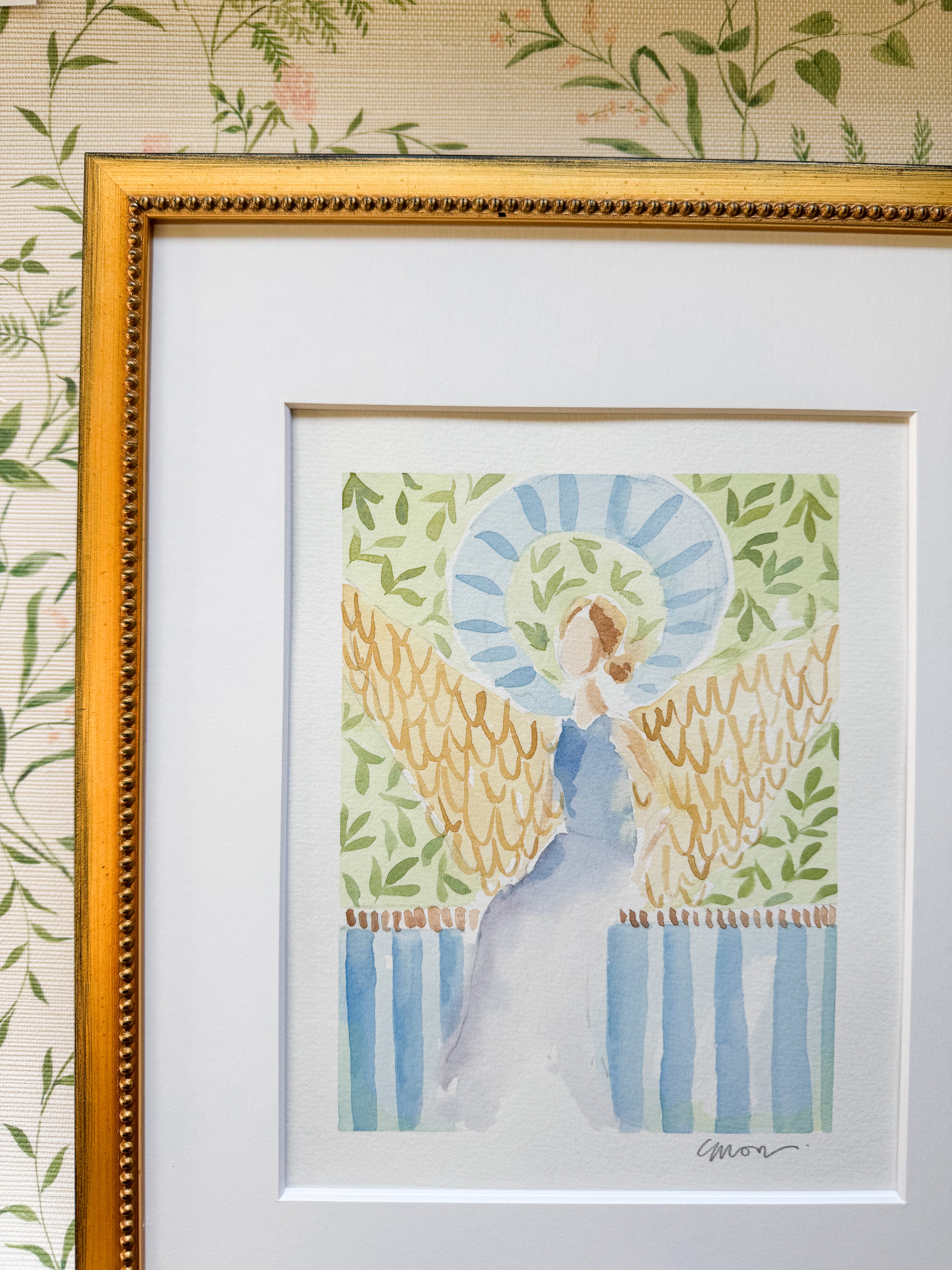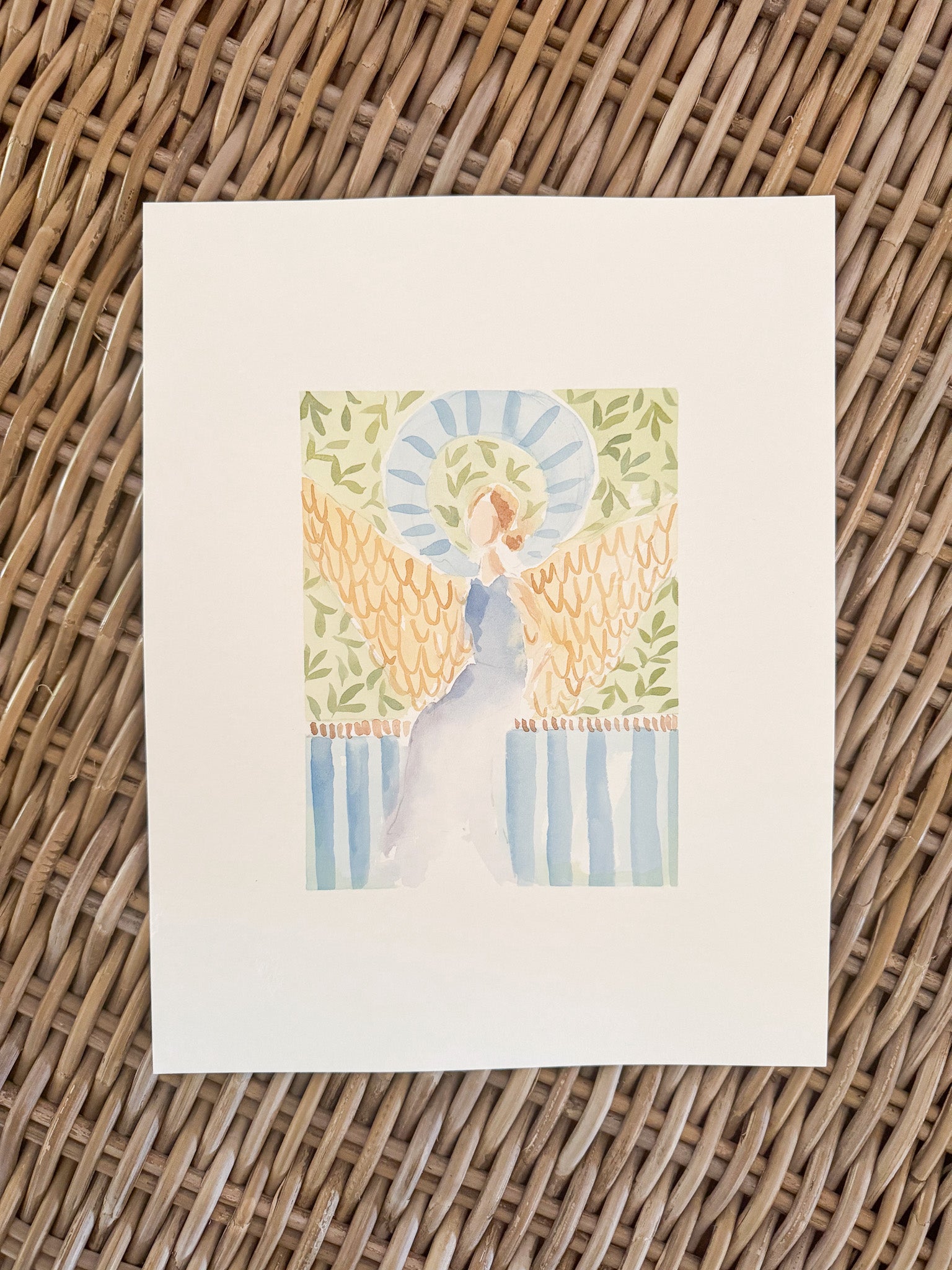 This original watercolor angel is painted on 11x14 fine art watercolor paper, featuring delicate pattern work that frames the figure beautifully. Each piece carries a gentle sense of peace and light, making it a meaningful addition to your home or a thoughtful gift for someone you love.