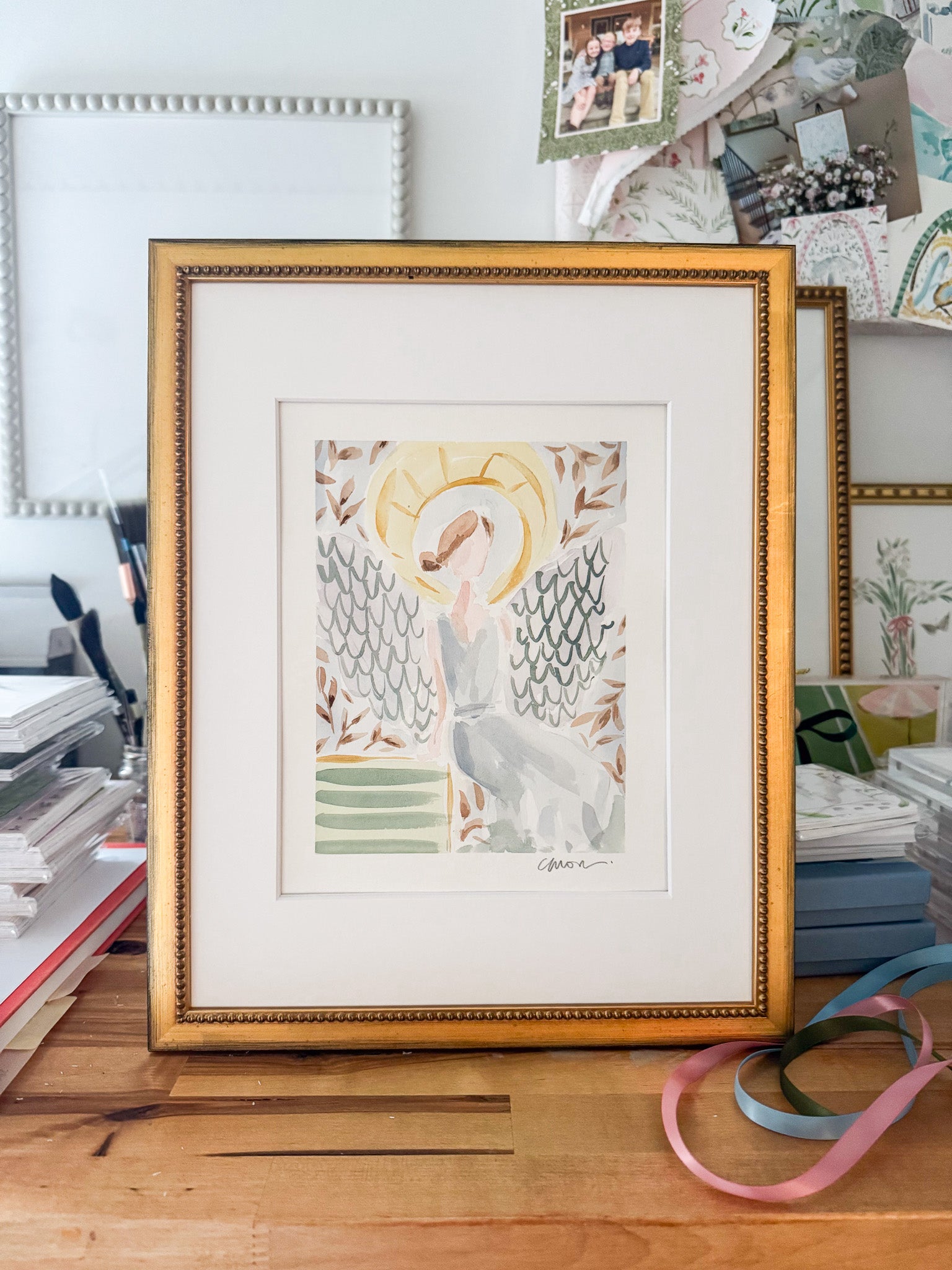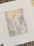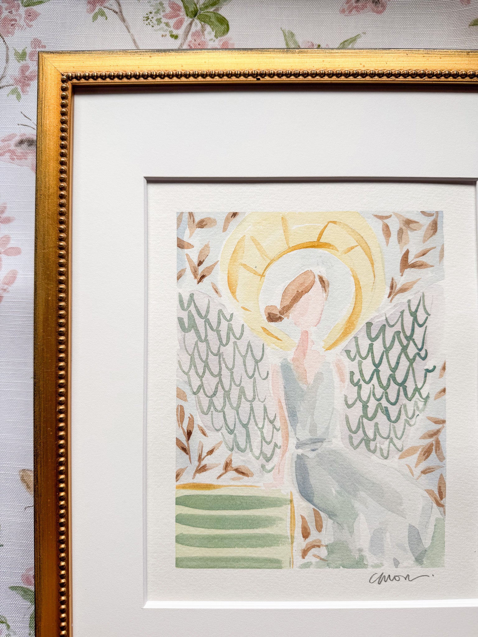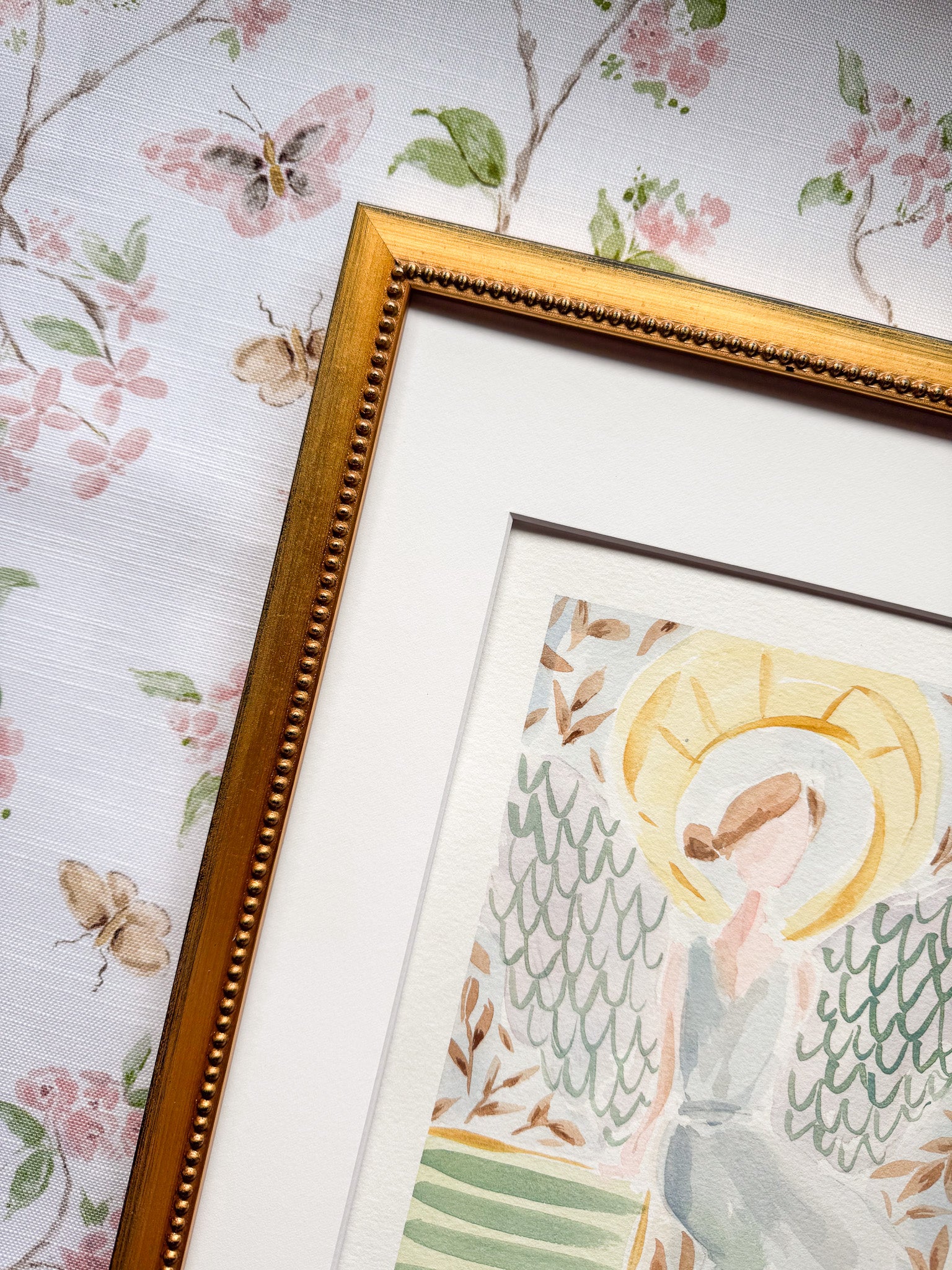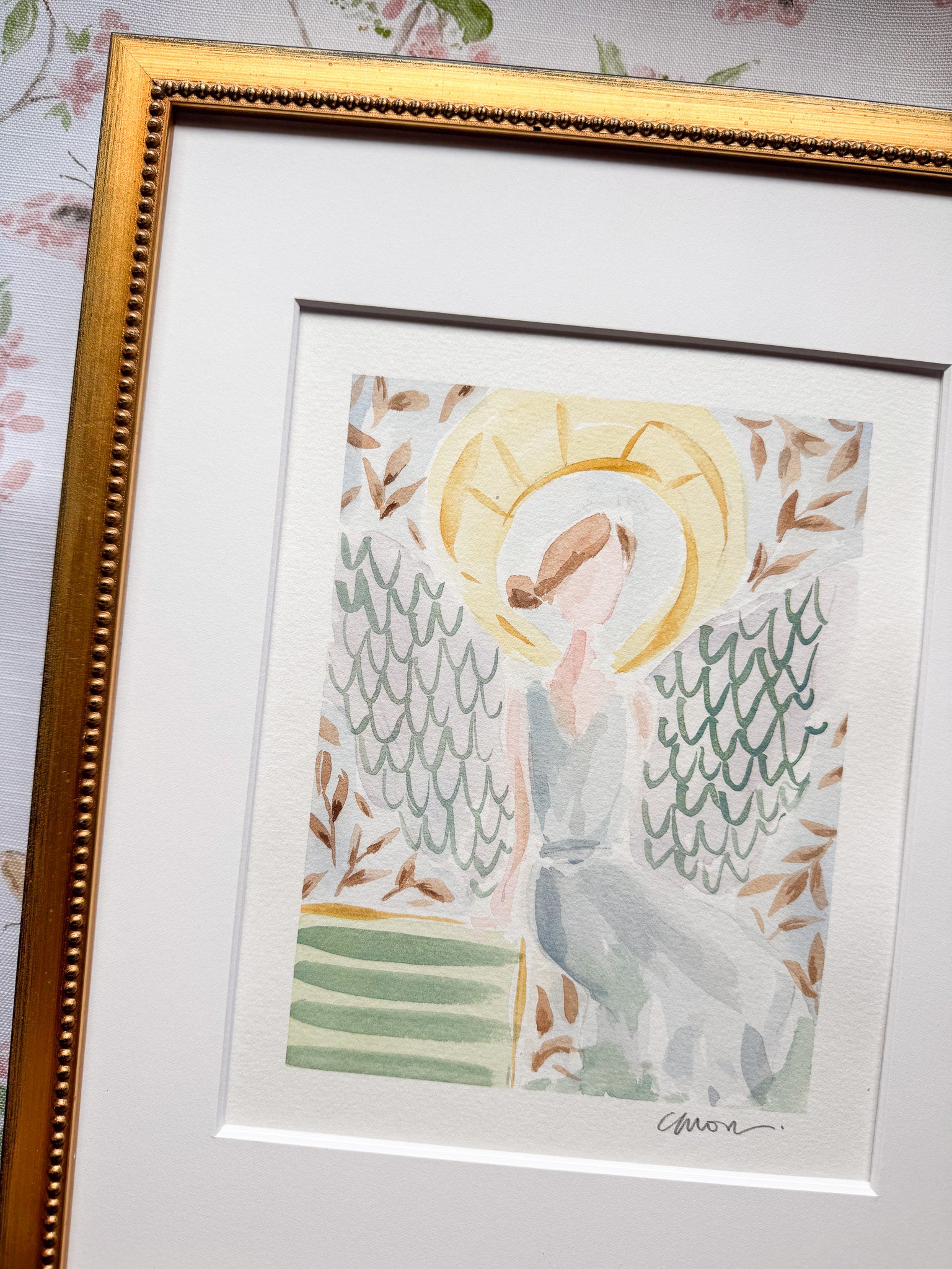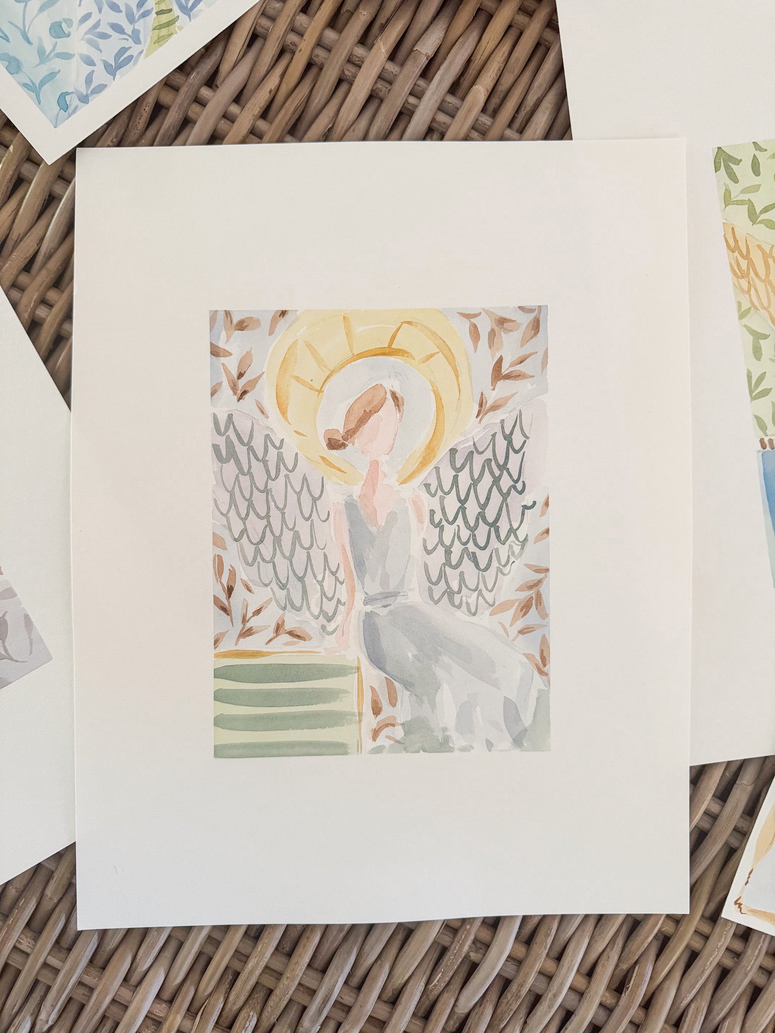 This original watercolor angel is painted on 11x14 fine art watercolor paper, featuring delicate pattern work that frames the figure beautifully. Each piece carries a gentle sense of peace and light, making it a meaningful addition to your home or a thoughtful gift for someone you love.