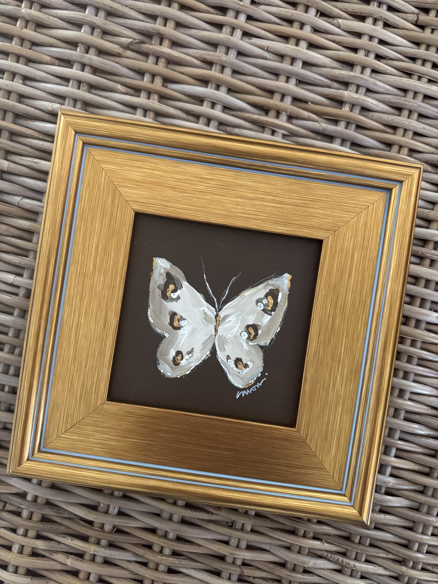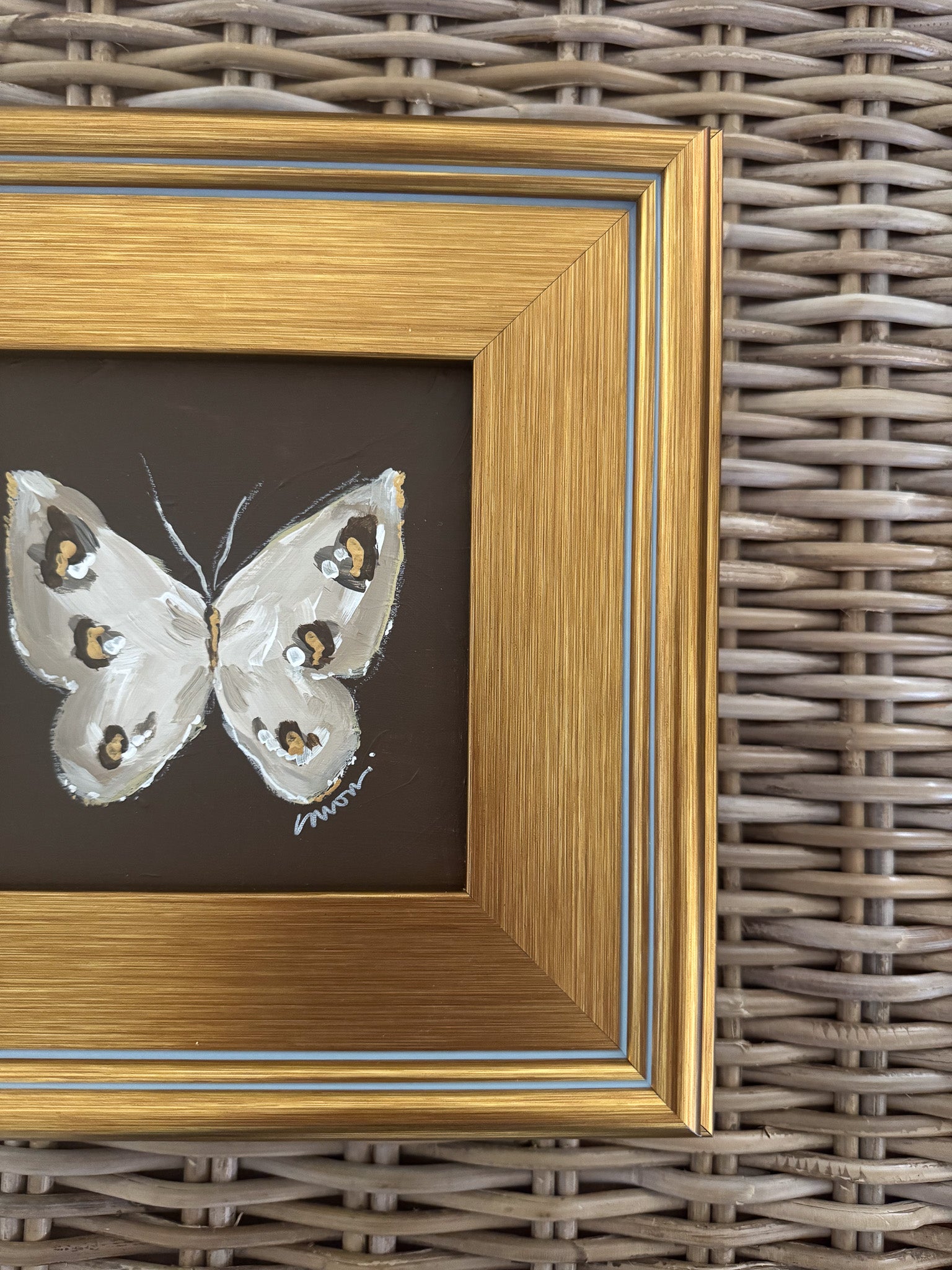 This original work by Camilla Moss is a butterfly painting on wood panel framed in a custom gold frame, ready for hanging.  Frame measures approximately 11.5" x 11.5".