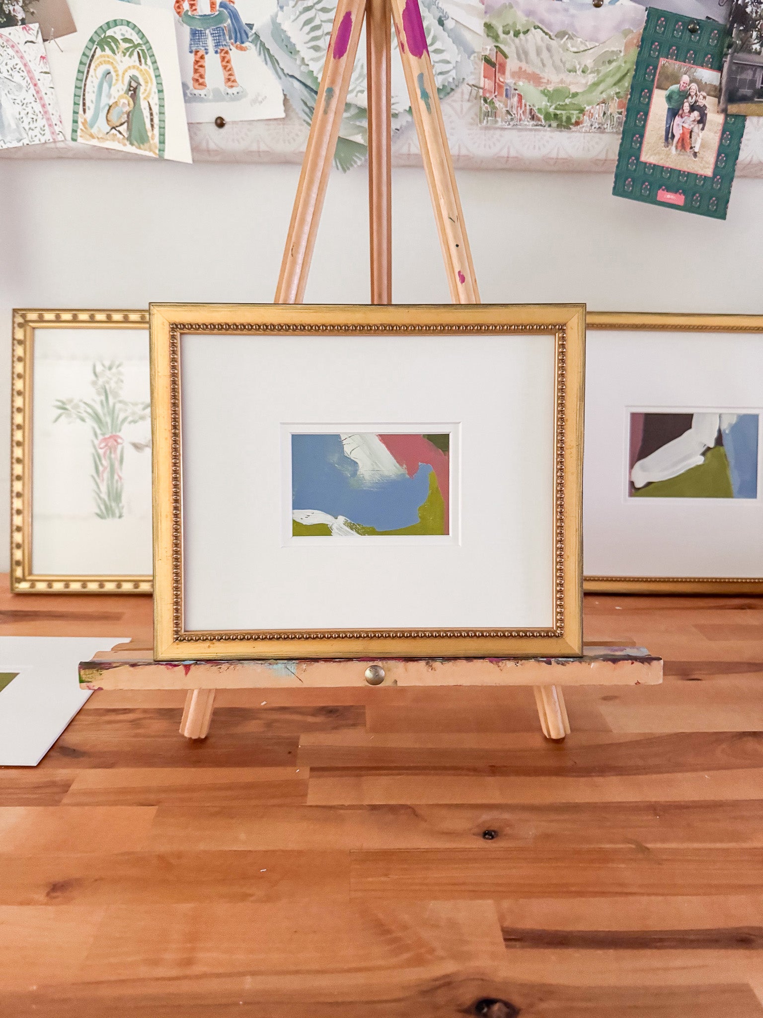 This original work by Camilla Moss is a acrylic abstract painting on fine art watercolor paper matted to a custom double mat measuring 8x10, ready for framing.  Frame shown is not included.
