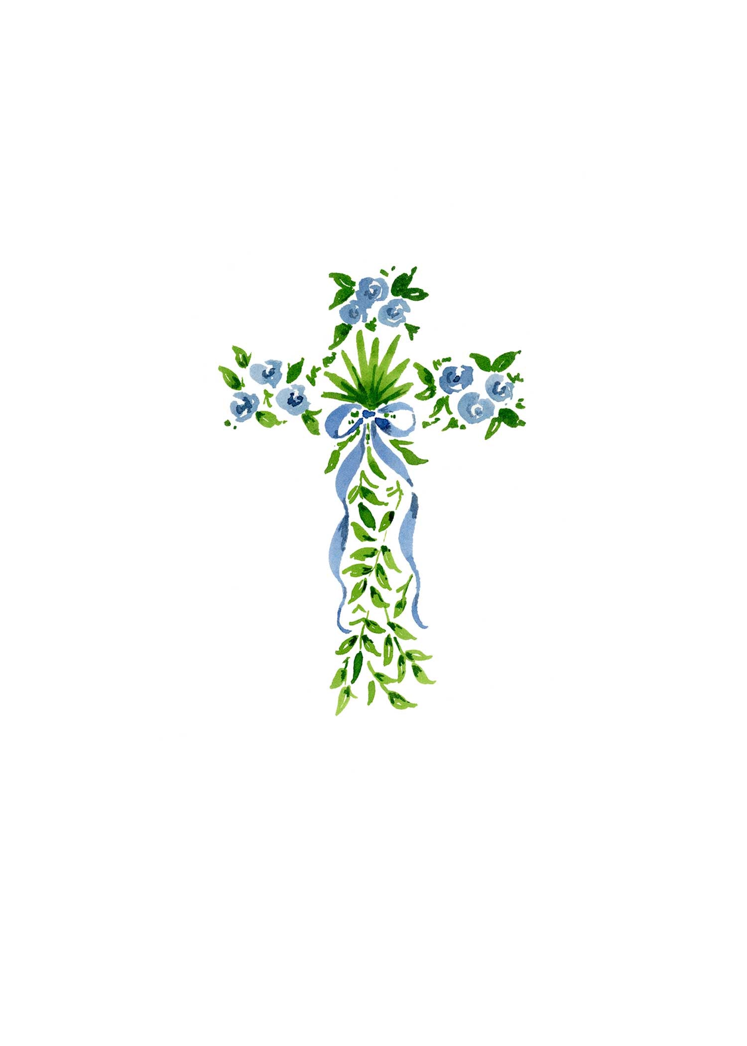 Giclée art print of a blue floral and palmetto cross originally painted in watercolor on bright white archival quality paper with a subtle watercolor-like texture. Print measures 5x7.