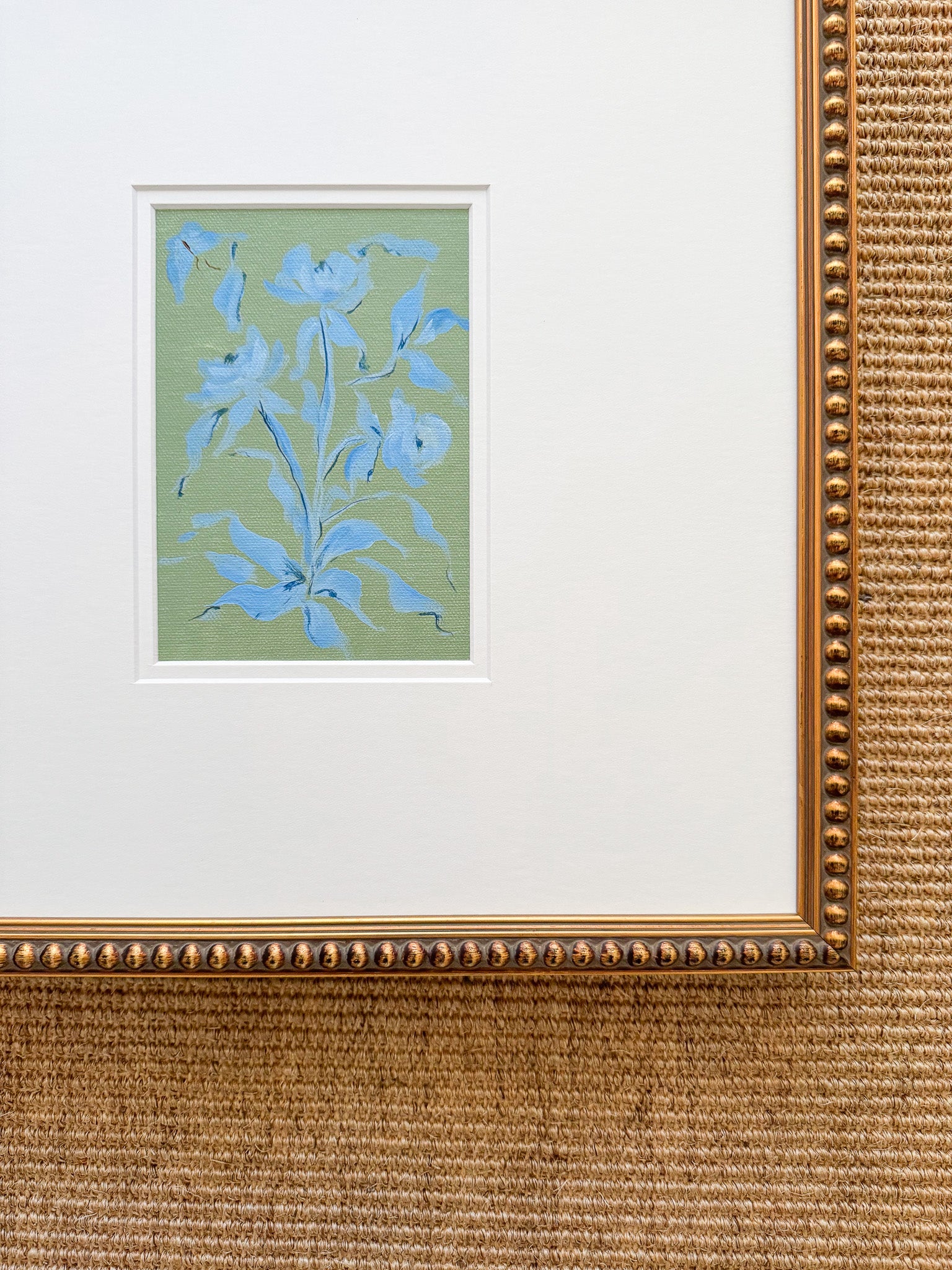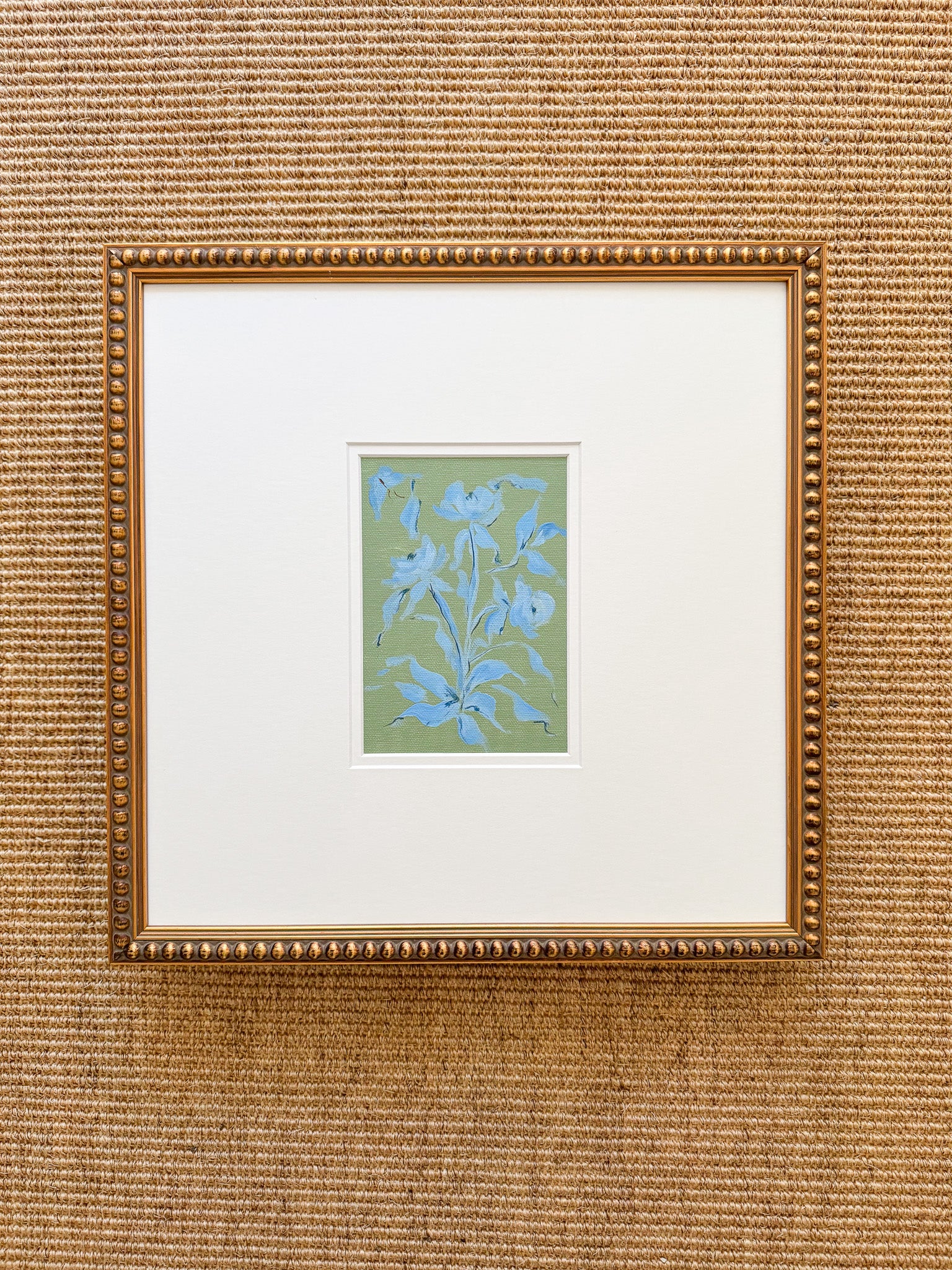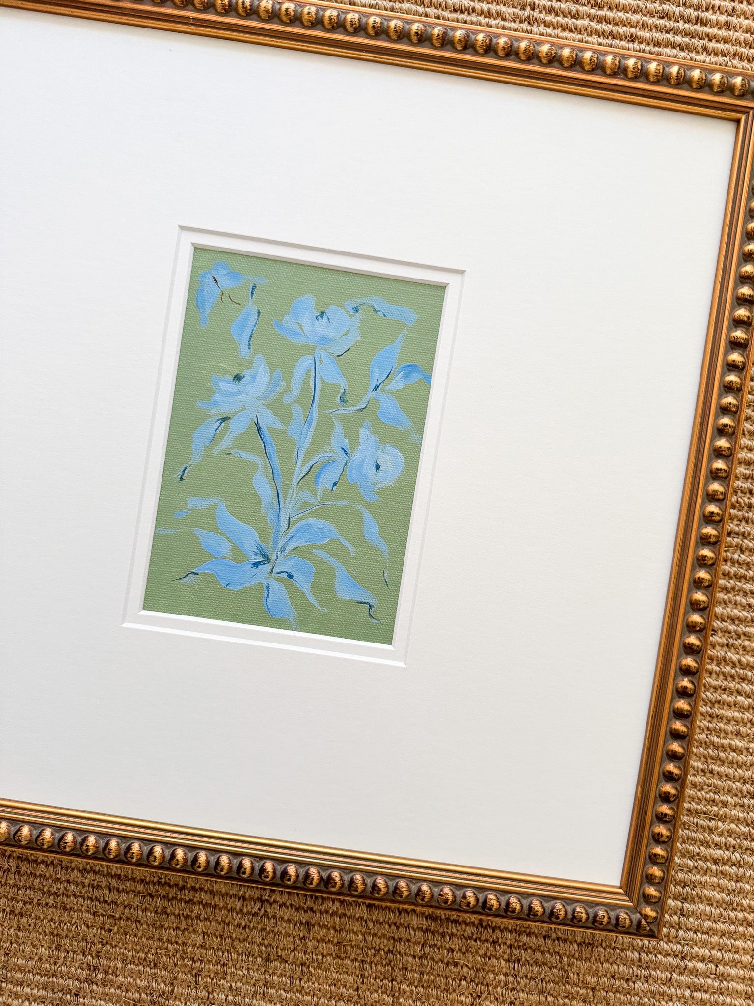 This original work by Camilla Moss is an acrylic floral wildflower painting measuring 5x7 on canvas in a custom 14 x 14 double mat, unframed.  Frame shown is not included.