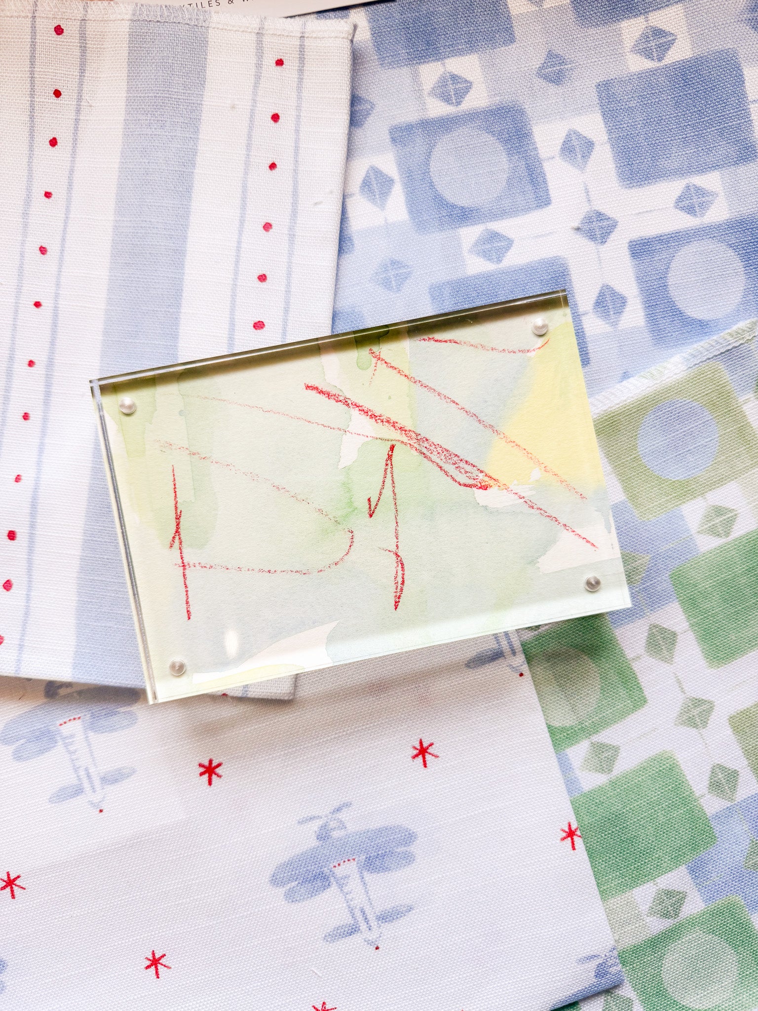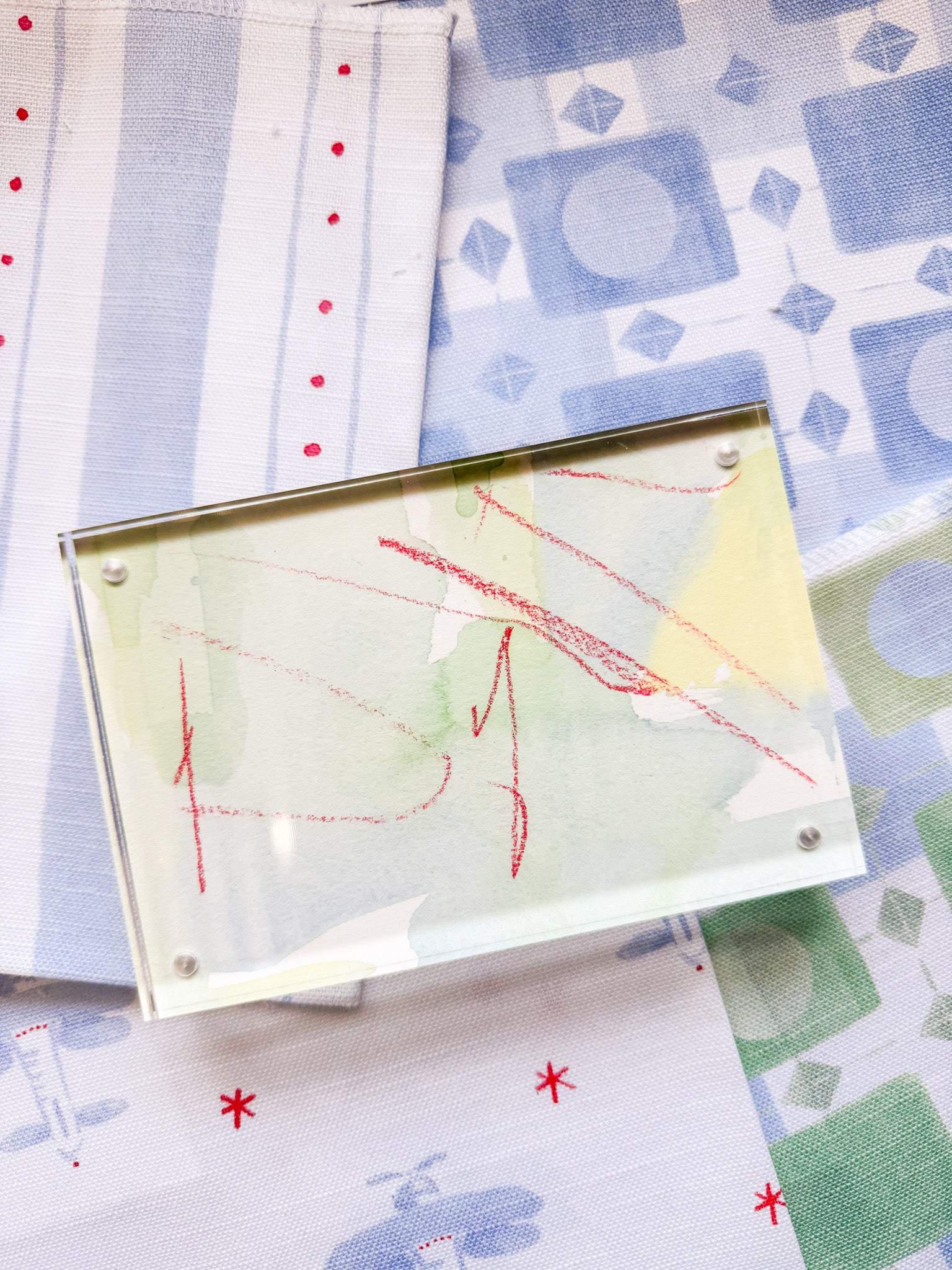 This original work by David Moss (7 years old) (with no help from Mom!) is an abstract watercolor and pencil painting measuring 4x6 on watercolor paper framed in a 4x6 acrylic desktop frame. Display orientation of painting can be adjusted to suit your preference and home.
