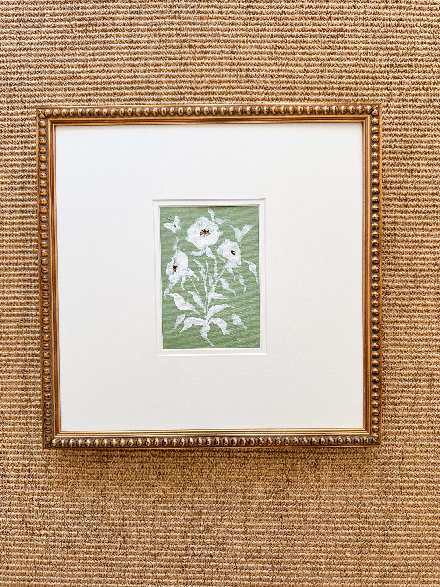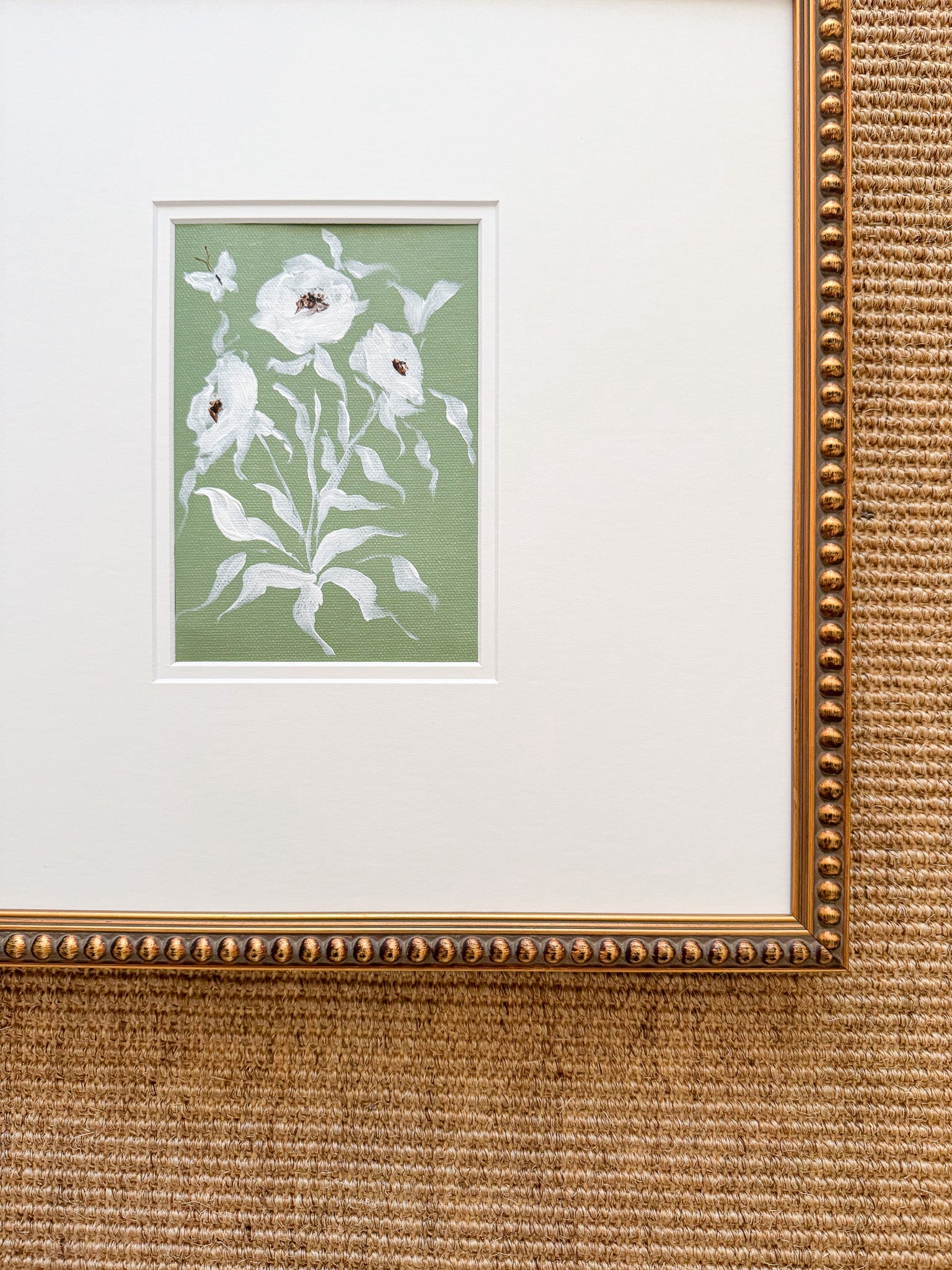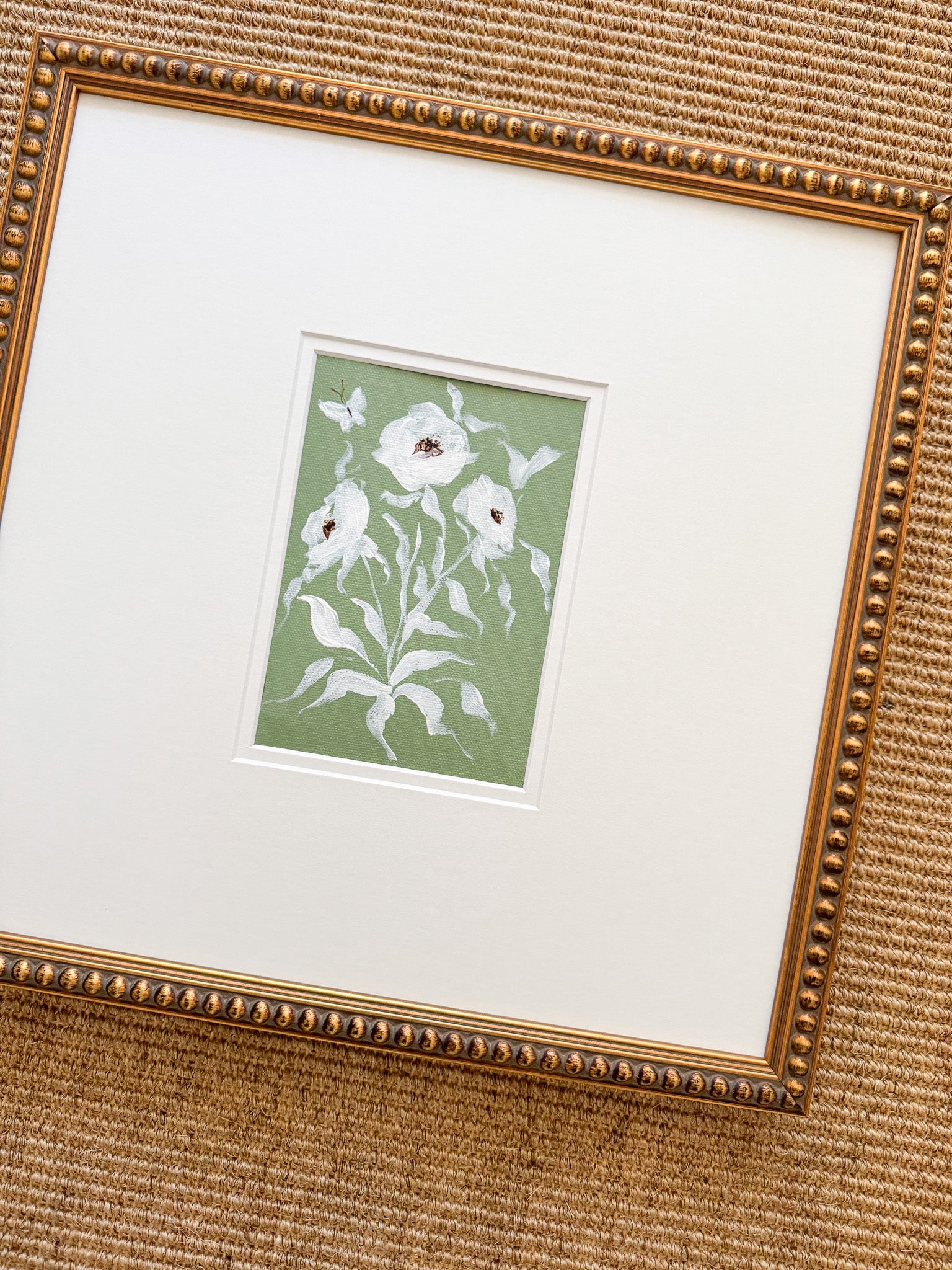 This original work by Camilla Moss is an acrylic floral wildflower painting measuring 5x7 on canvas in a custom 14x14 double mat, unframed. Frame shown is not included.