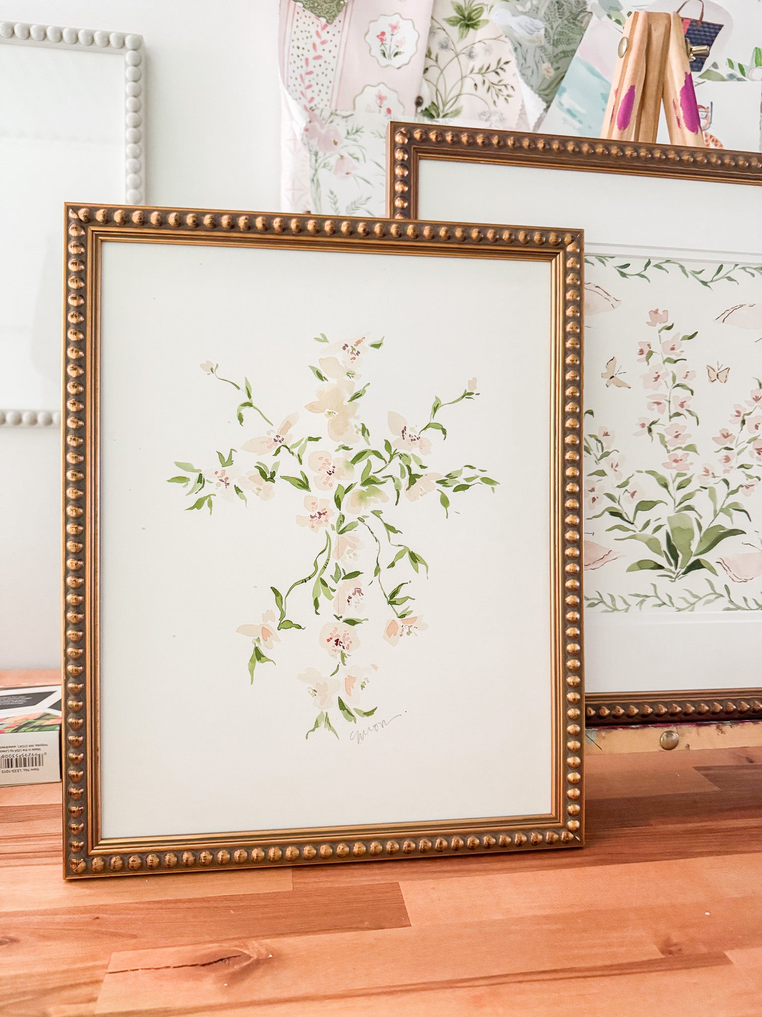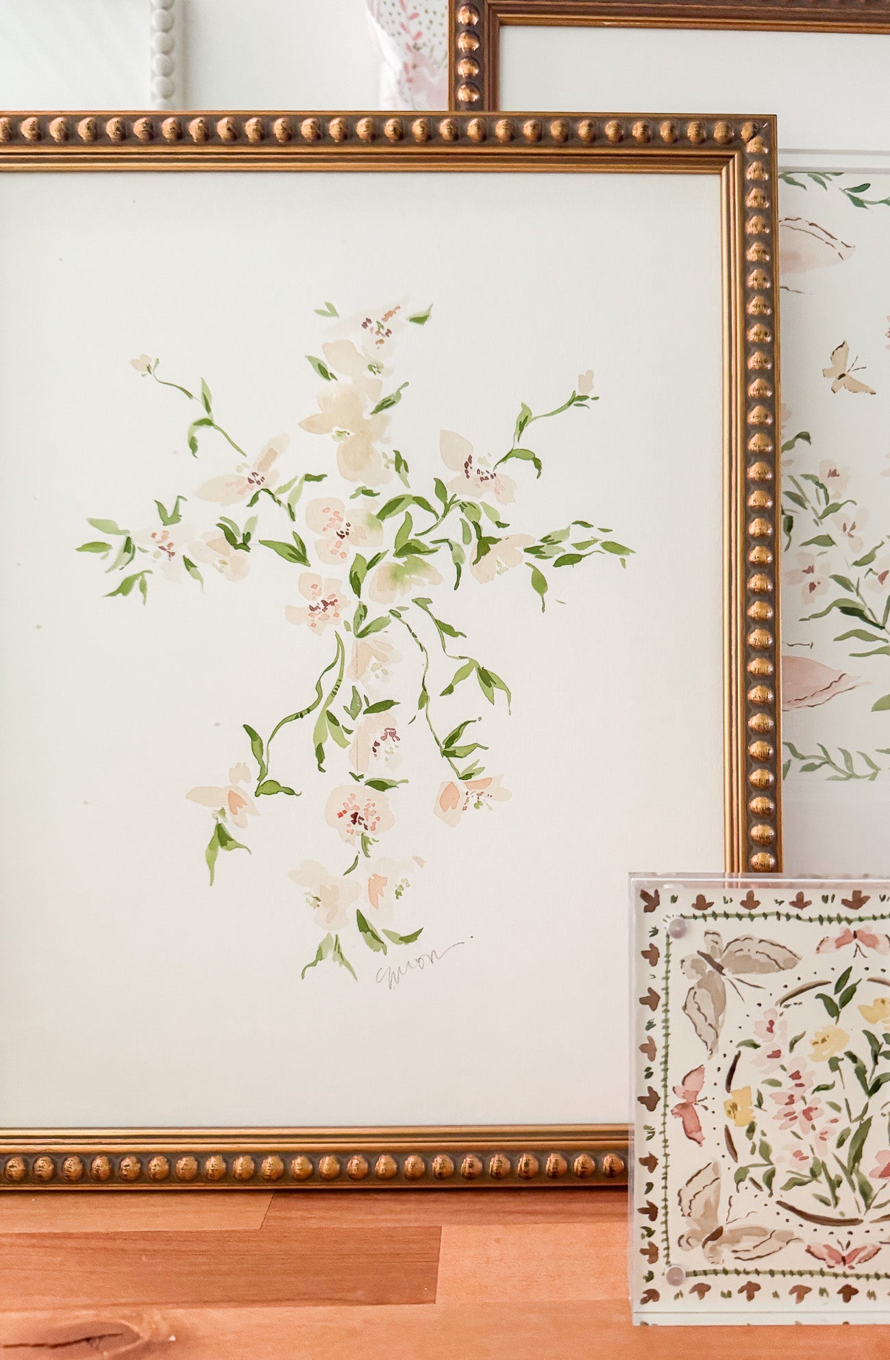 This original work by Camilla Moss is a watercolor lenten rose floral cross on fine art watercolor paper, measuring 11x14 unframed. Any frame shown is not included.