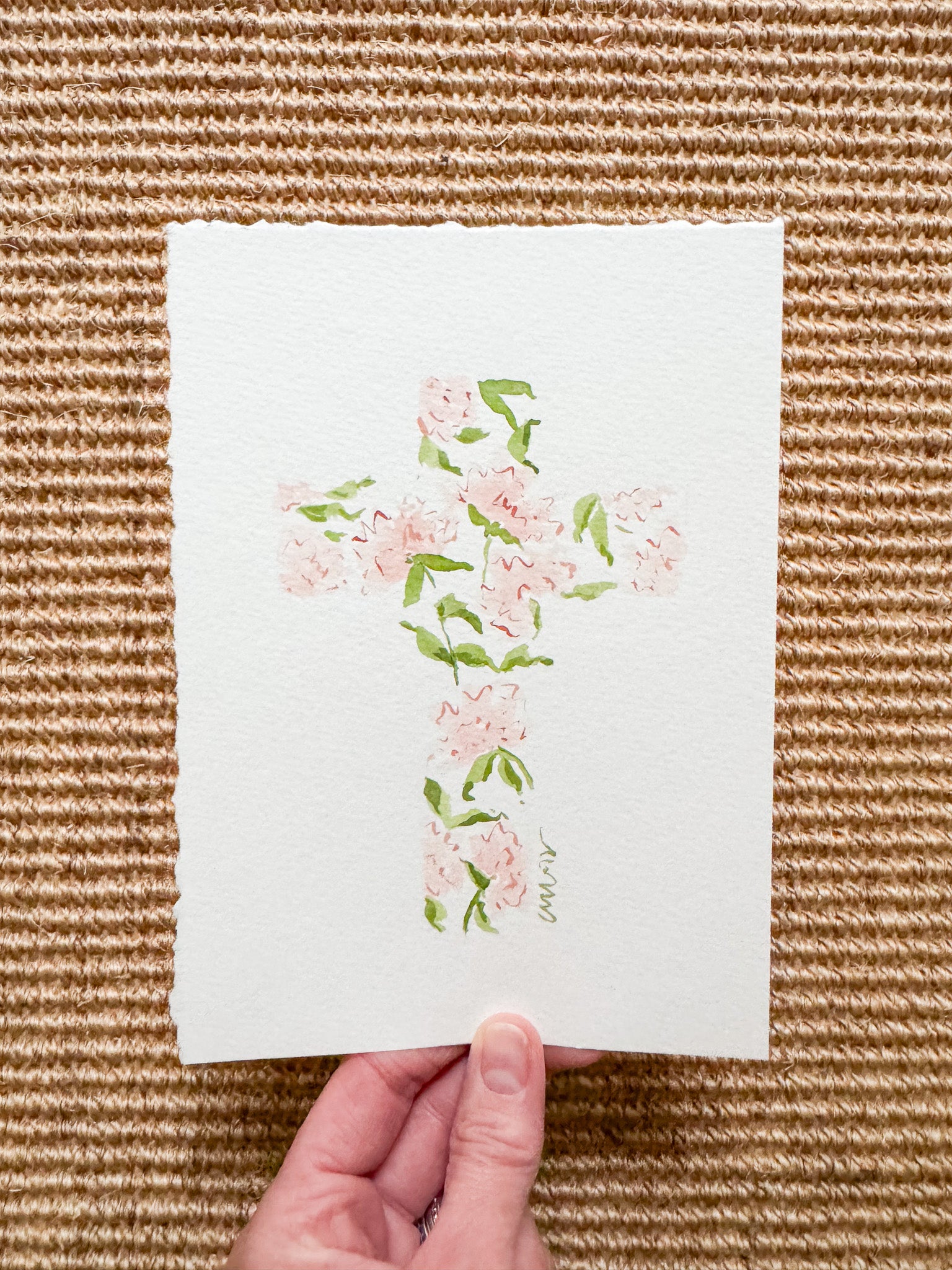 This original work by Camilla Moss is a watercolor floral cross on fine art watercolor paper, measuring 5x7 unframed. Any frame shown is not included.