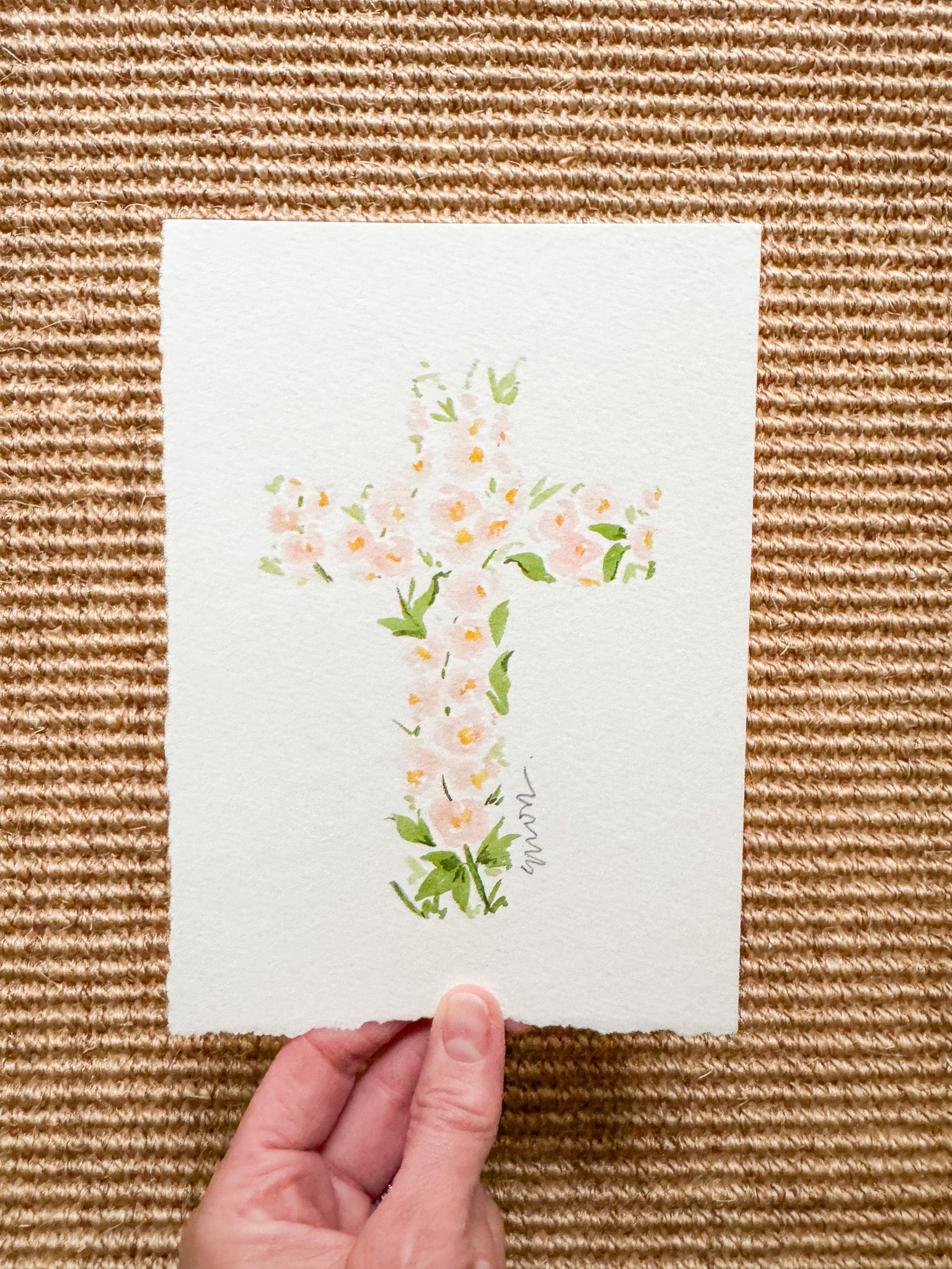 This original work by Camilla Moss is a watercolor floral cross on fine art watercolor paper, measuring 5x7 unframed. Any frame shown is not included.