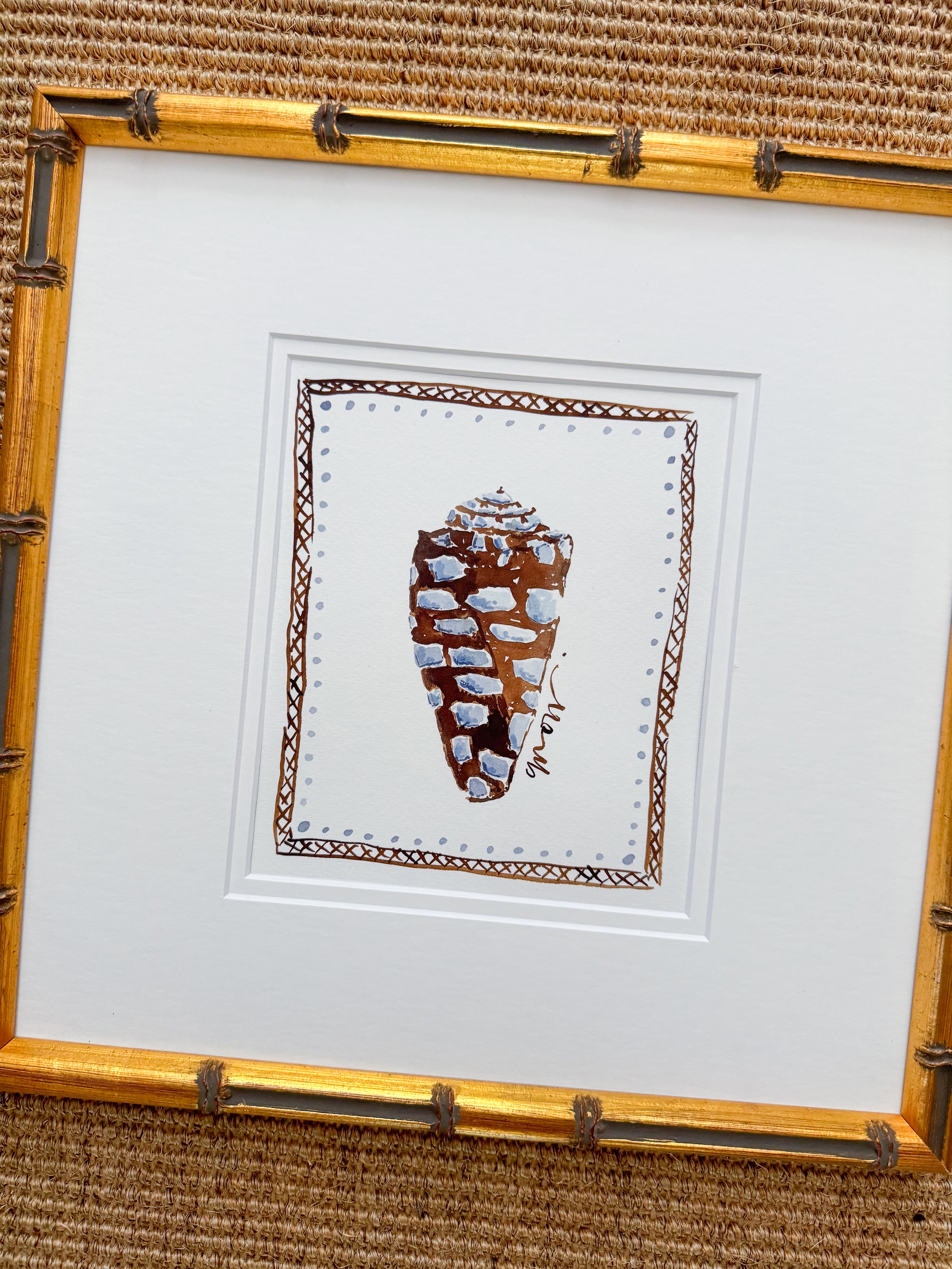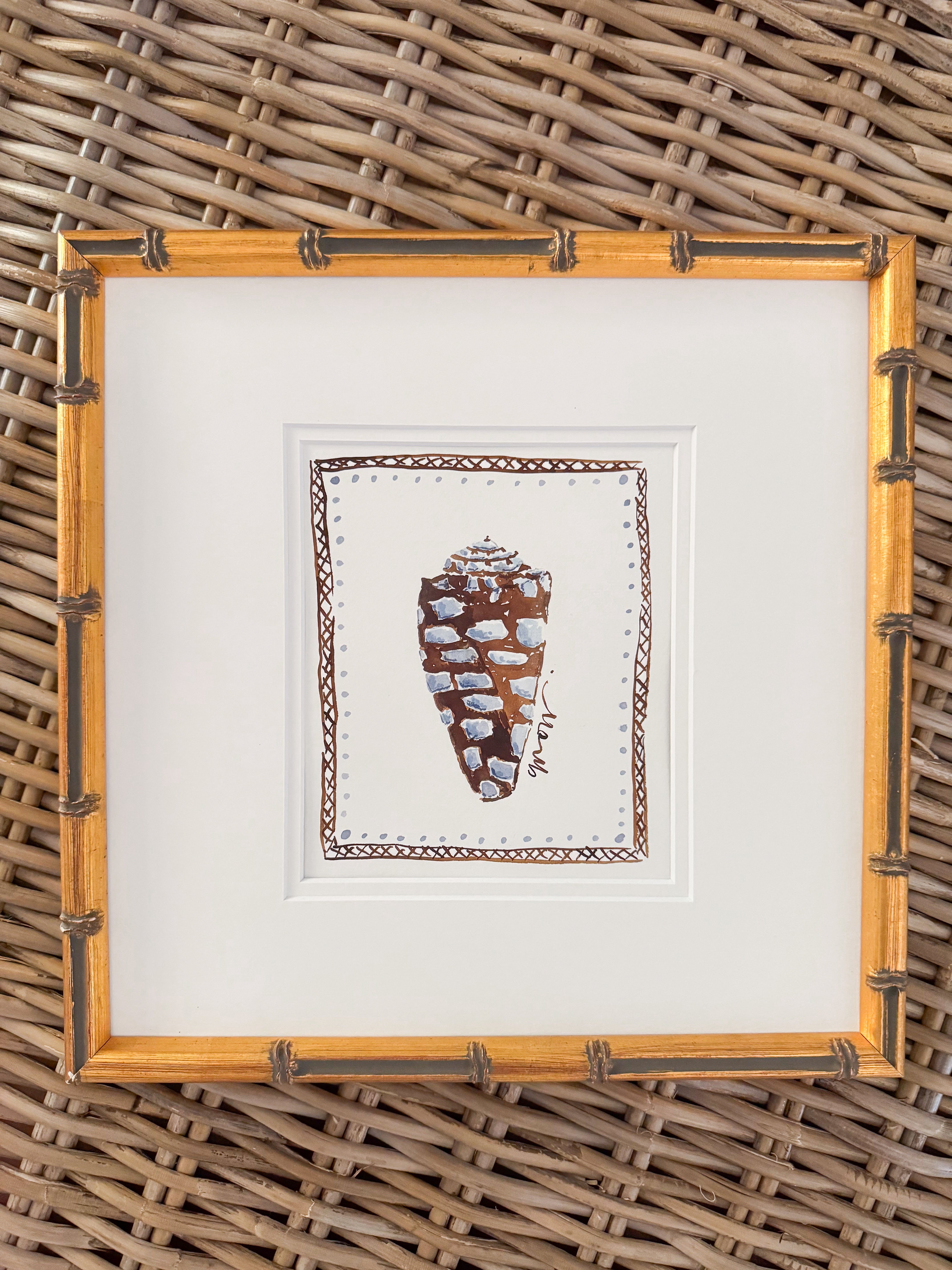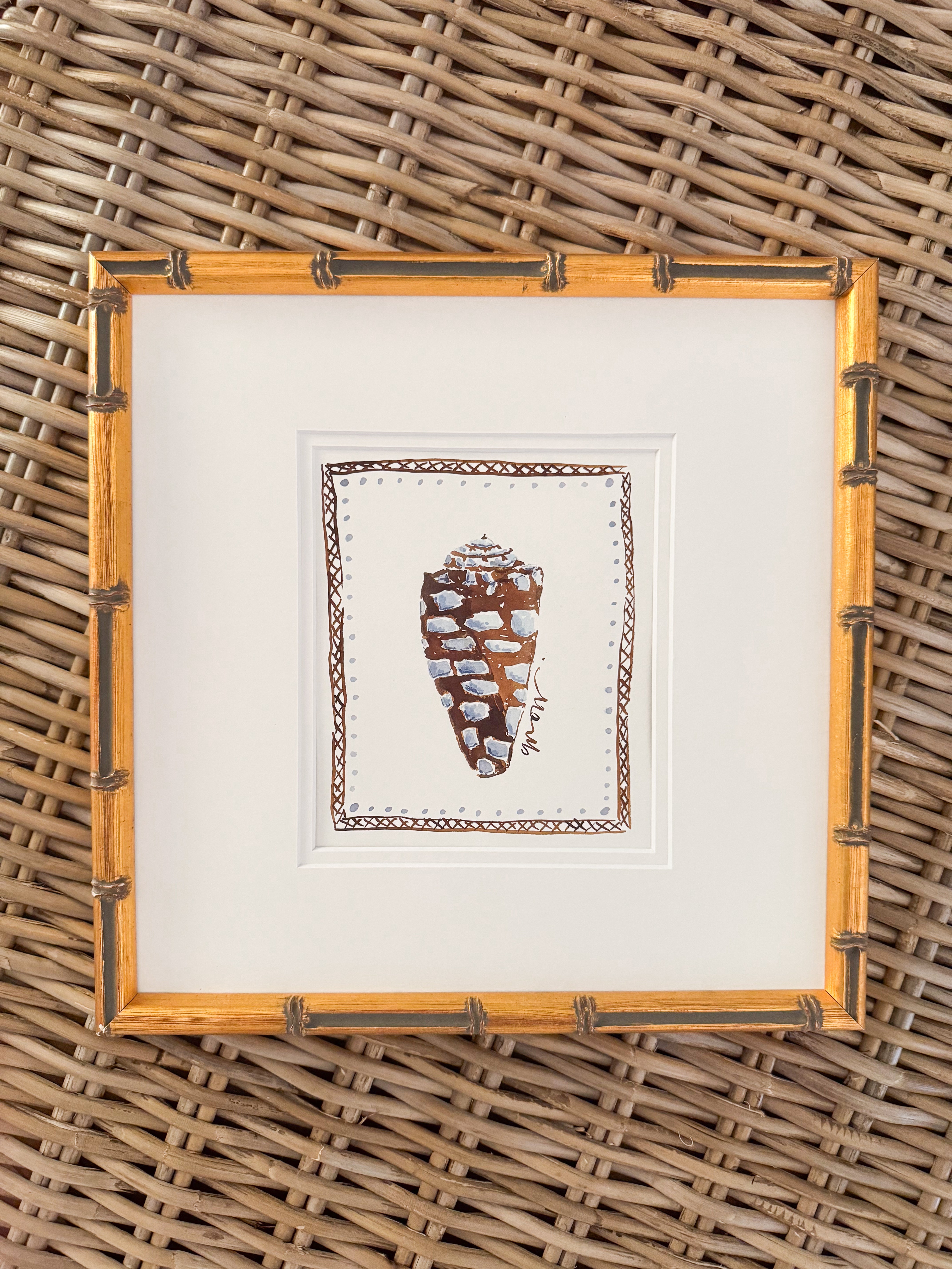 This original work by Camilla Moss is a seashell watercolor painting measuring approximately 13 x 13 on Arches watercolor paper painted in June 2024 as part of the By the Sea collection framed in a custom gold bamboo frame.
