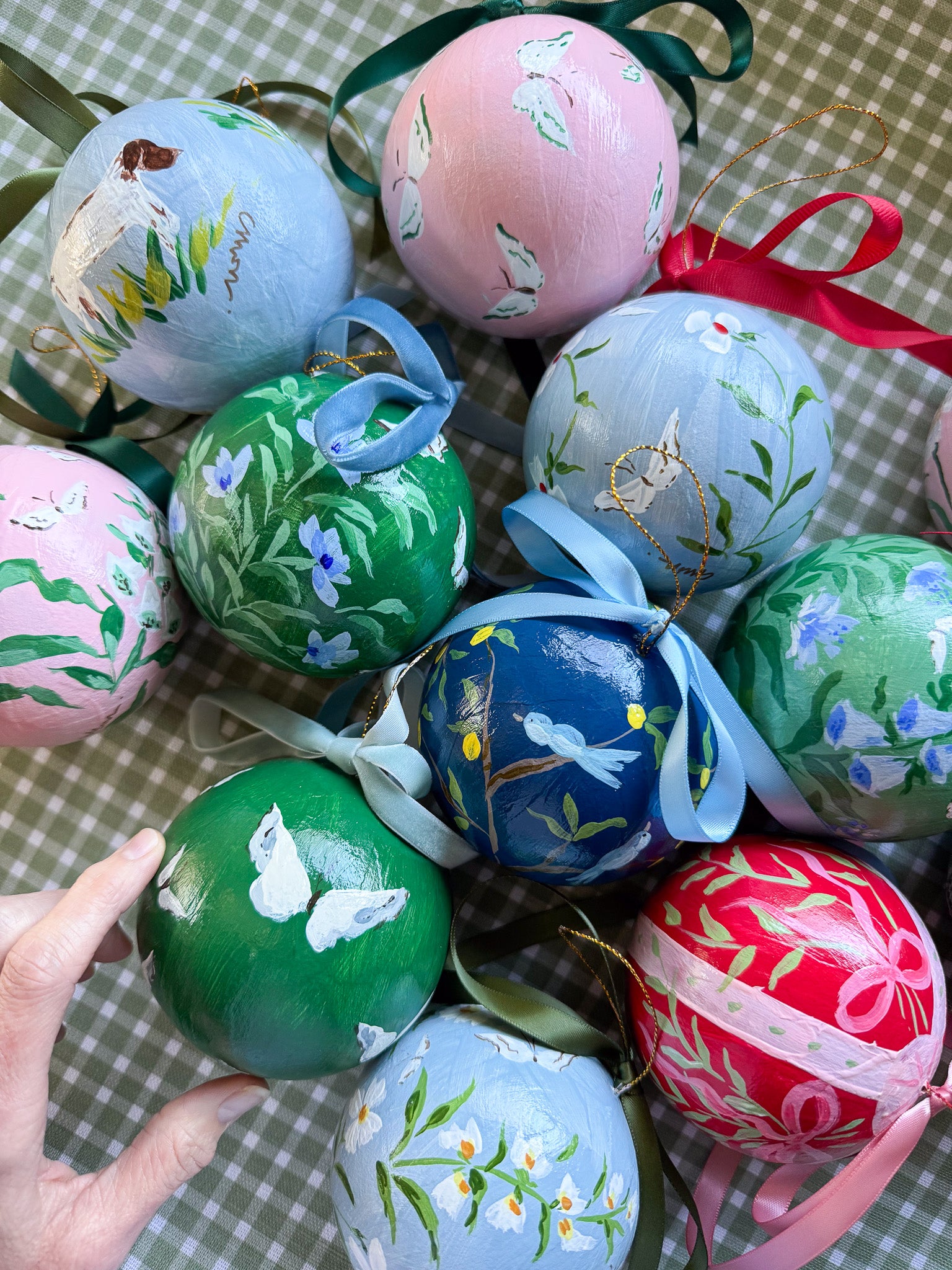 This hand-painted paper maché ornament is created with acrylic paint and sealed with an archival varnish for lasting beauty. Each piece is finished with a coordinating ribbon and measures approximately 3.5" in diameter.