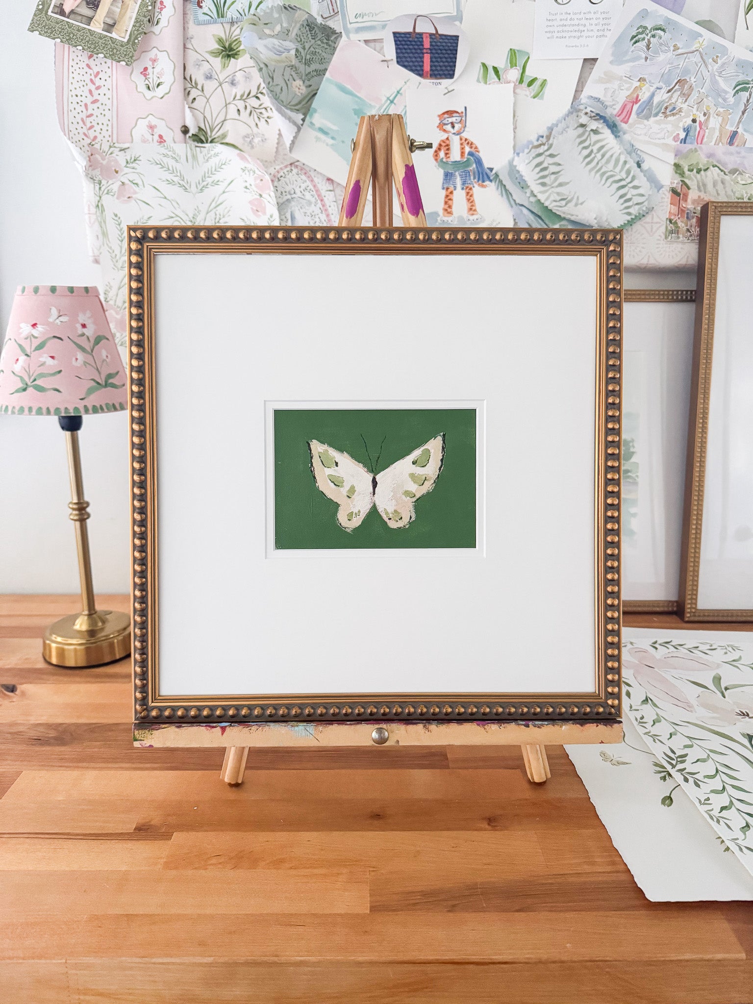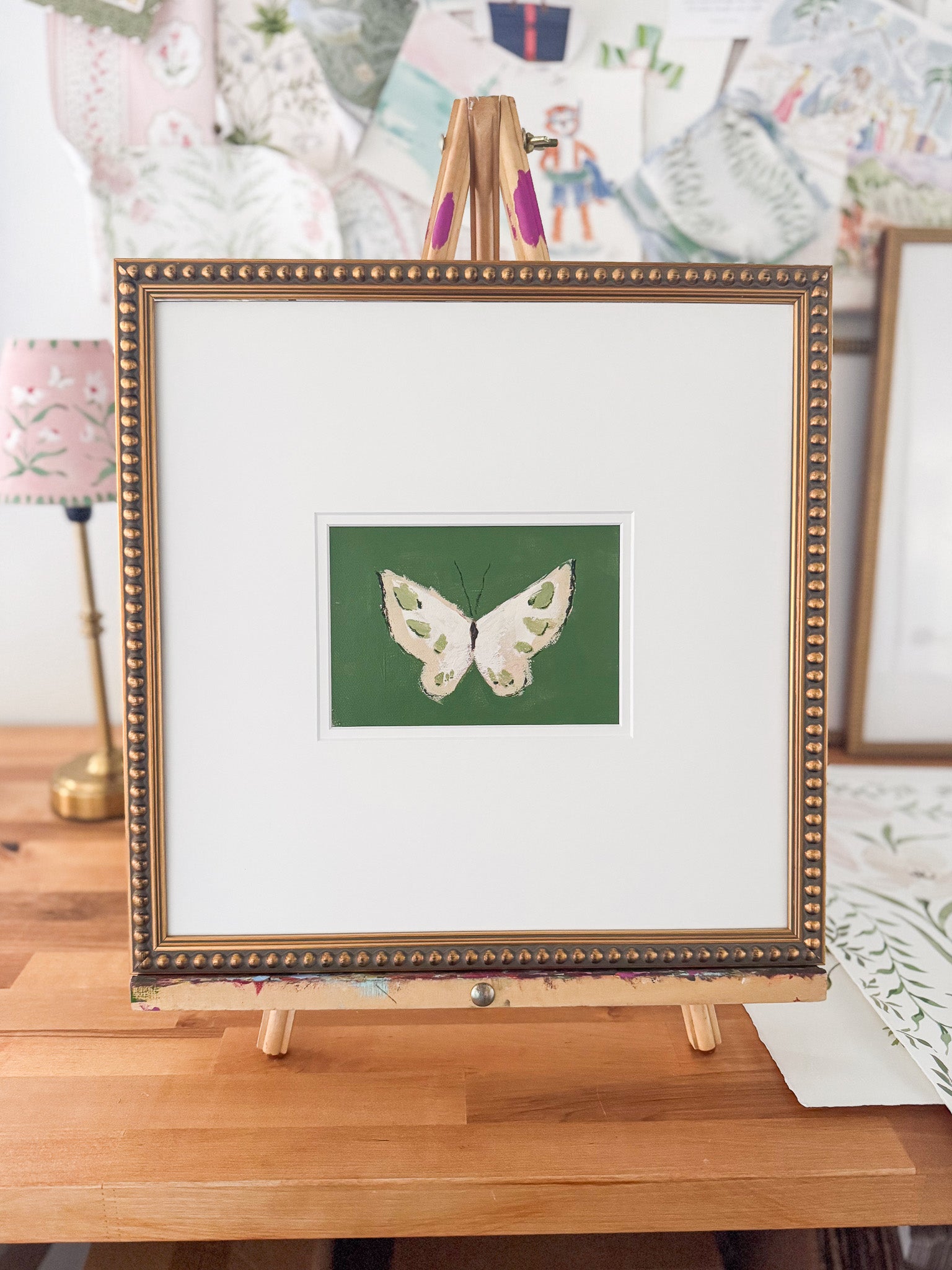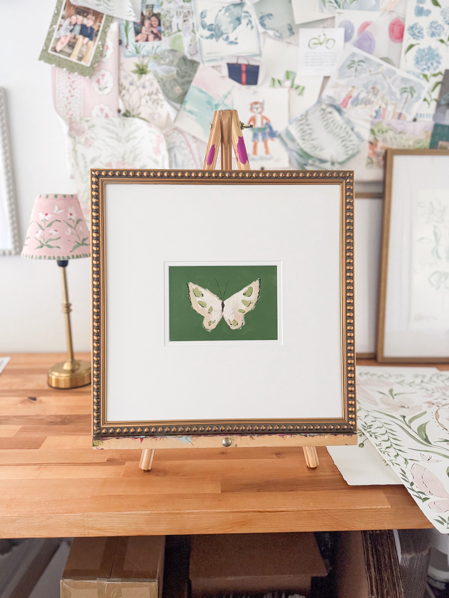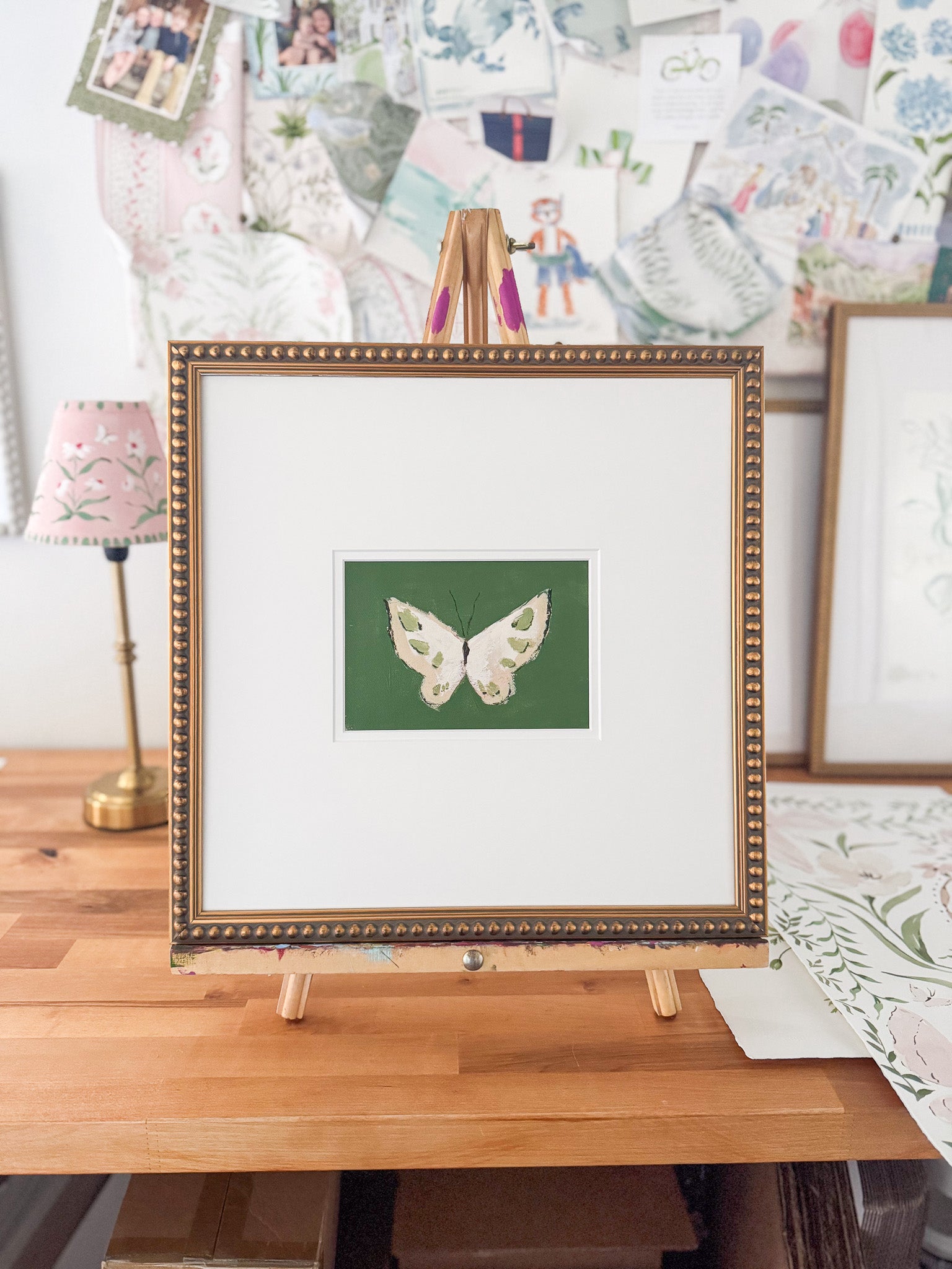 This original work by Camilla Moss is an acrylic butterfly painting on canvas matted and framed in a custom gold frame, ready for hanging. Frame measures approximately 15.5" x 15.5".