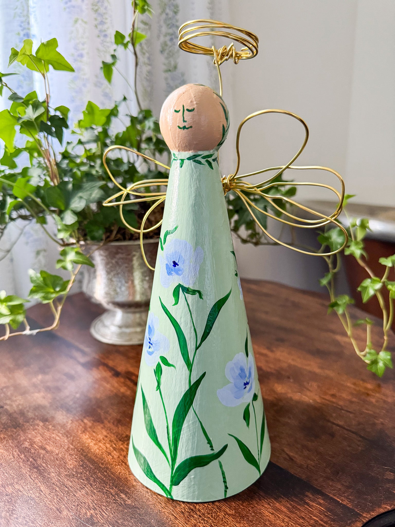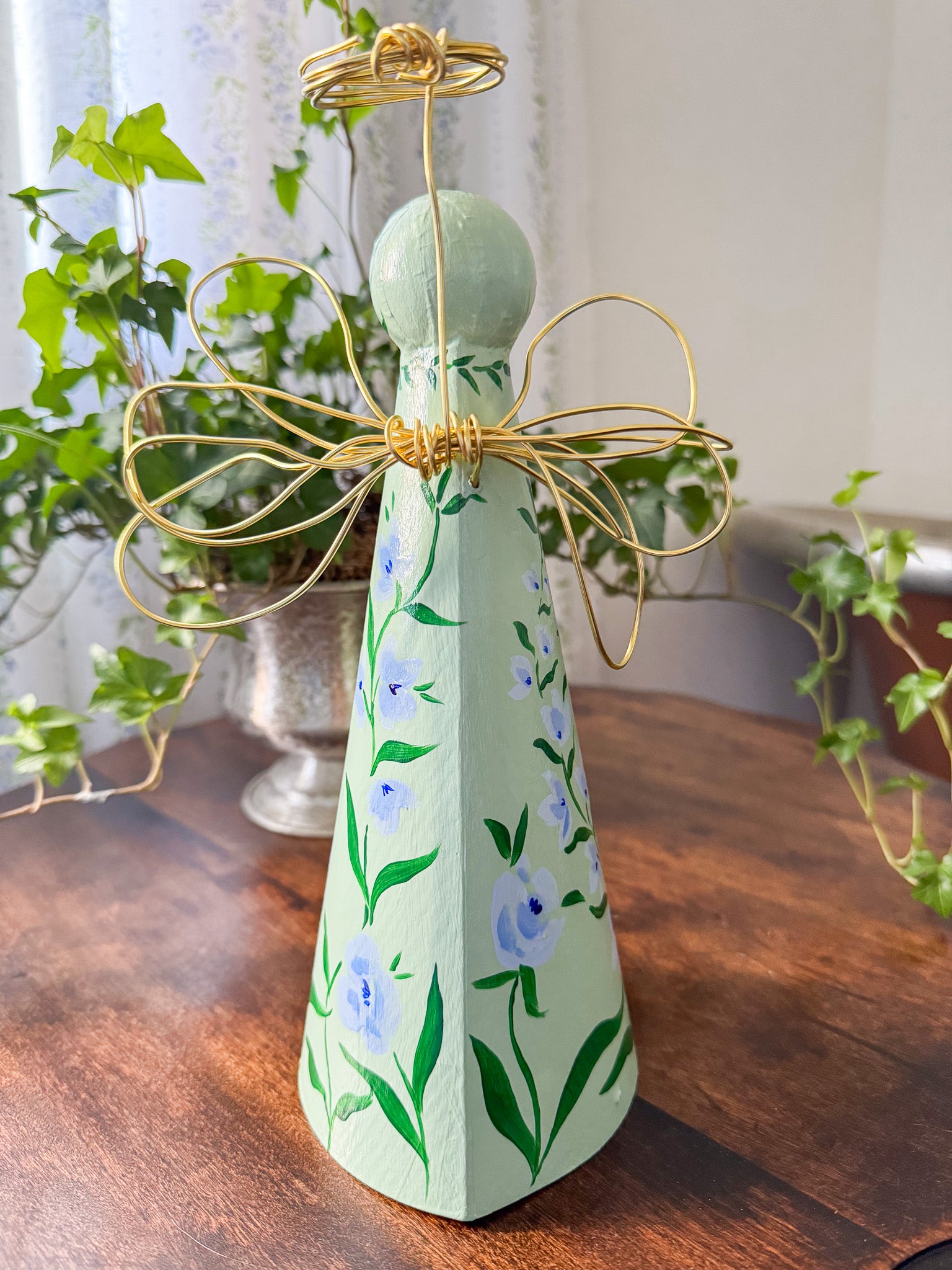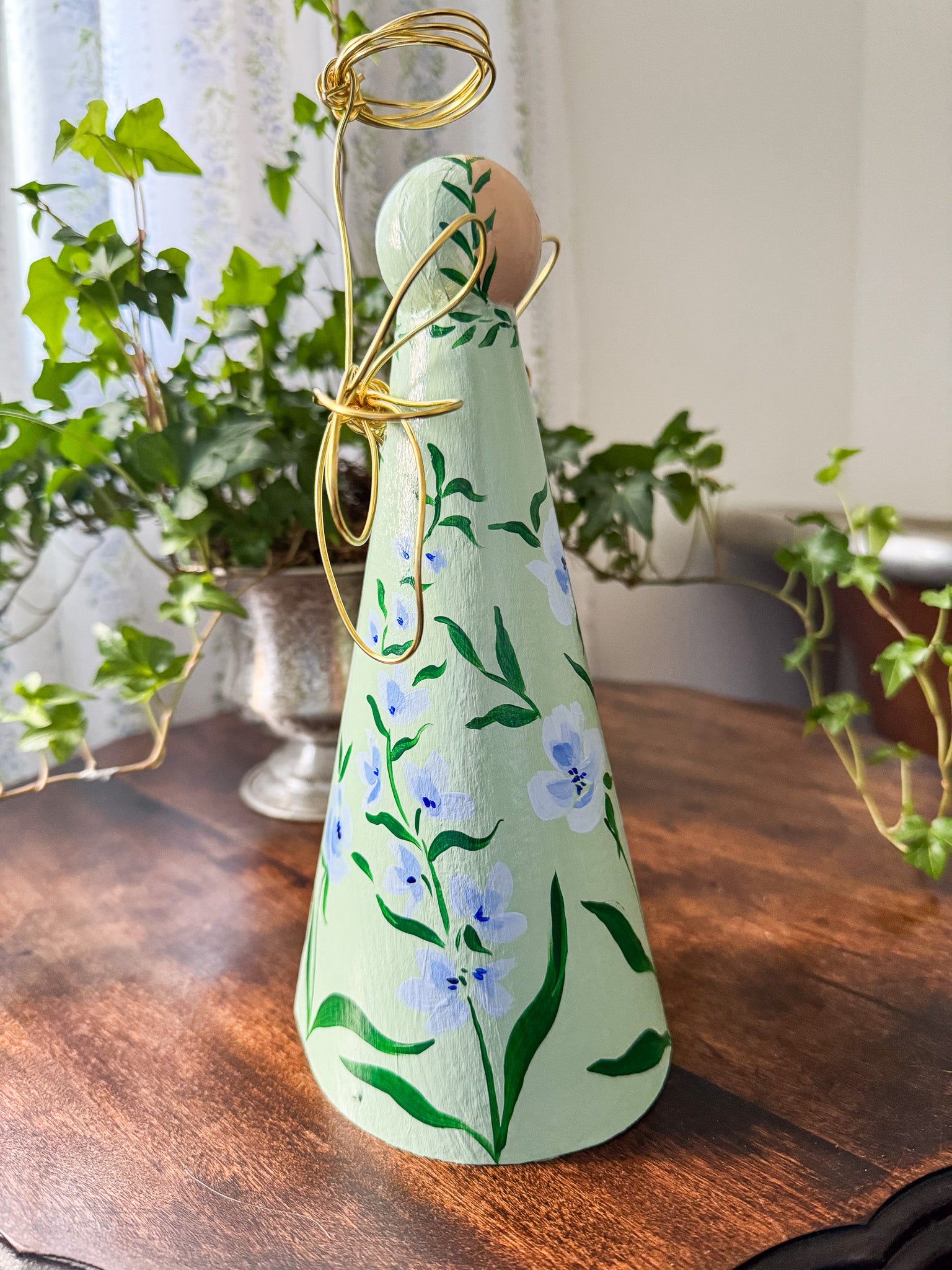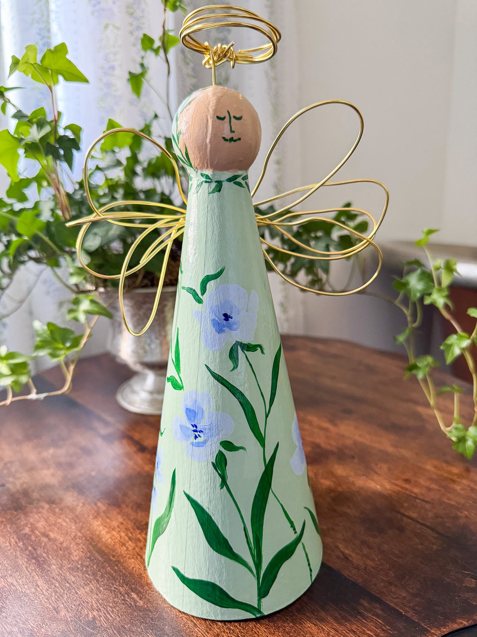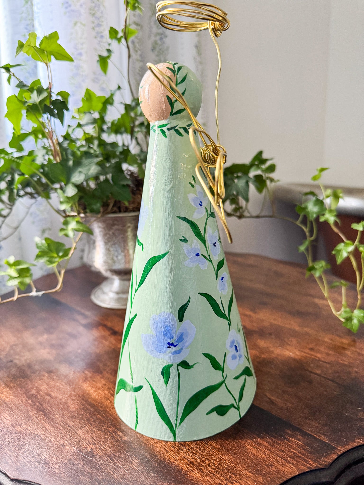 Large angel bauble hand painted by Camilla Moss in 2024. From table top to tree top, she has the perfect touch of whimsy for your holiday! Measures approximately 12" L x 5" W.