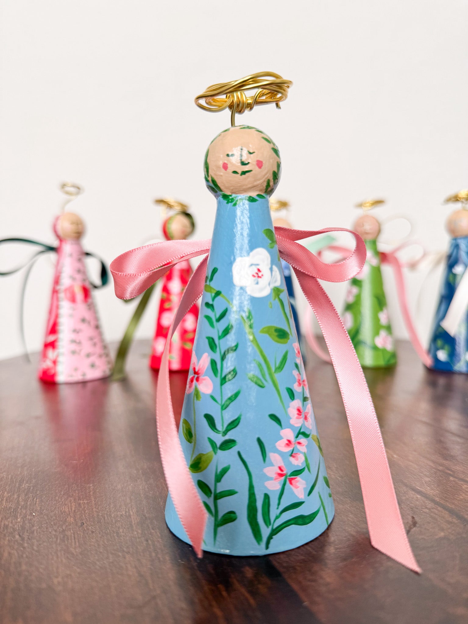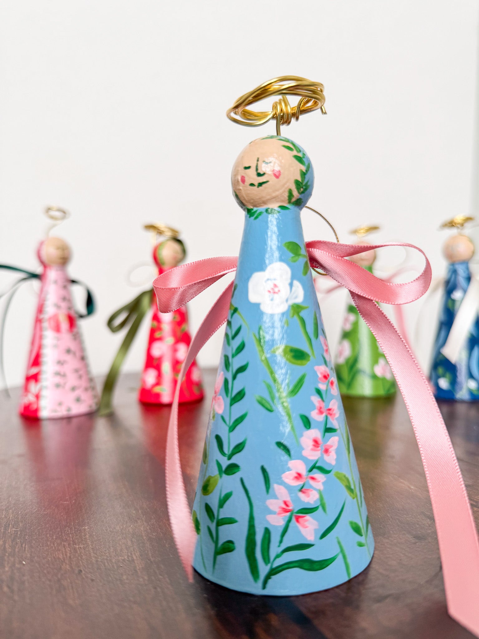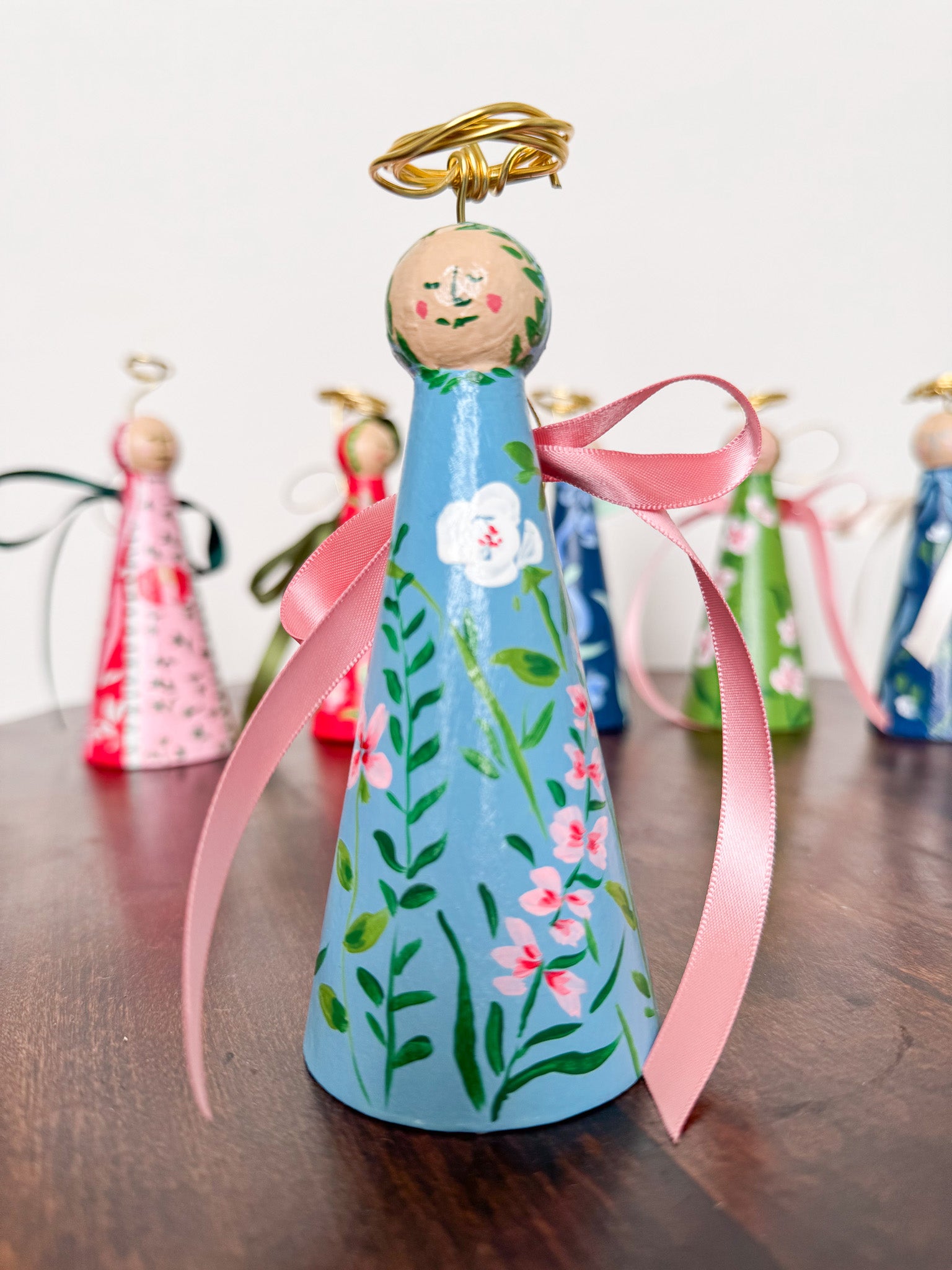 Papier mache angel ornament painted with acrylic paint and finished with an archival varnish. Measures approximately 5.5" tall.