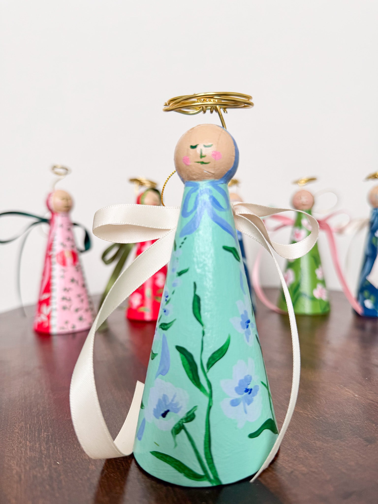 Papier mache angel ornament painted with acrylic paint and finished with an archival varnish. Measures approximately 5.5" tall.