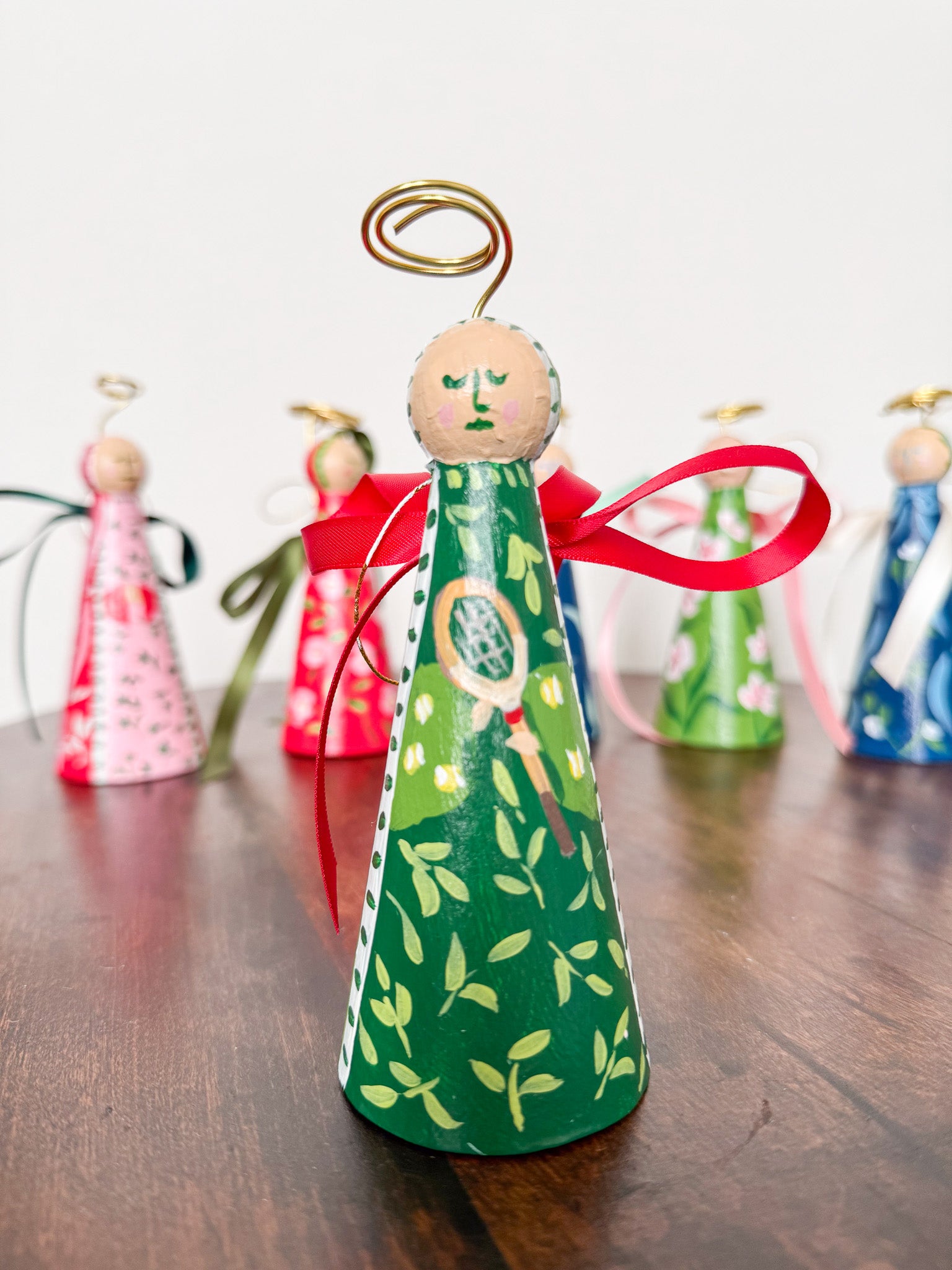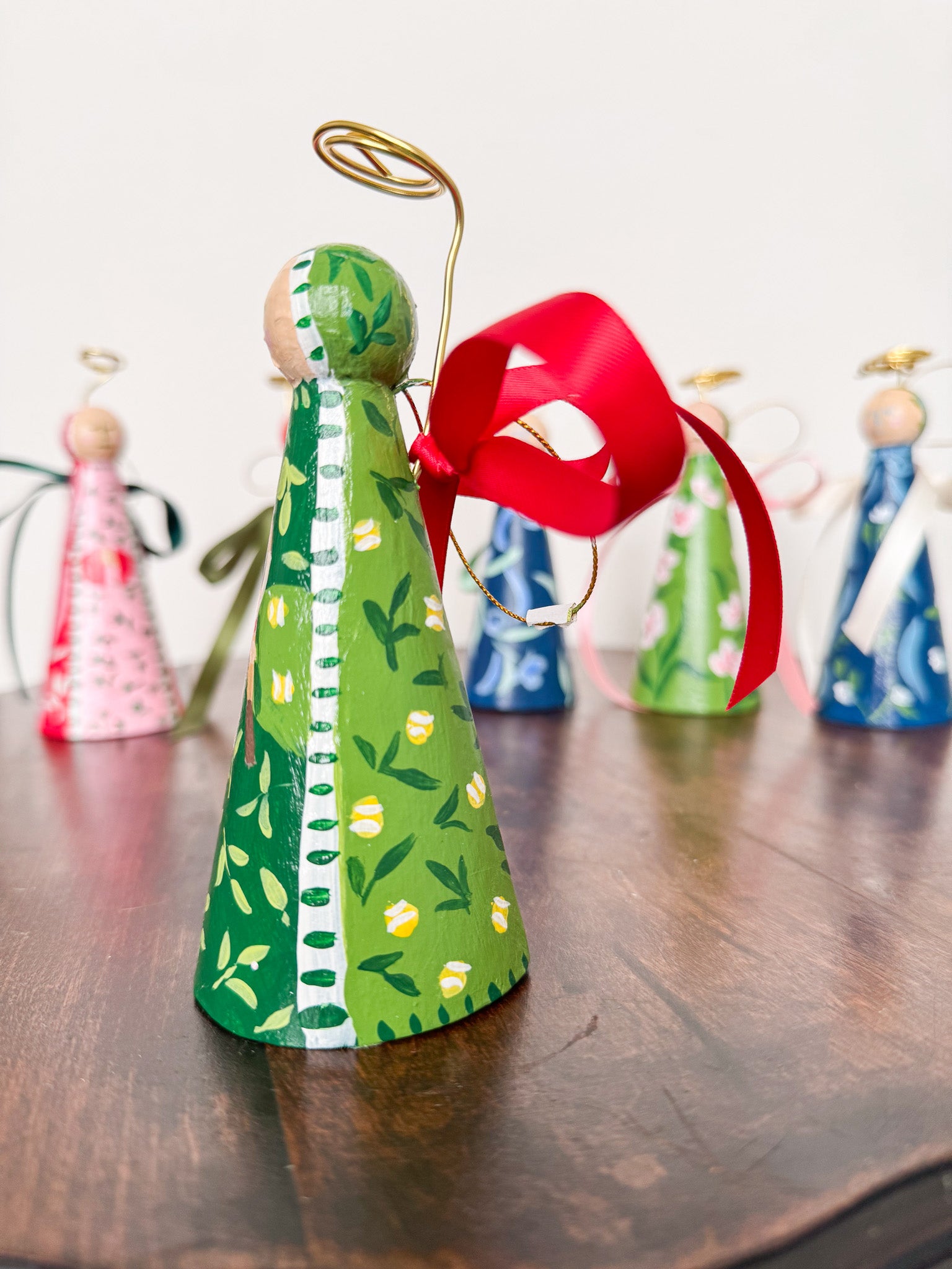 Papier mache angel ornament painted with acrylic paint and finished with an archival varnish. Measures approximately 5.5" tall.