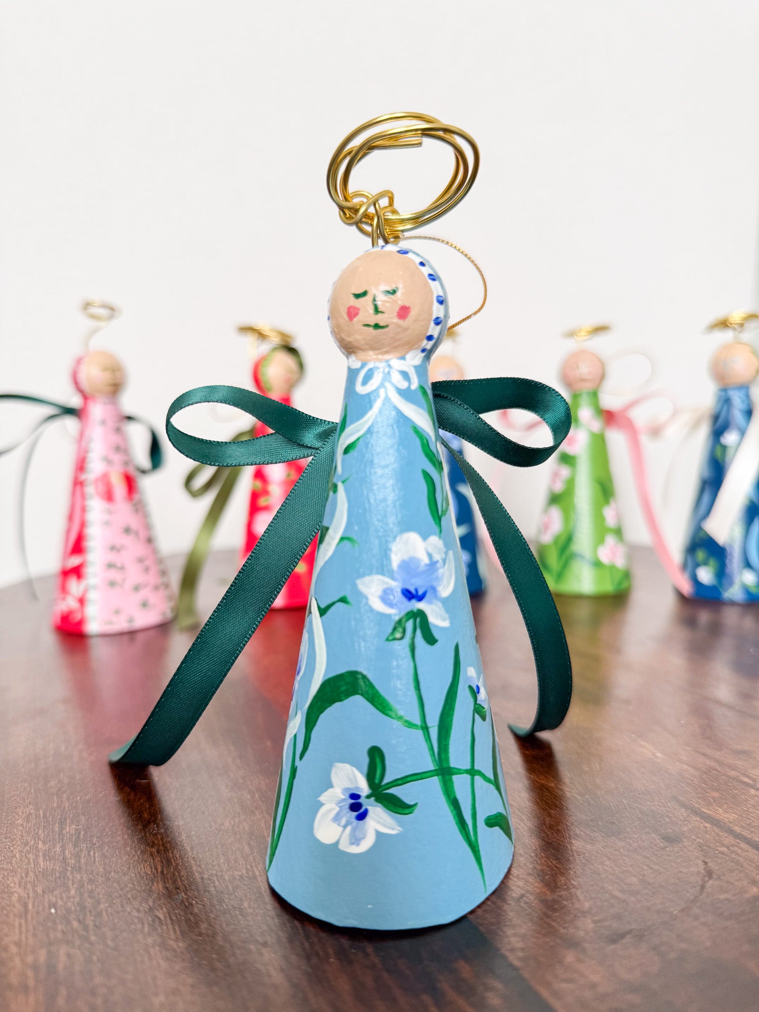 Papier mache angel ornament painted with acrylic paint and finished with an archival varnish. Measures approximately 5.5" tall.
