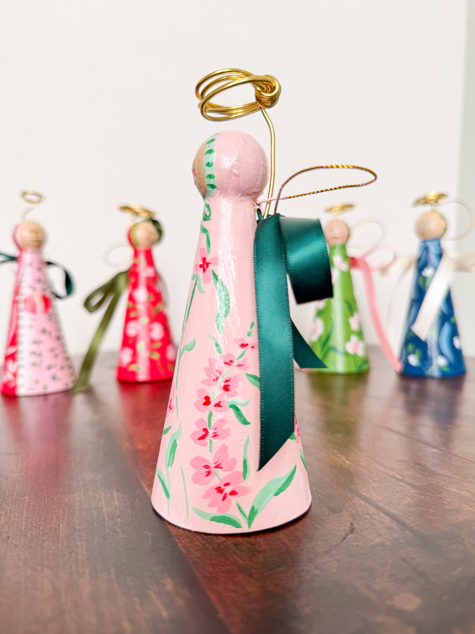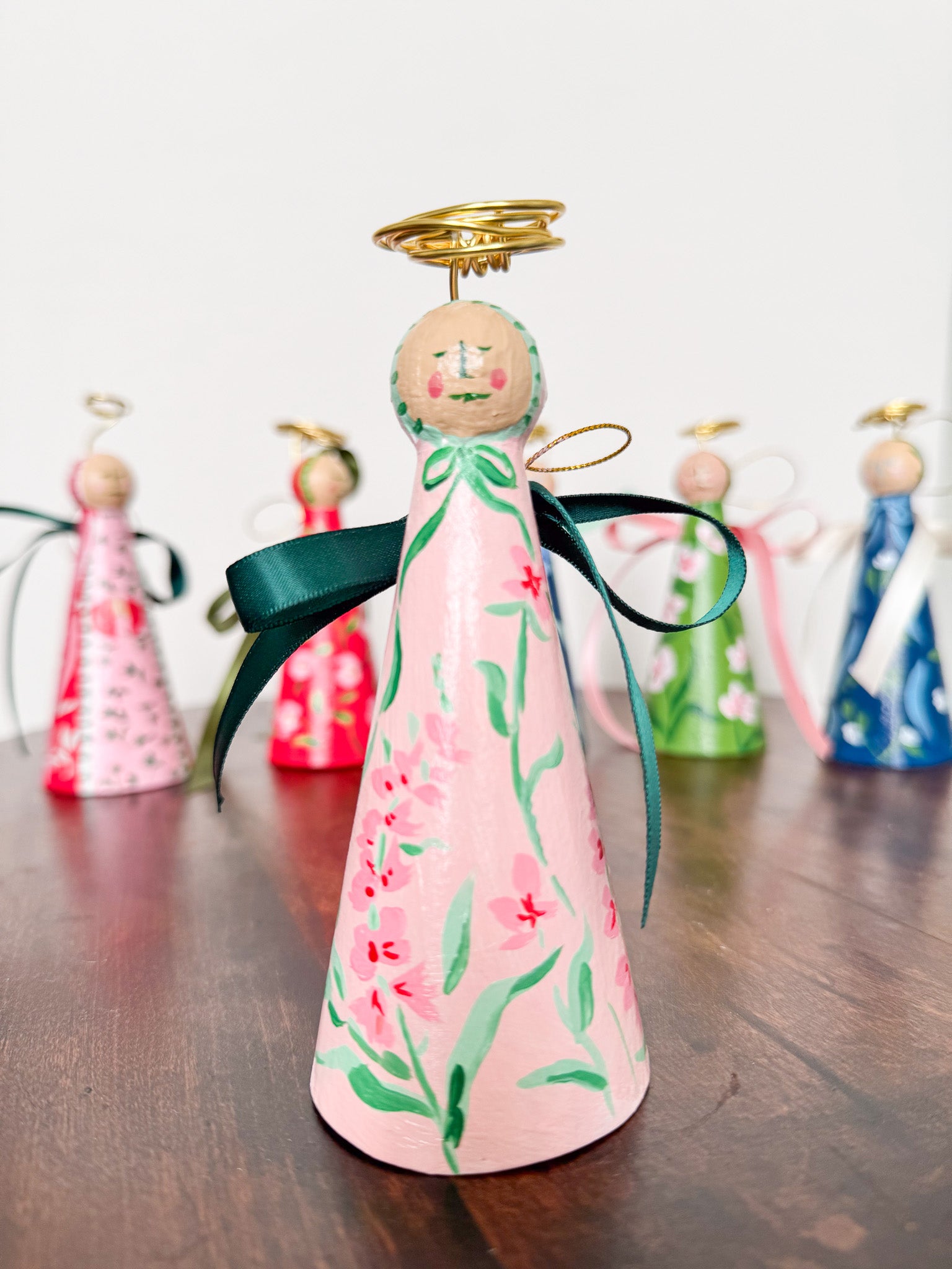 Papier mache angel ornament painted with acrylic paint and finished with an archival varnish. Measures approximately 5.5" tall.