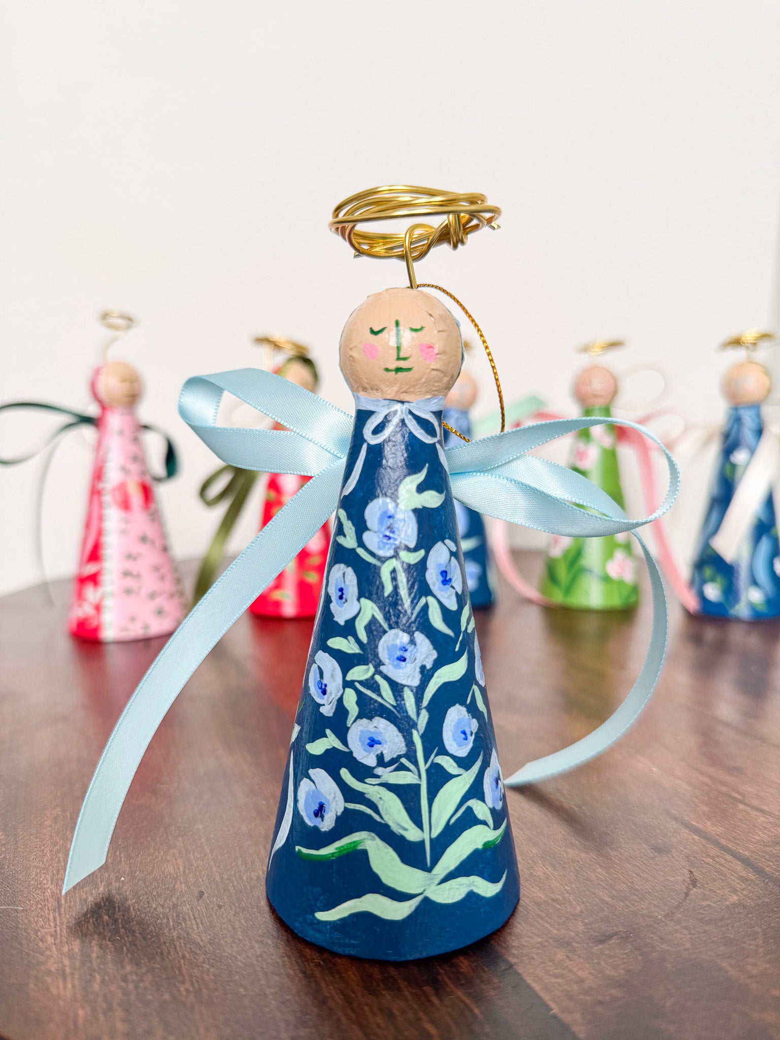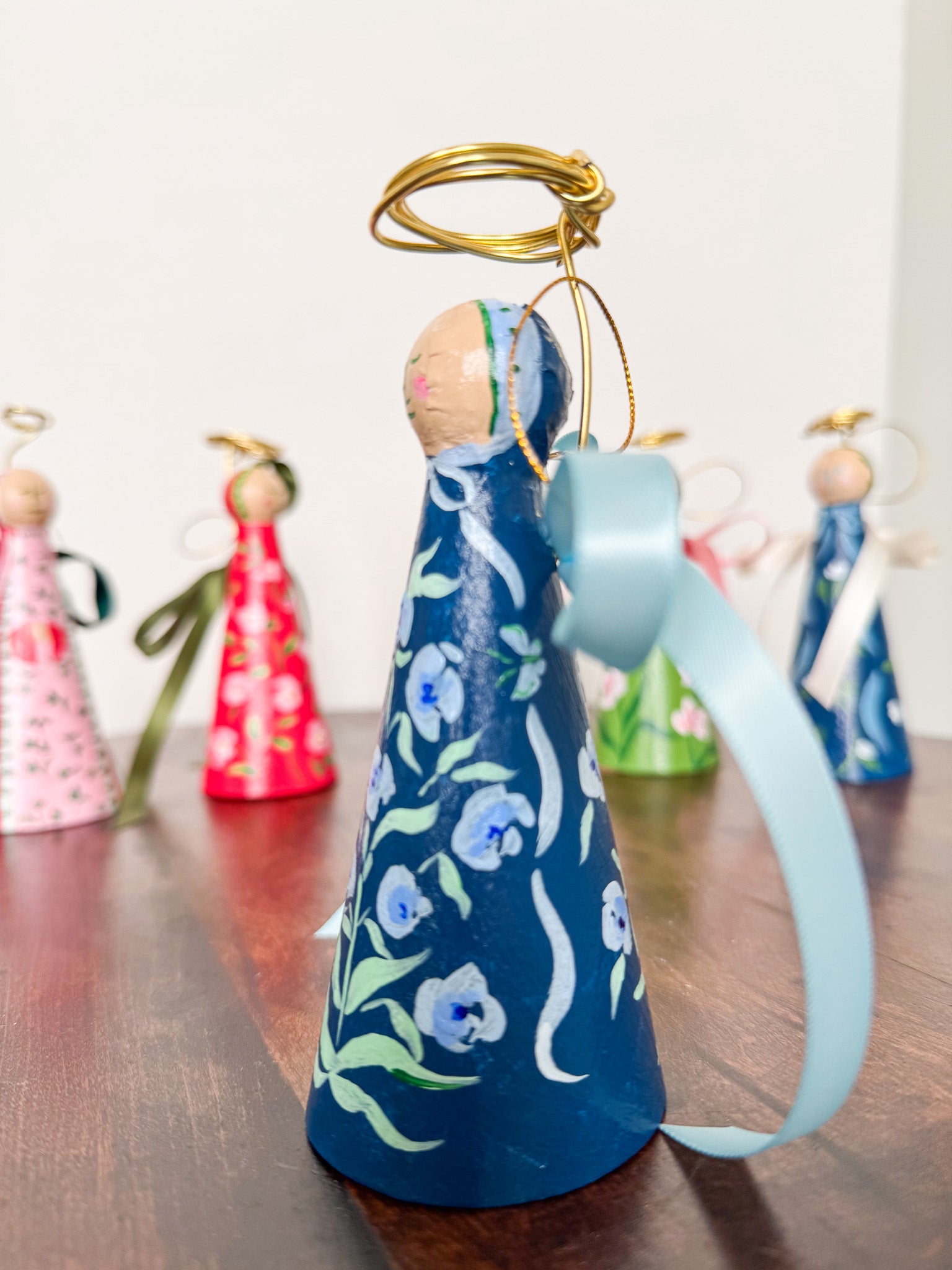 Papier mache angel ornament painted with acrylic paint and finished with an archival varnish. Measures approximately 5.5" tall.