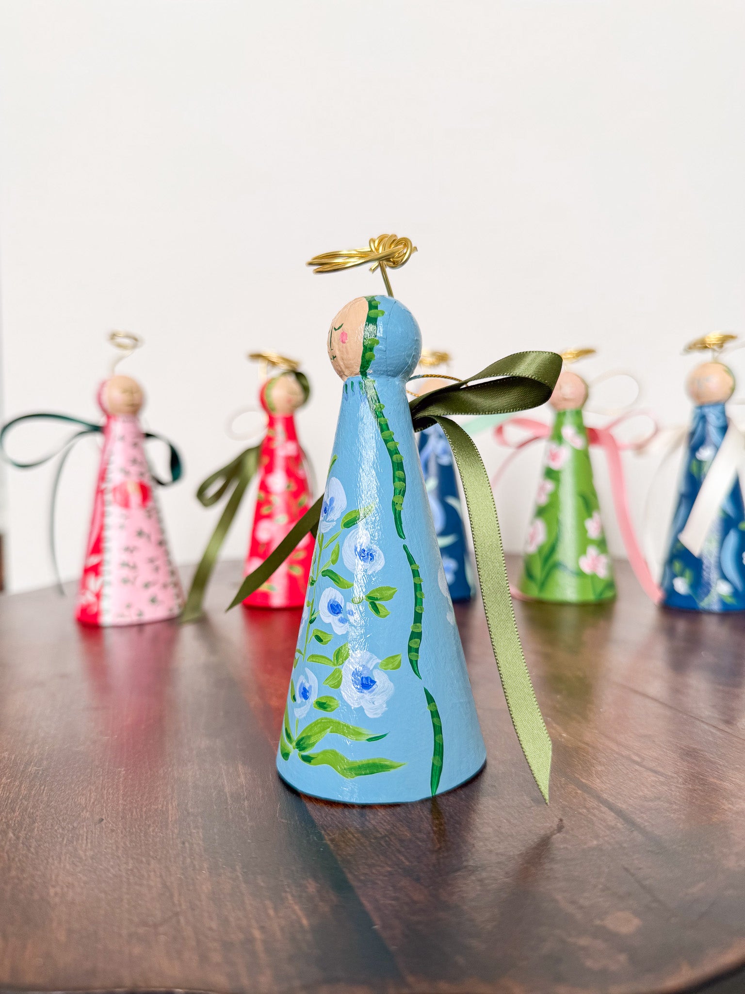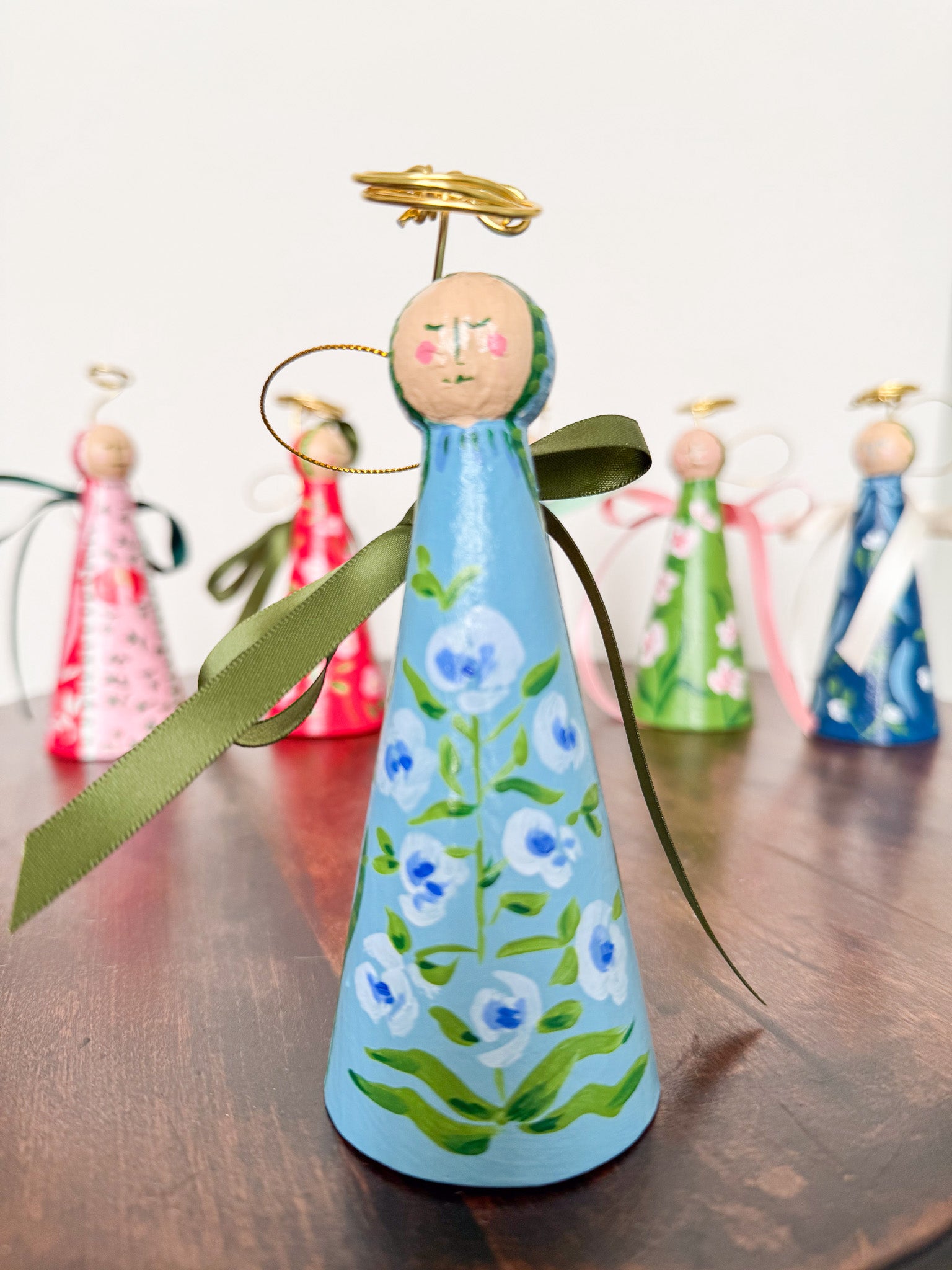 Papier mache angel ornament painted with acrylic paint and finished with an archival varnish. Measures approximately 5.5" tall.