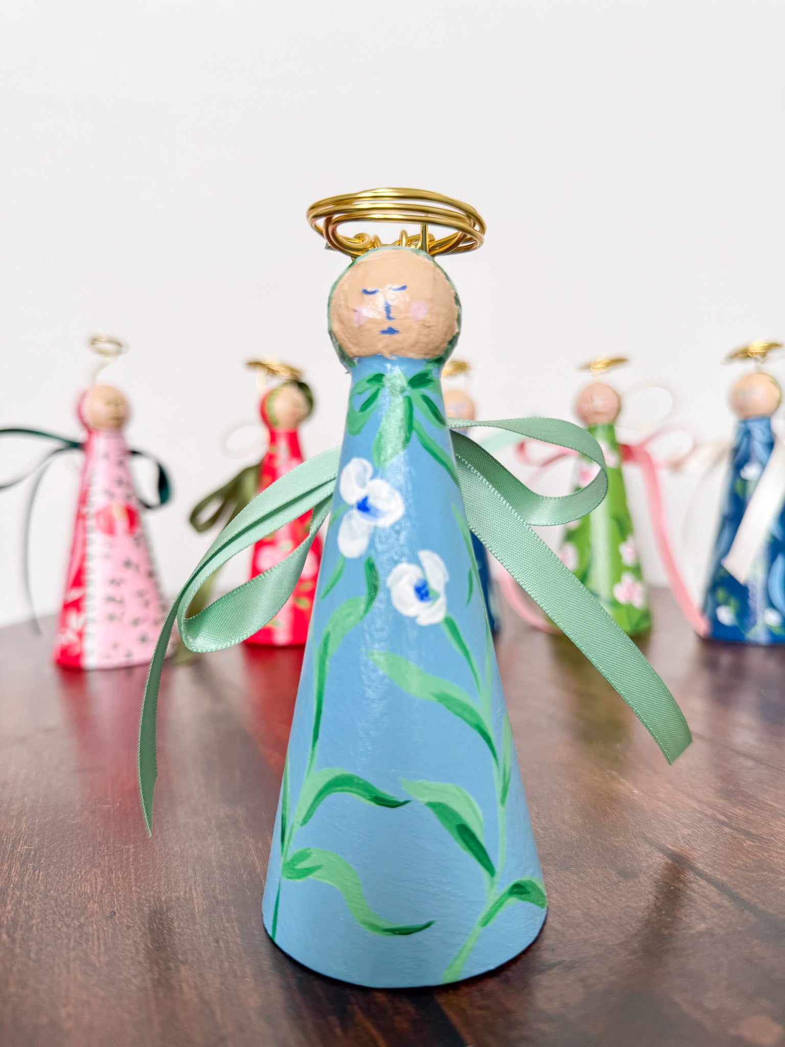 Papier mache angel ornament painted with acrylic paint and finished with an archival varnish. Measures approximately 5.5" tall.