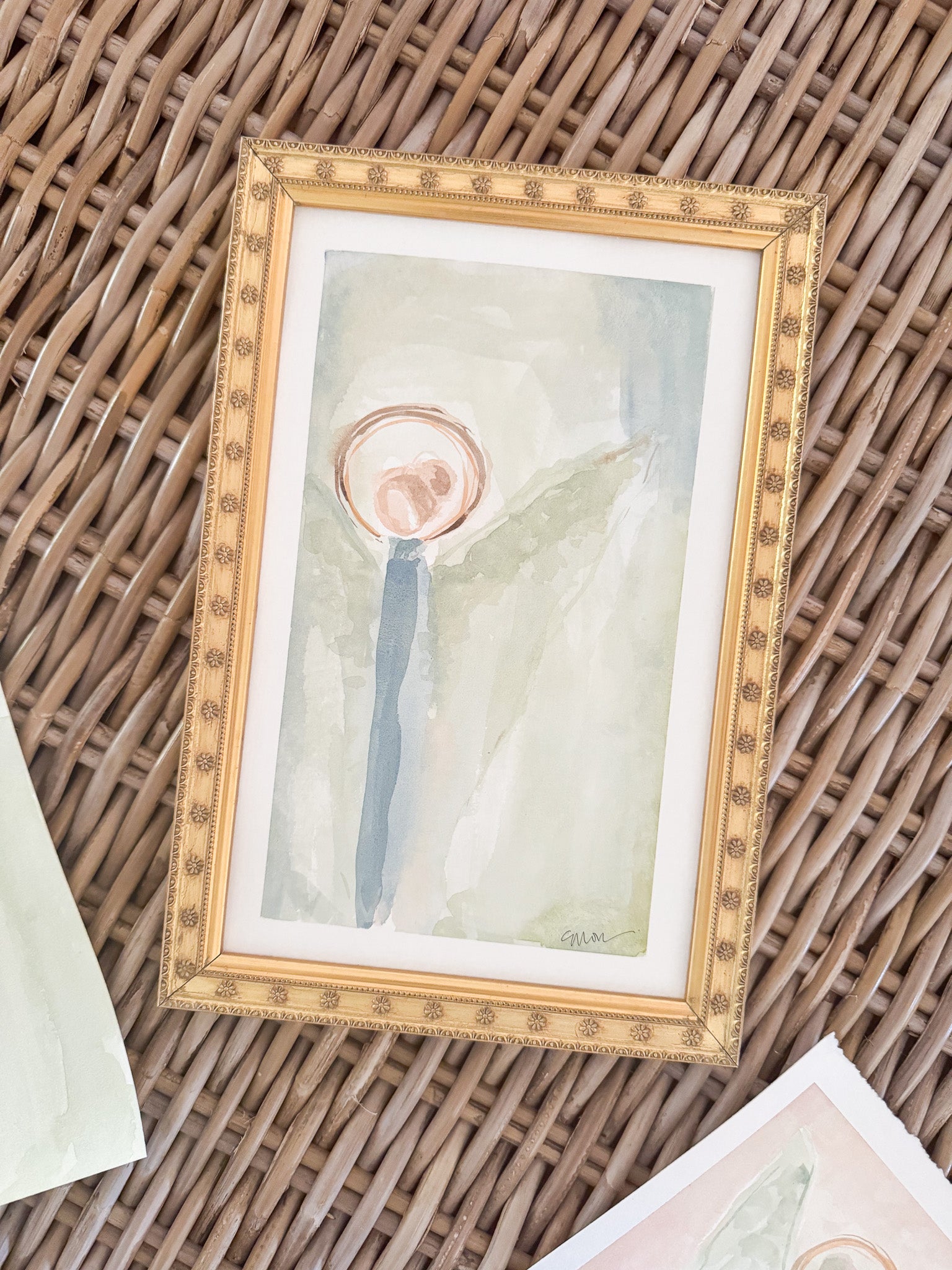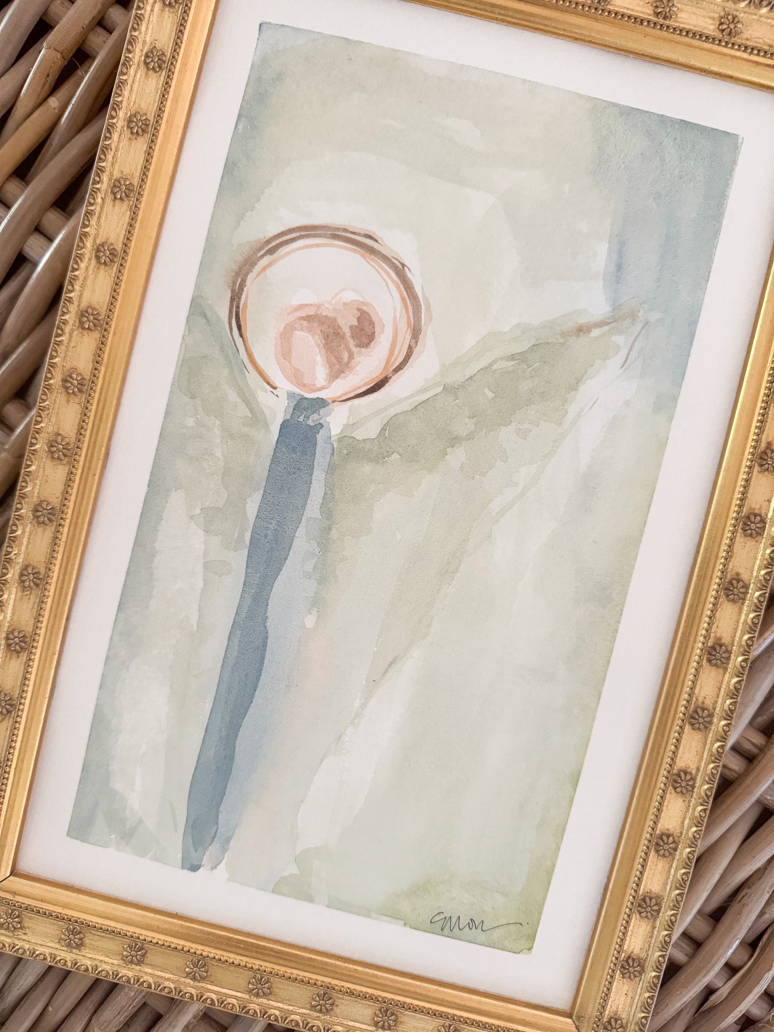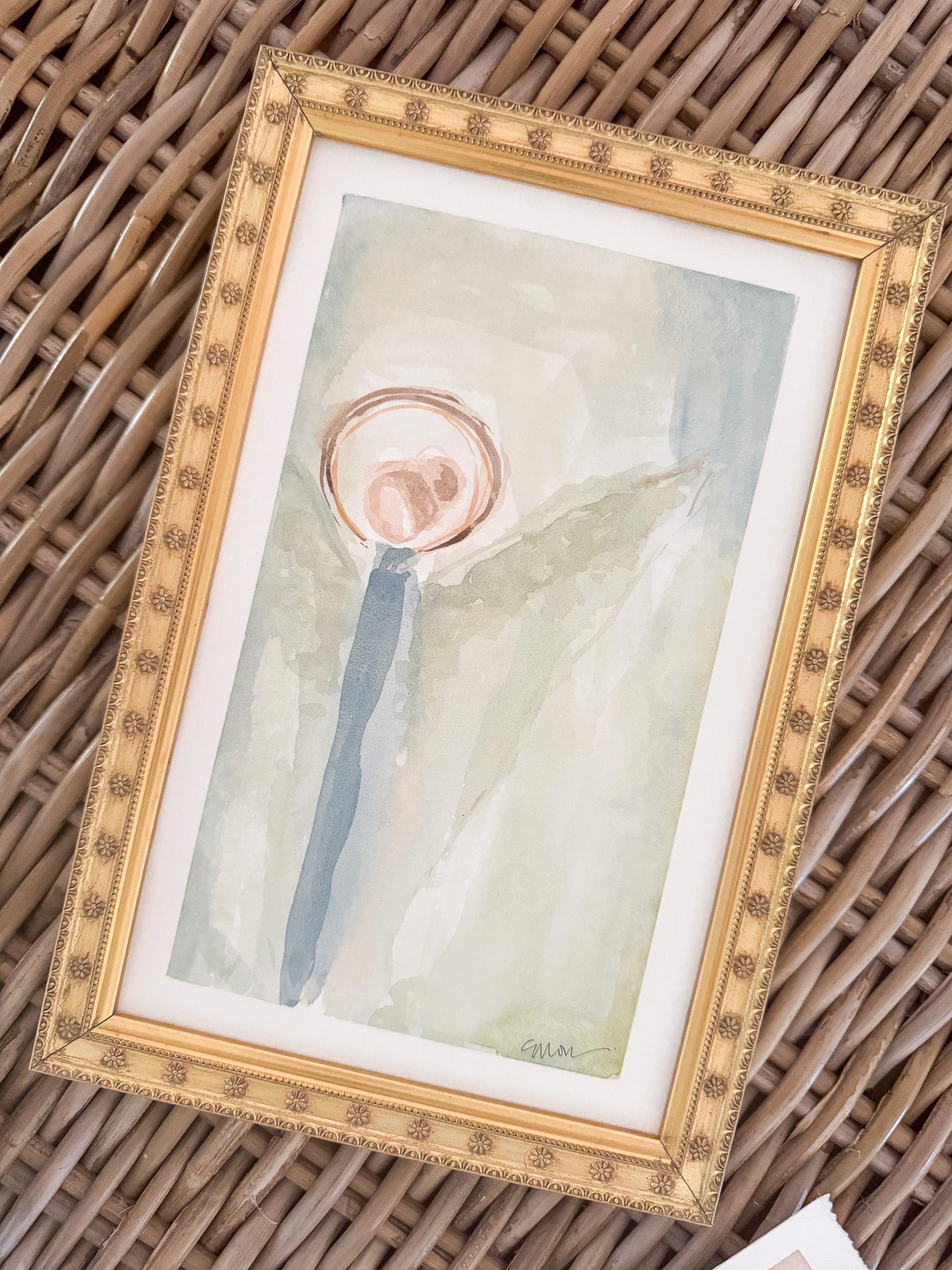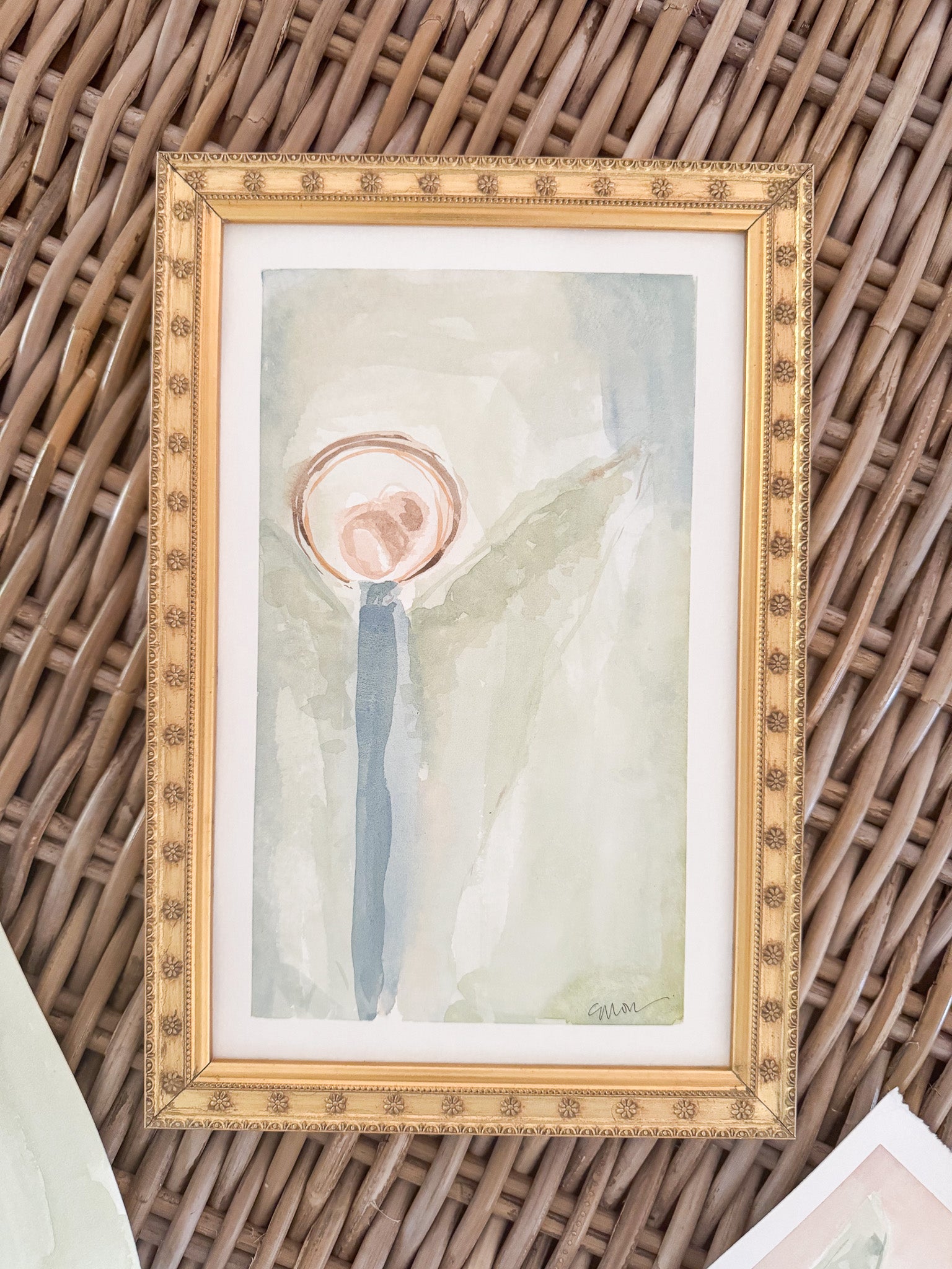 This original work by Camilla Moss is a watercolor angel on fine art watercolor paper, measuring 7 x 11, unframed. Any frame shown is not included.
