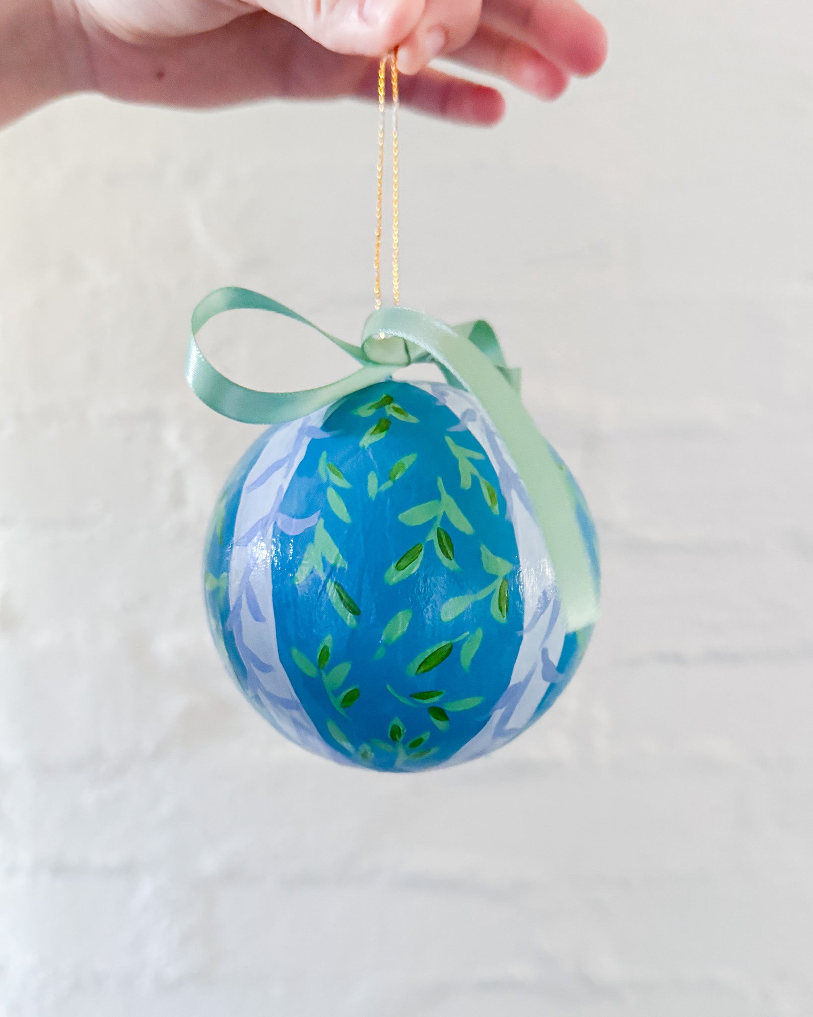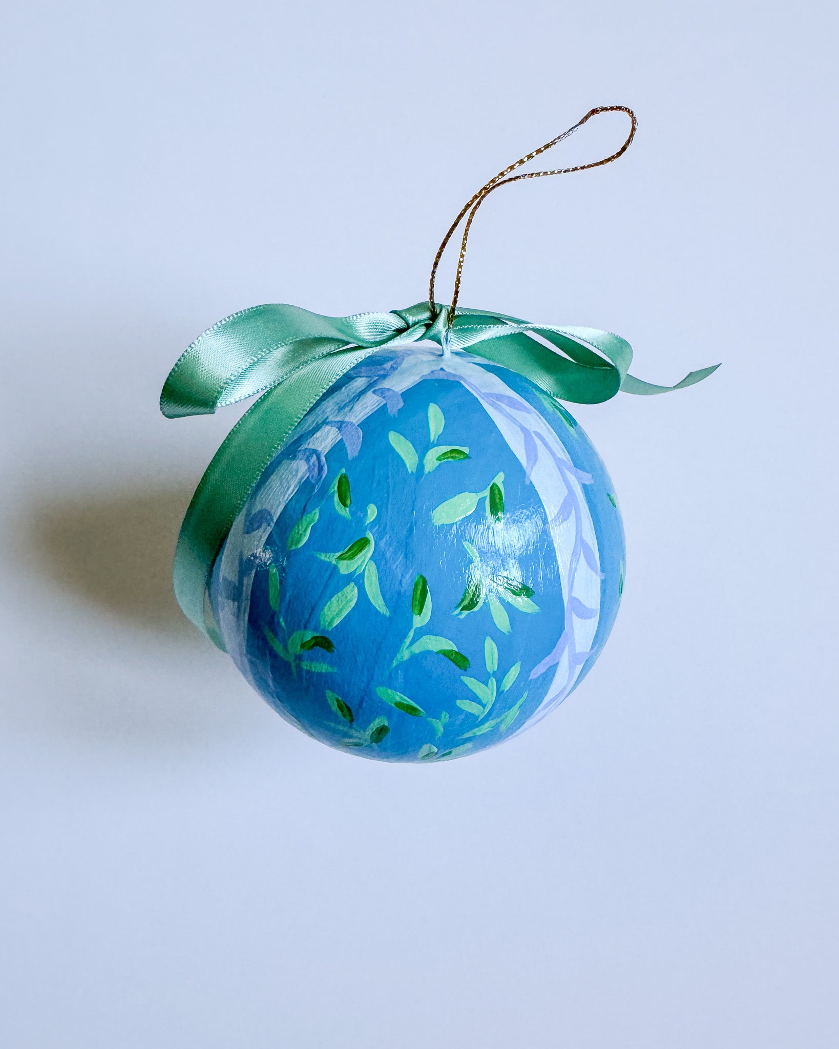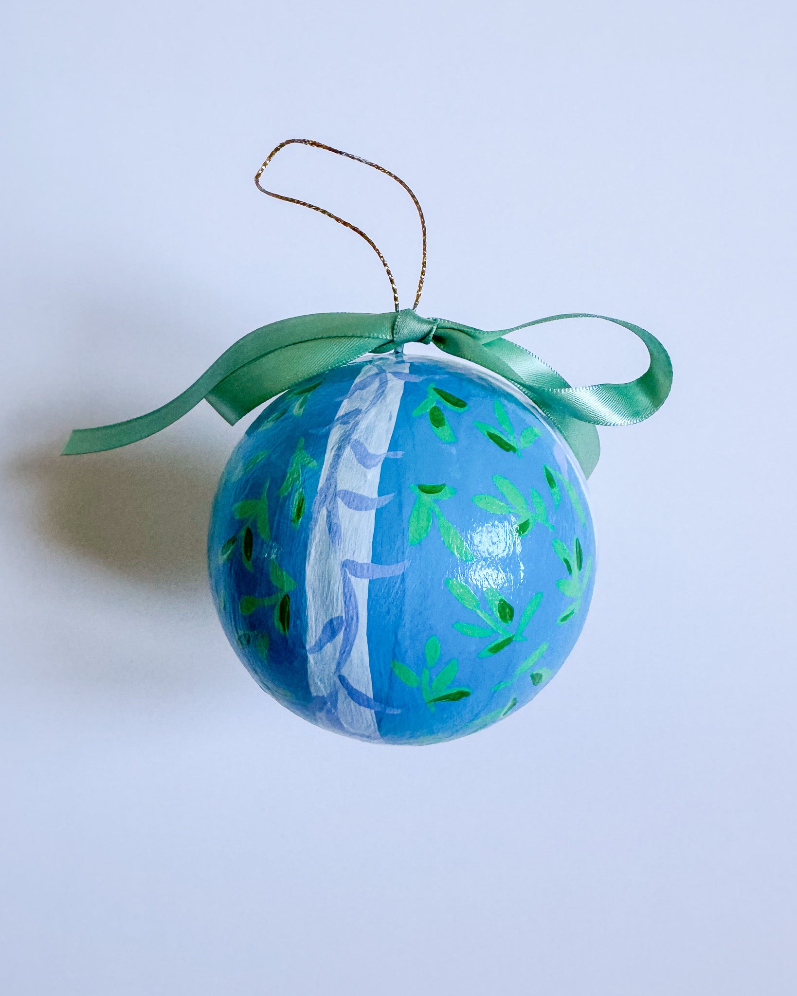 Papier mache ball ornament painted with acrylic paint and finished with an archival varnish.