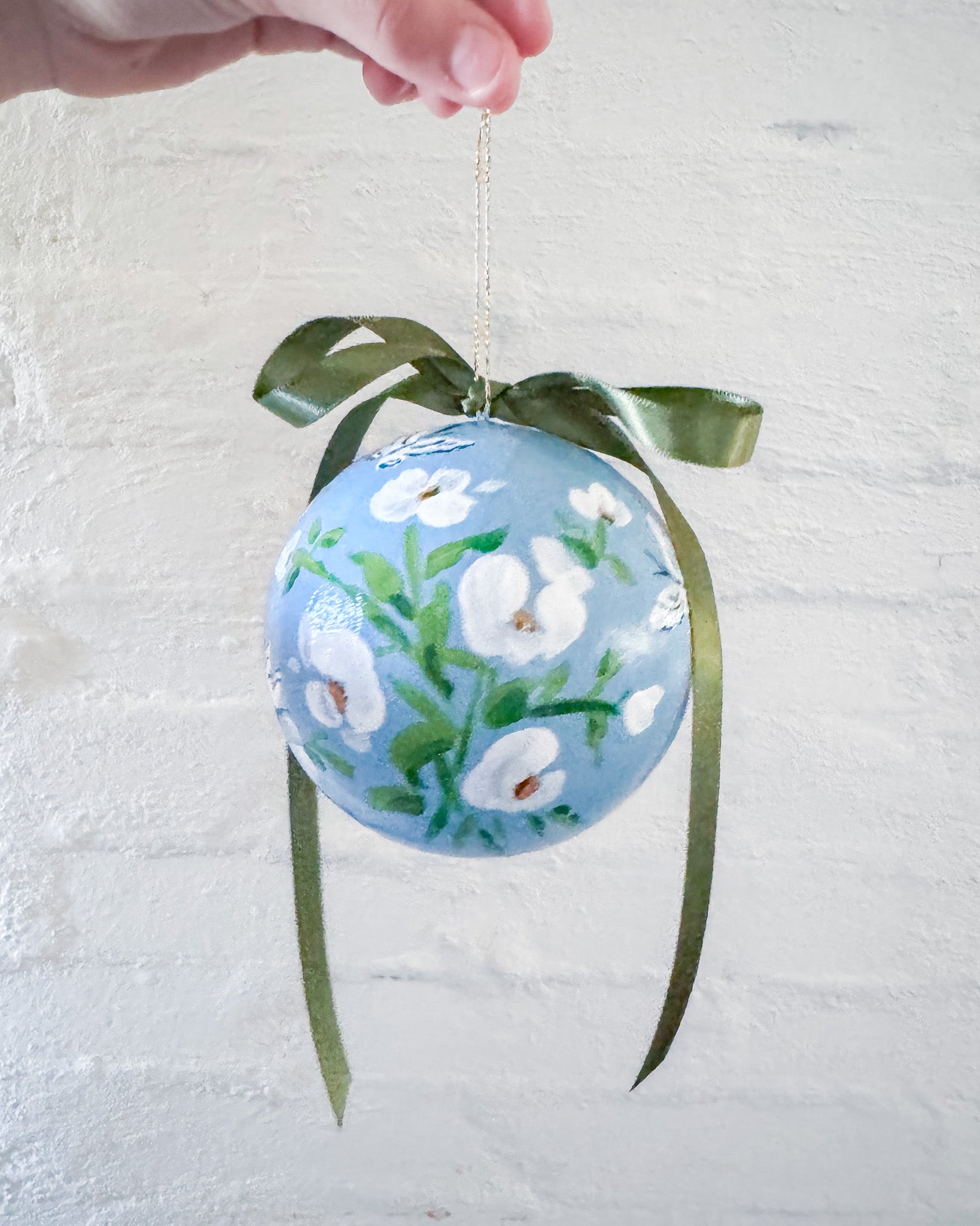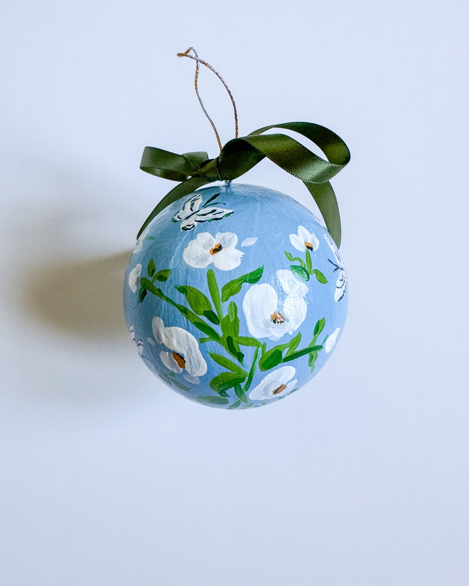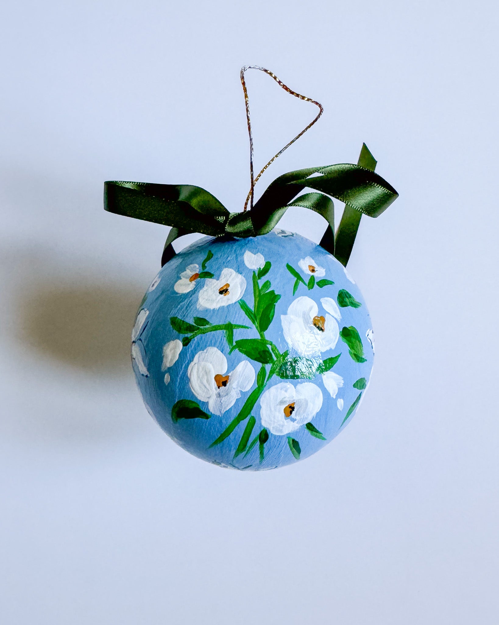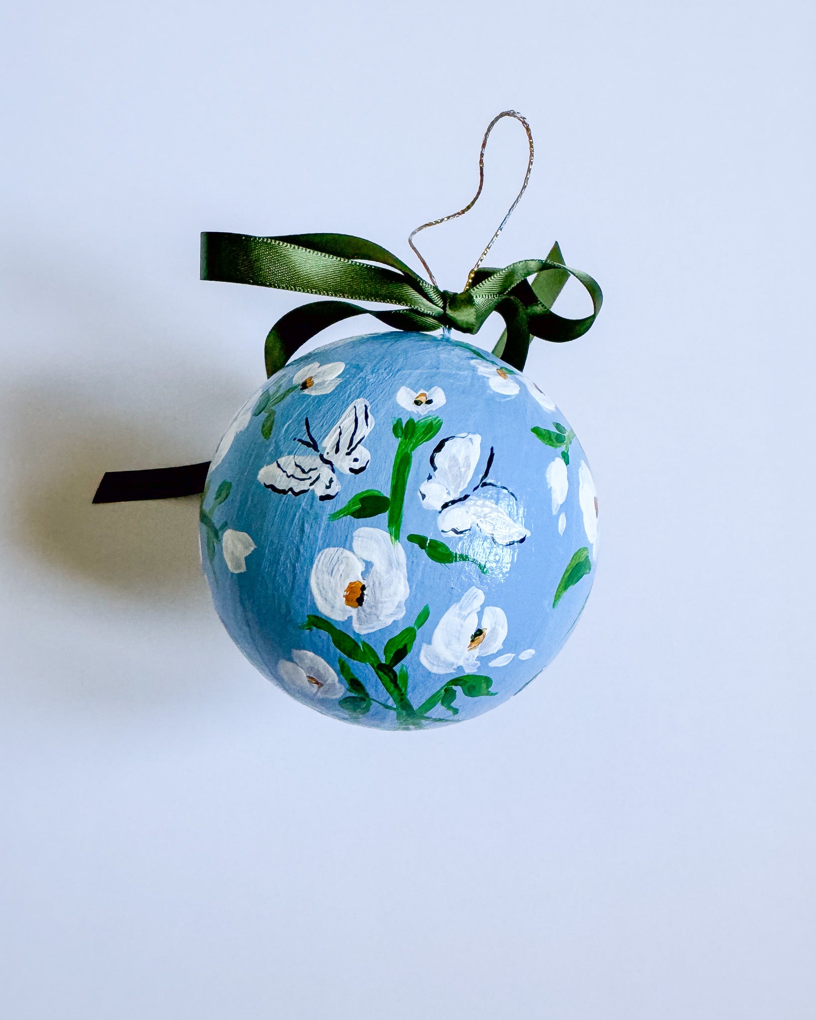 Papier mache ball ornament painted with acrylic paint and finished with an archival varnish.