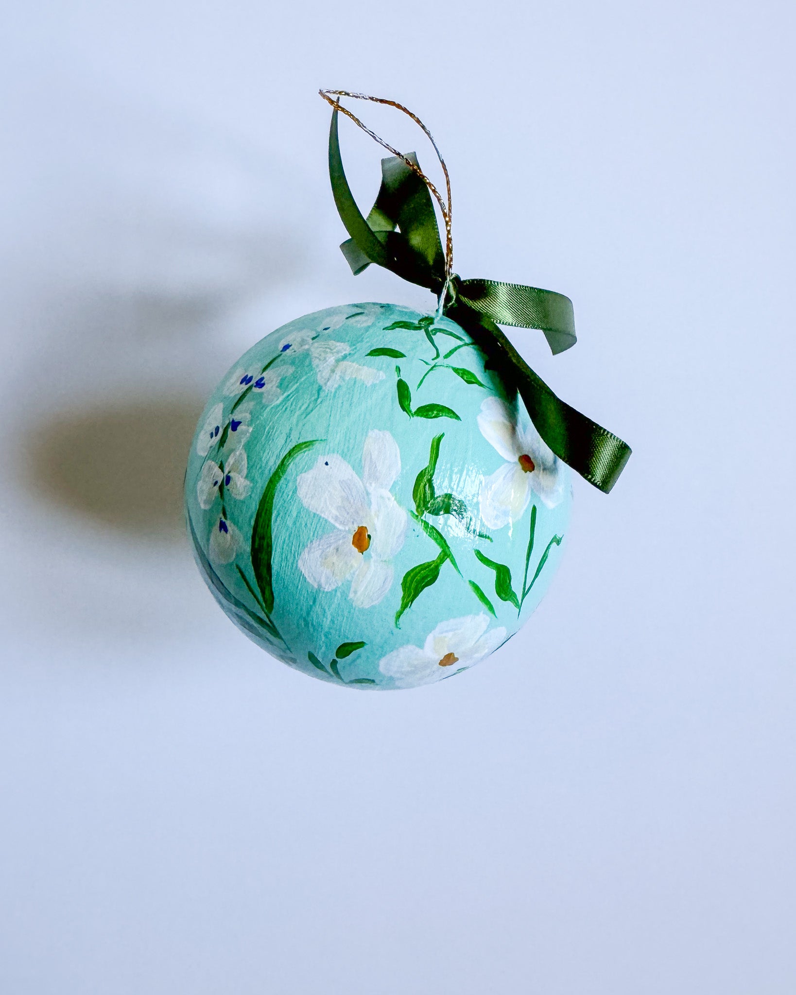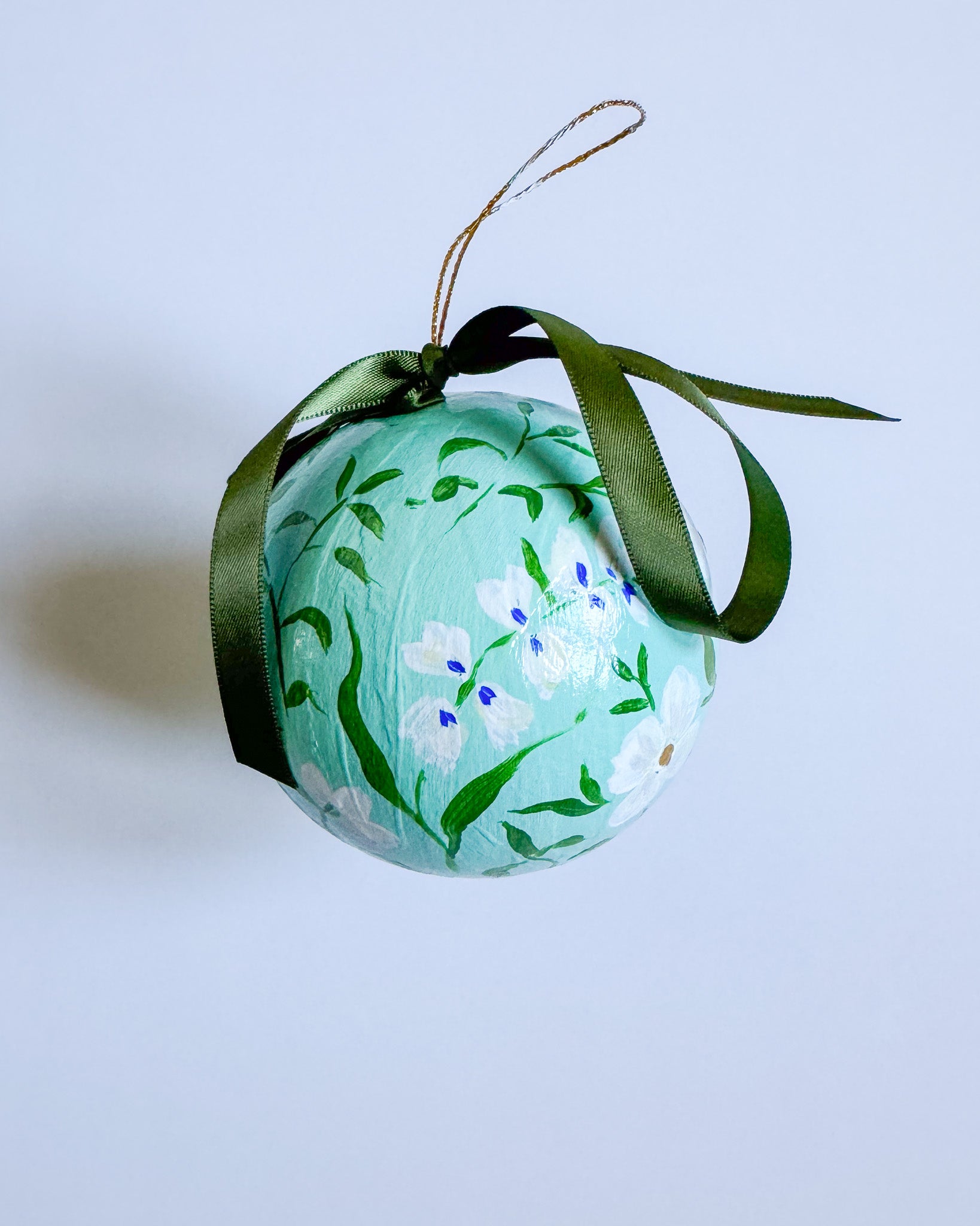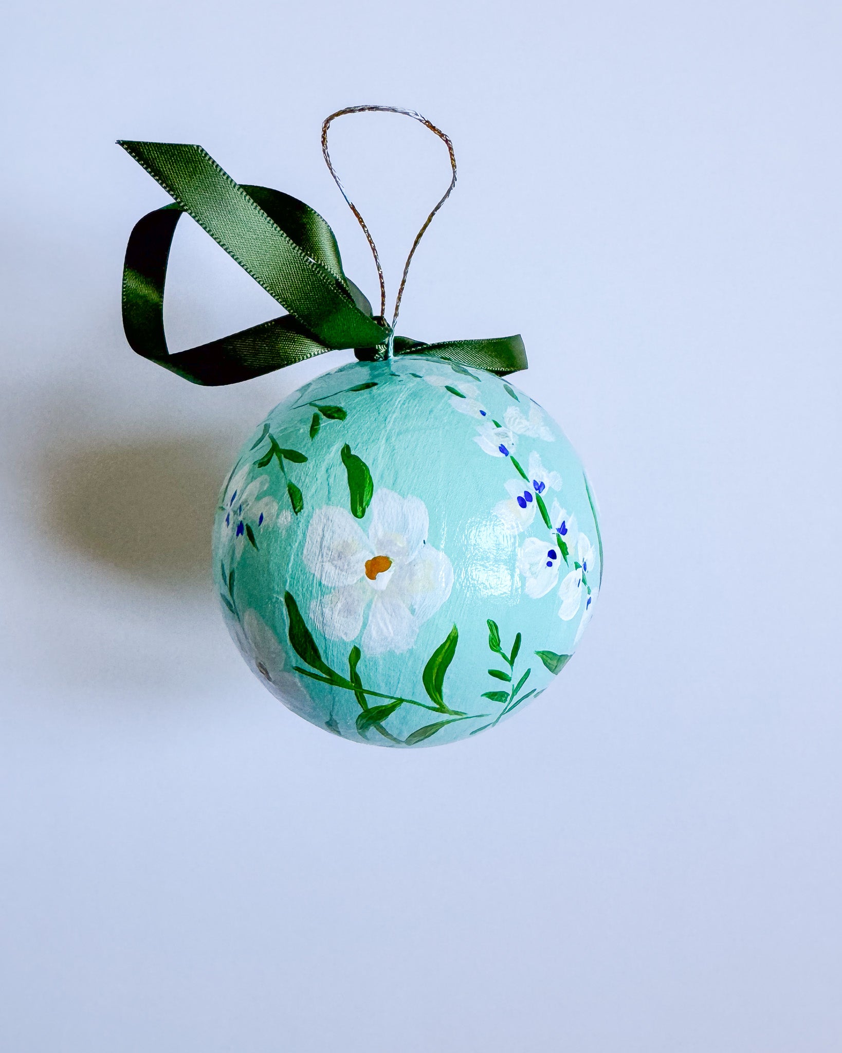 Papier mache ball ornament painted with acrylic paint and finished with an archival varnish.