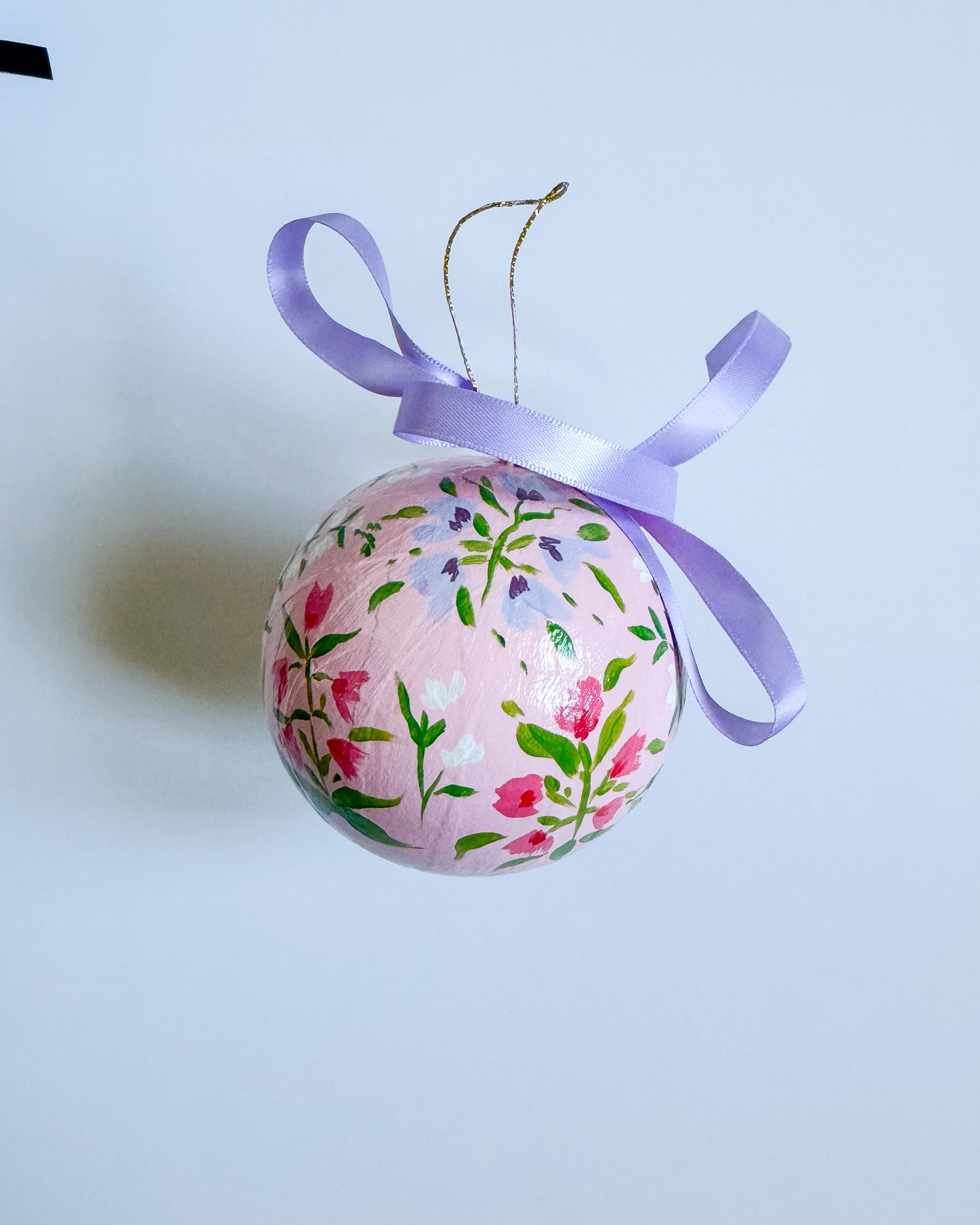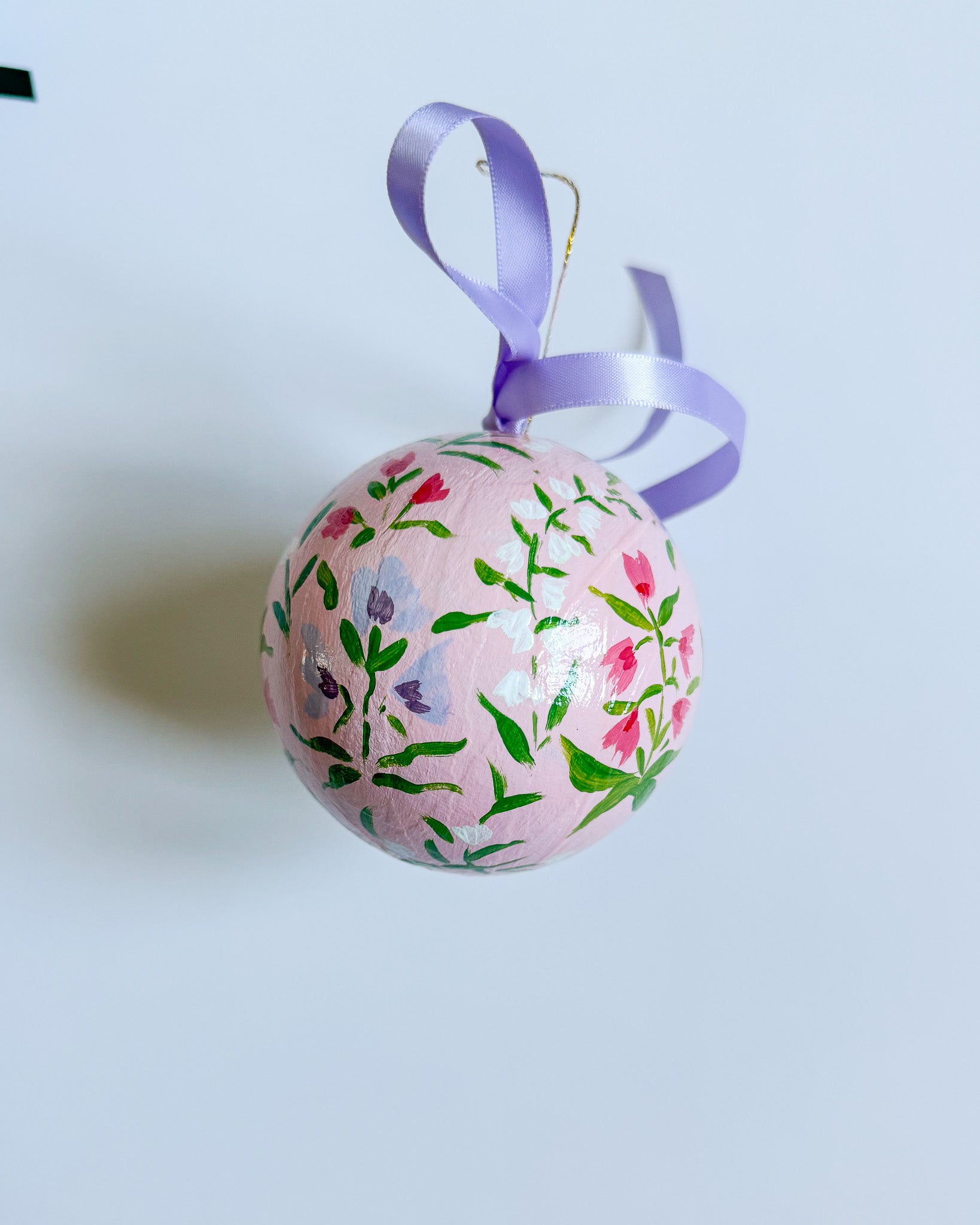 Papier mache ball ornament painted with acrylic paint and finished with an archival varnish.