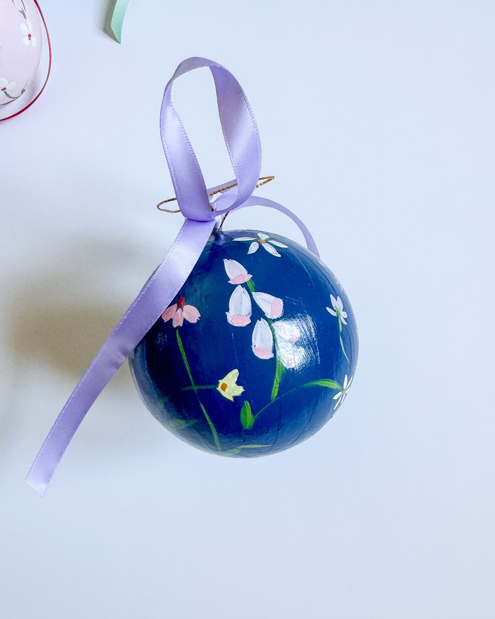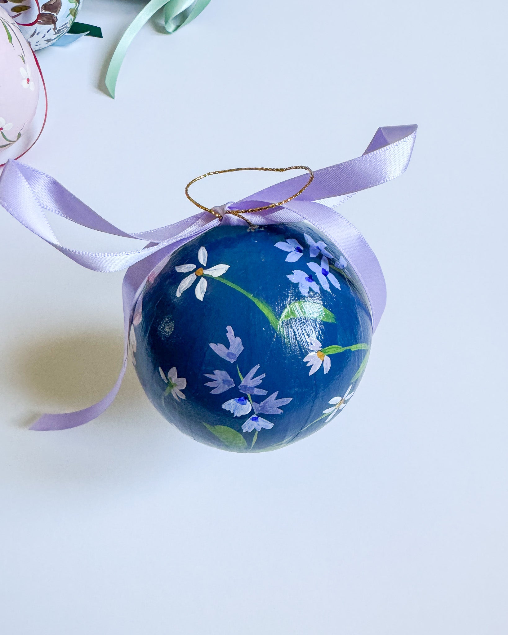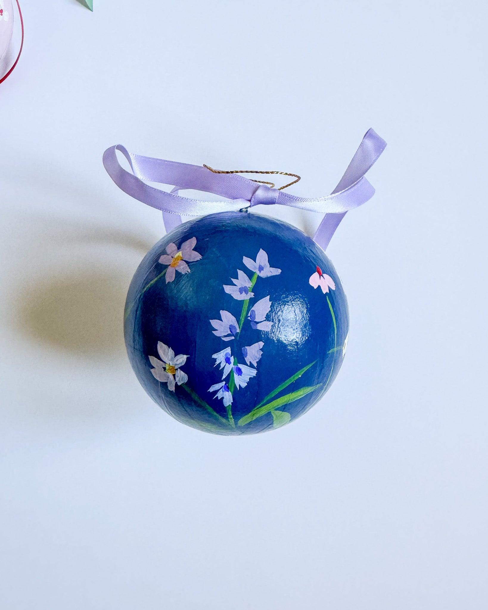 Papier mache ball ornament painted with acrylic paint and finished with an archival varnish.