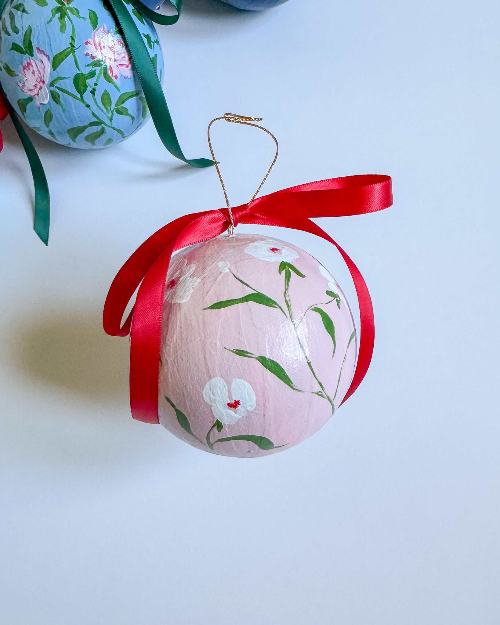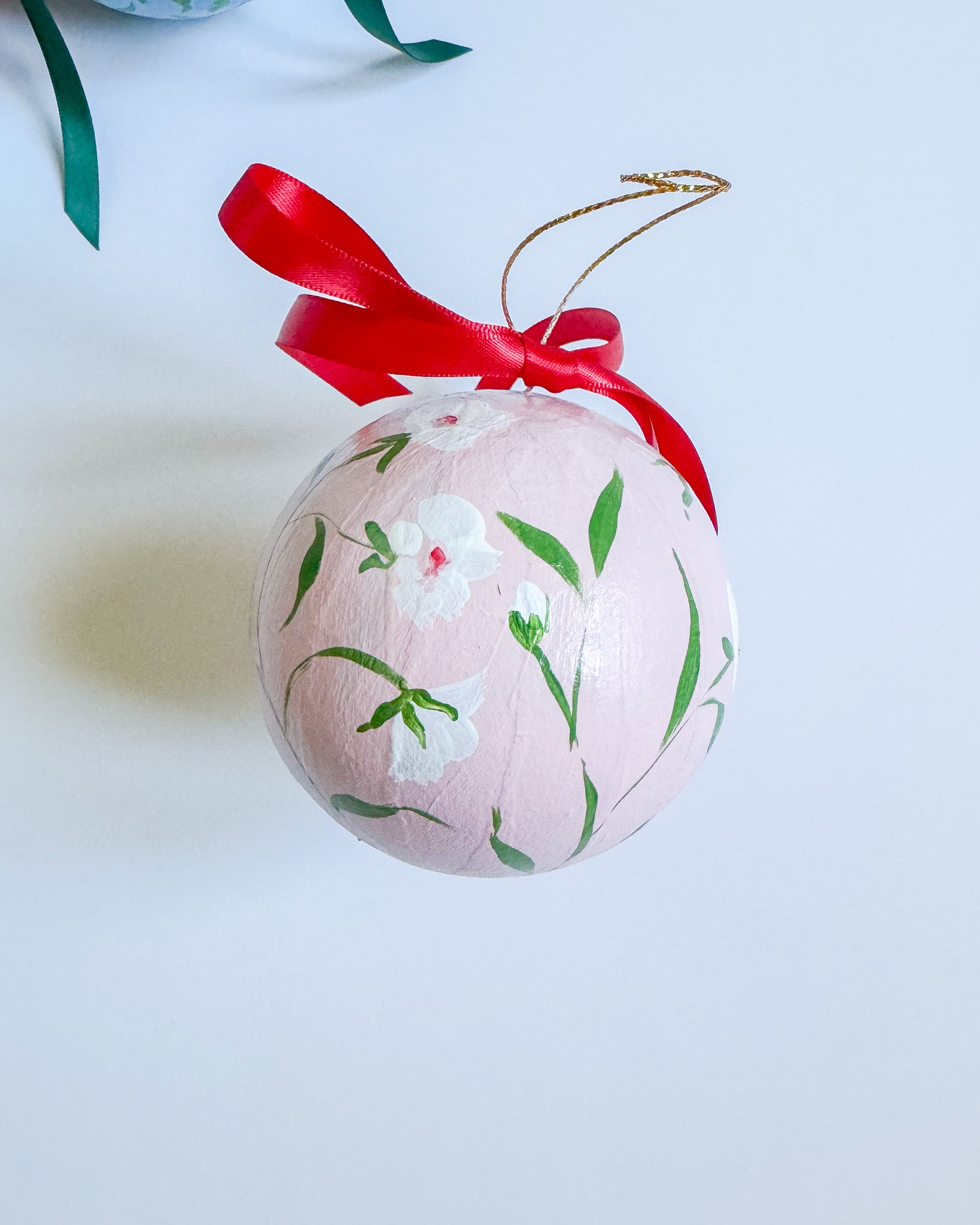 Papier mache ball ornament painted with acrylic paint and finished with an archival varnish.