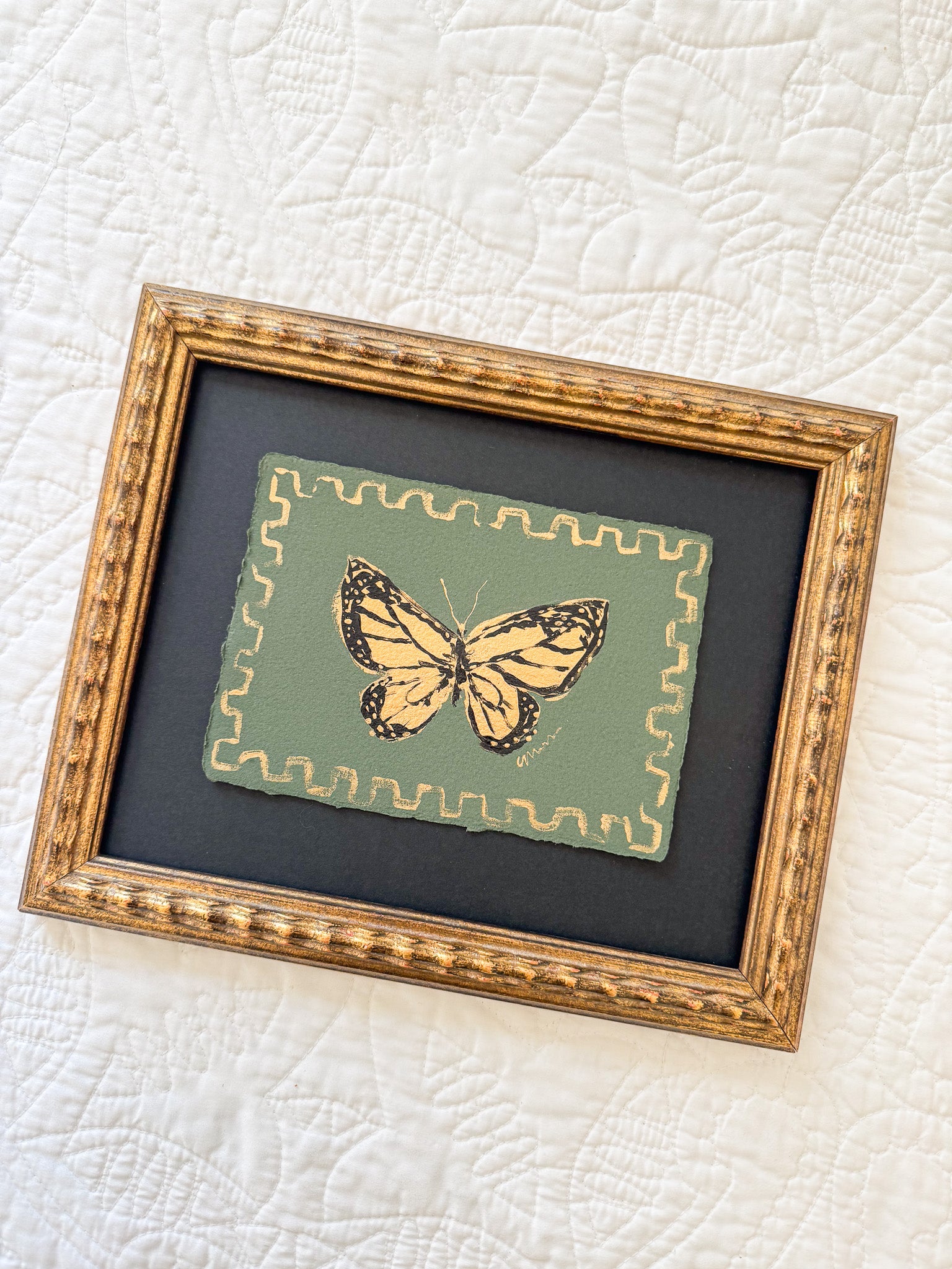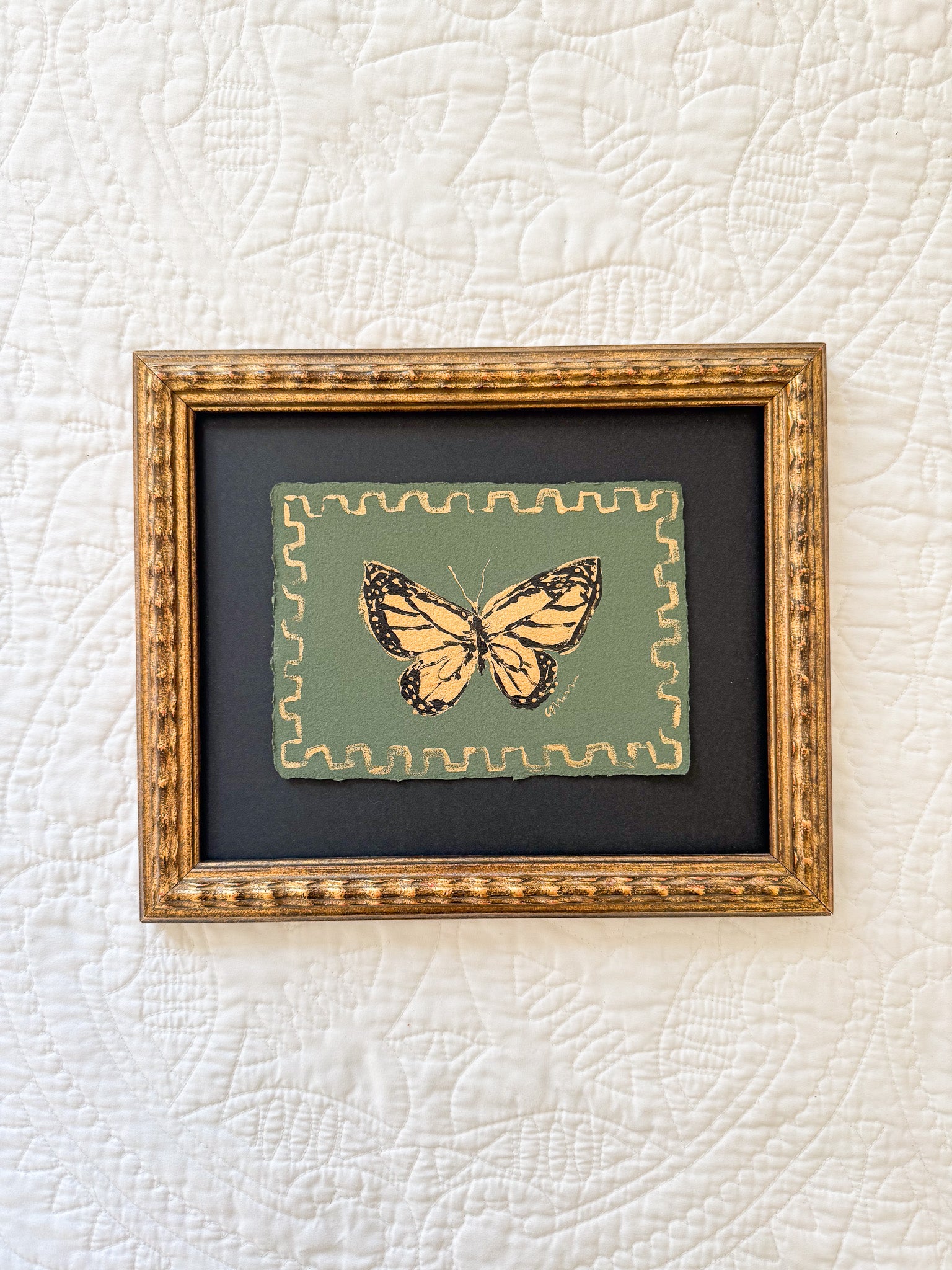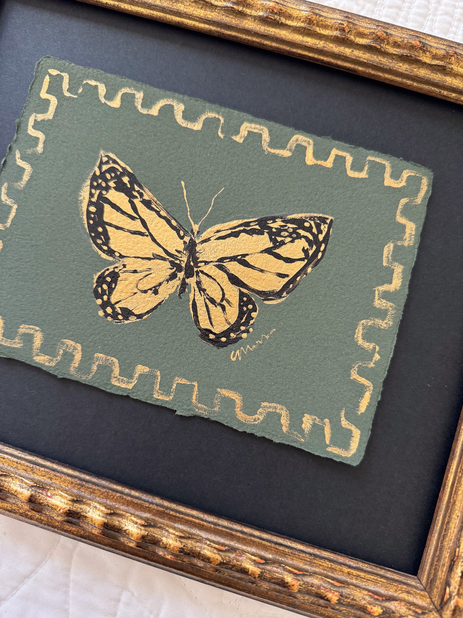 This original work by Camilla Moss is a gold butterfly in acrylic on deep green handmade paper measuring 5x7 mounted to an 8x10 black mat ready for easy framing. Frame shown is not included.