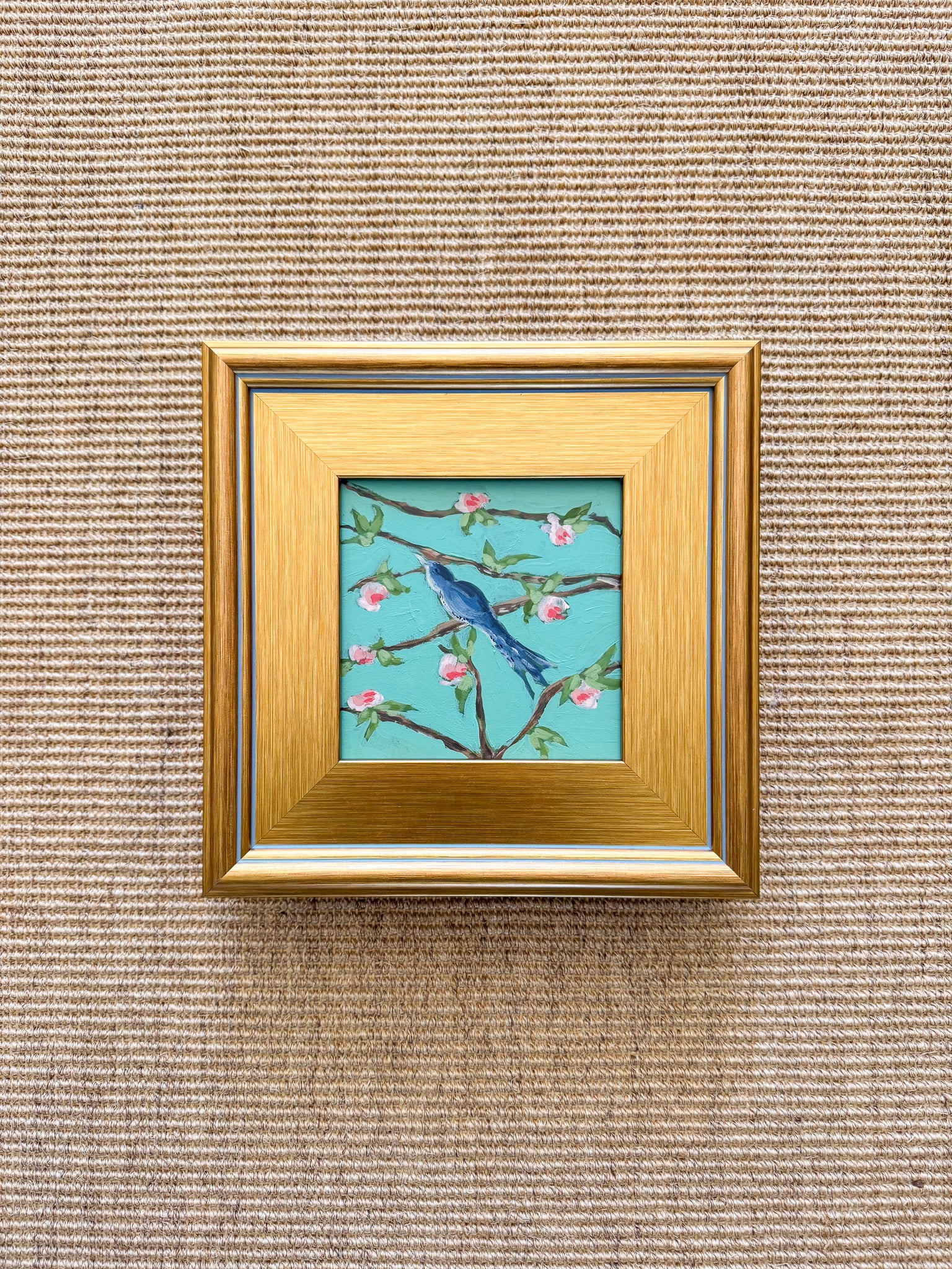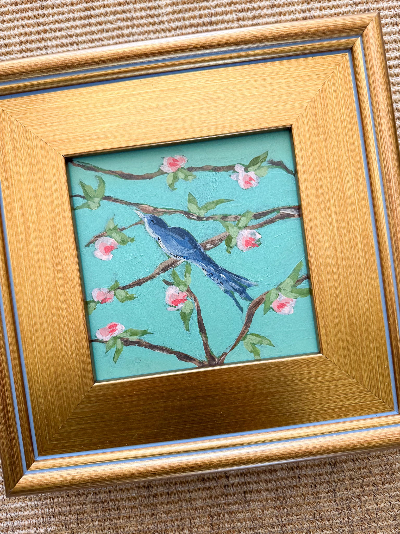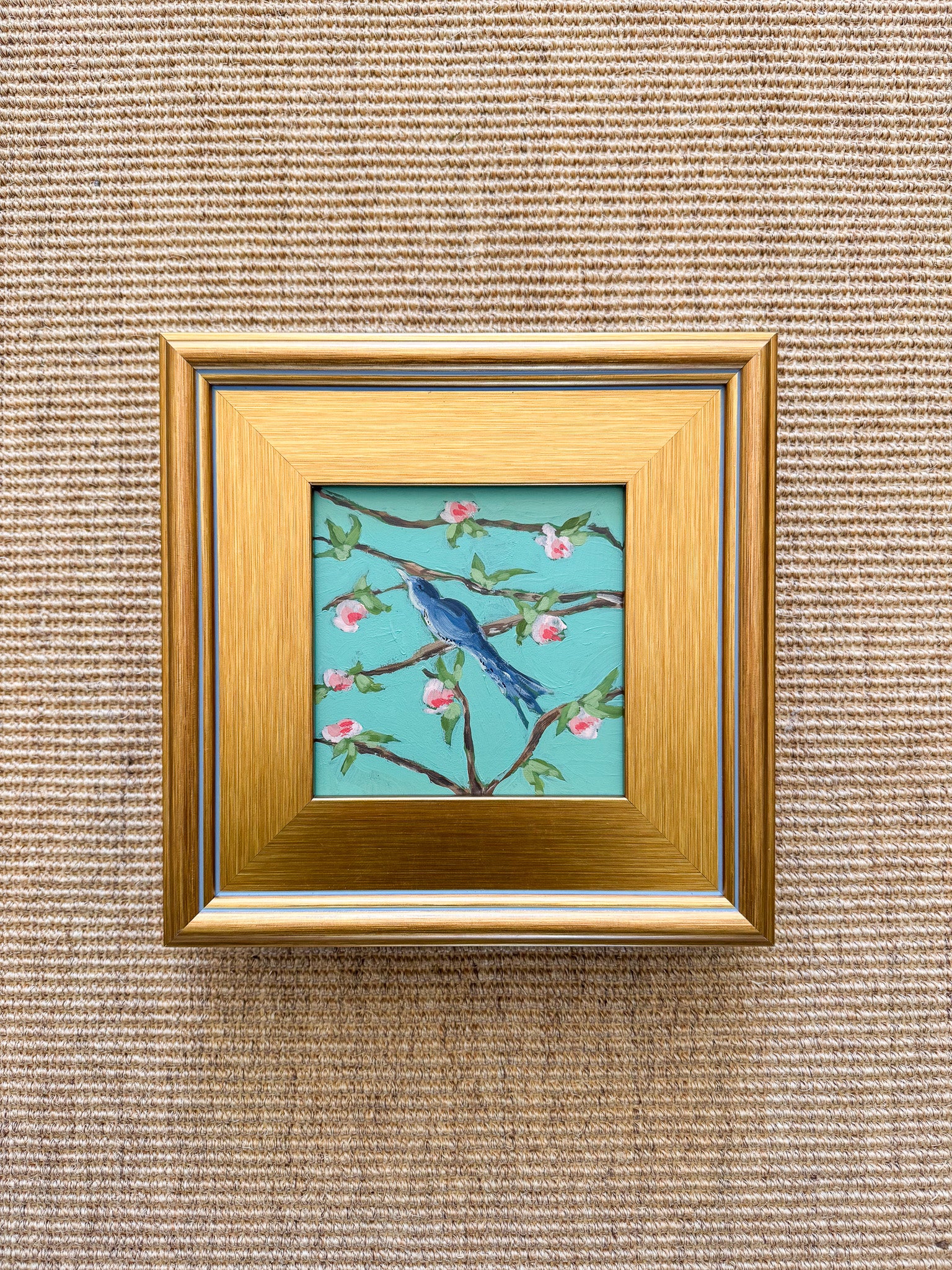 This original work by Camilla Moss is a chinoiserie inspired bird and branch painting on wood panel framed in a custom gold frame, ready for hanging. Frame measures approximately 11.5" x 11.5".