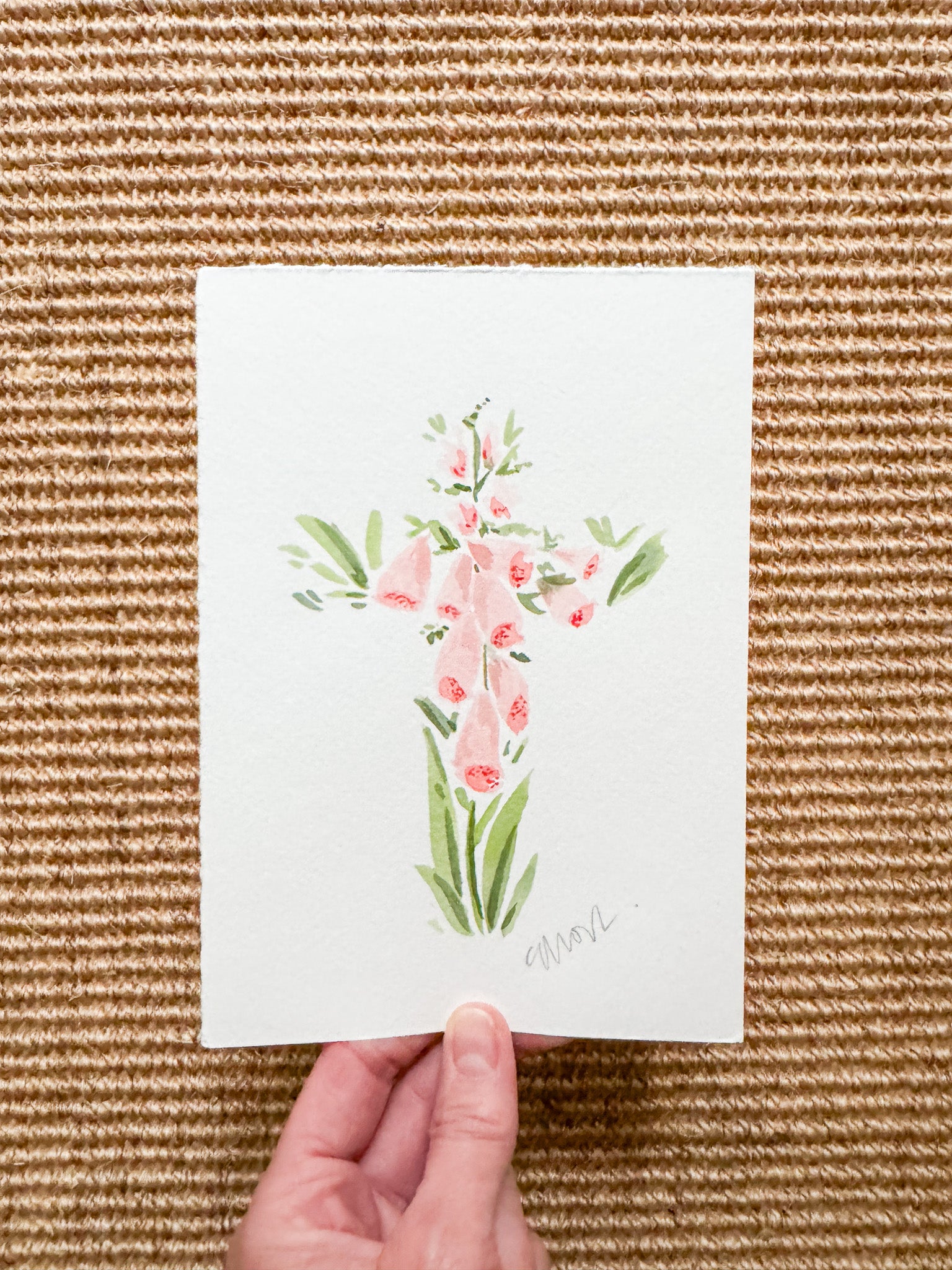 This original work by Camilla Moss is a watercolor floral cross on fine art watercolor paper, measuring 5x7 unframed. Any frame shown is not included.