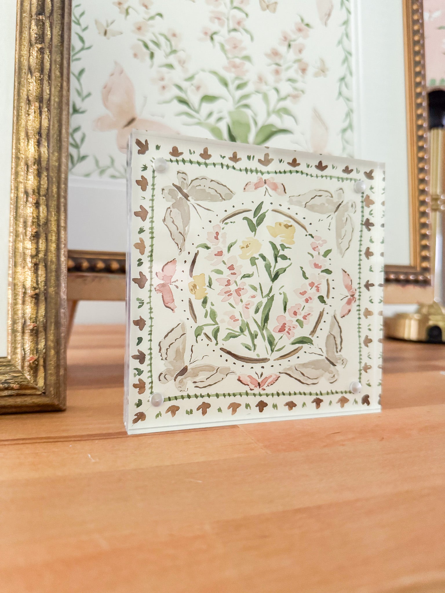 This original work by Camilla Moss is a watercolor floral and butterfly painting on fine art watercolor paper, measuring 5x5 in an acrylic frame.