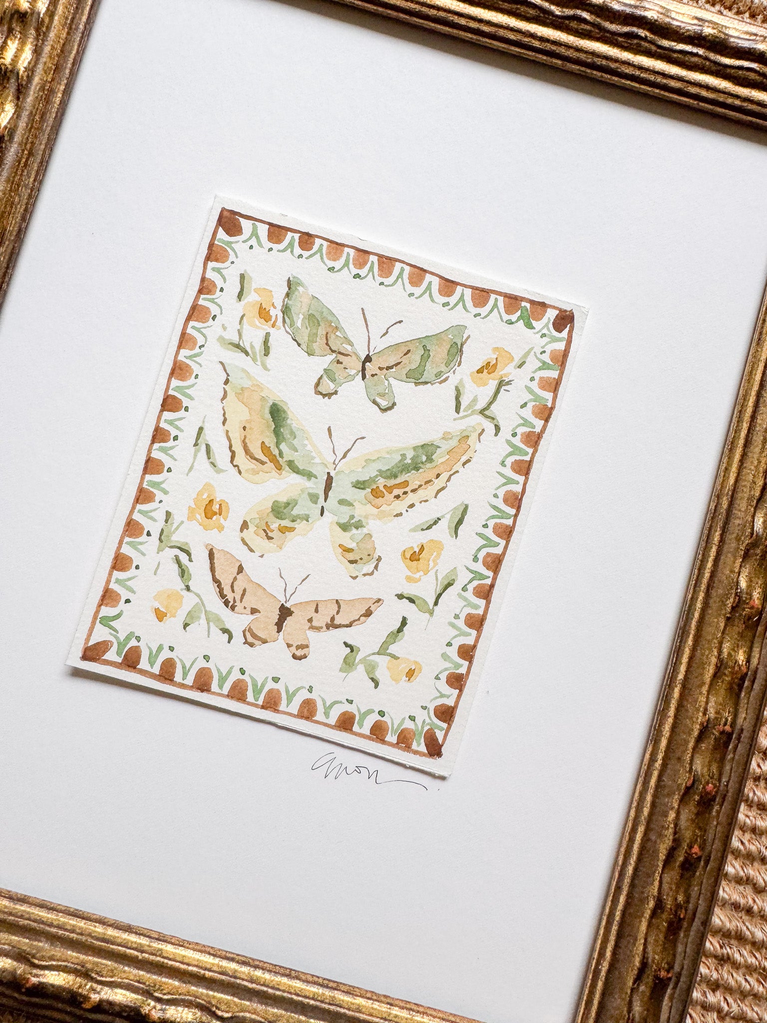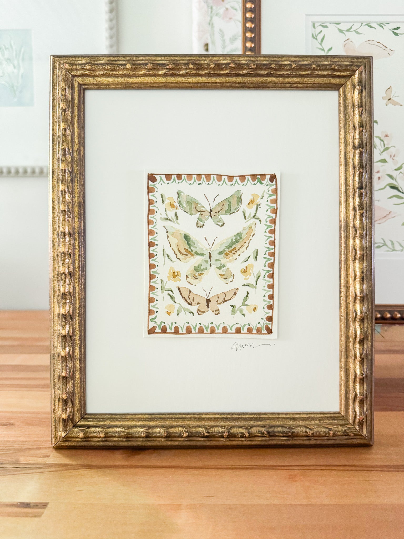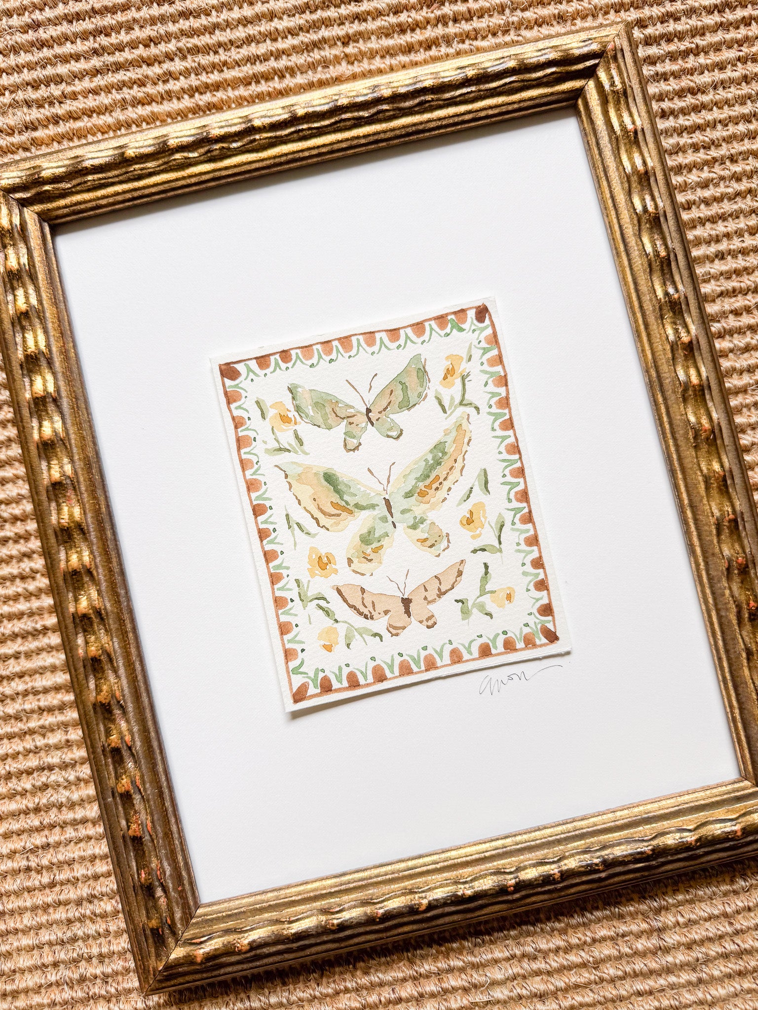 This original work by Camilla Moss is a watercolor floral and butterfly painting on fine art watercolor paper, measuring 4x5 mounted to an 8x10 mat ready for framing. Frame is not included.