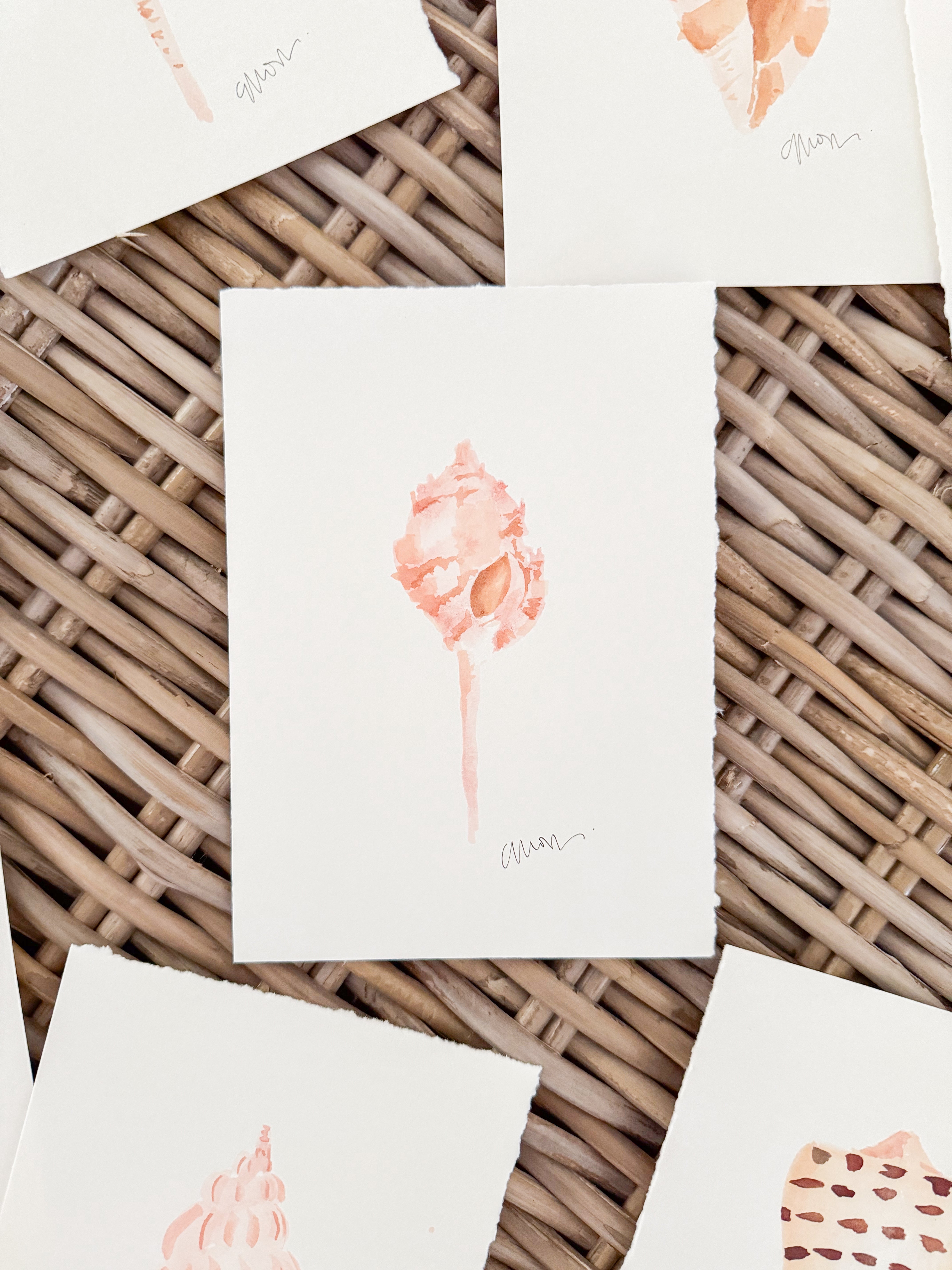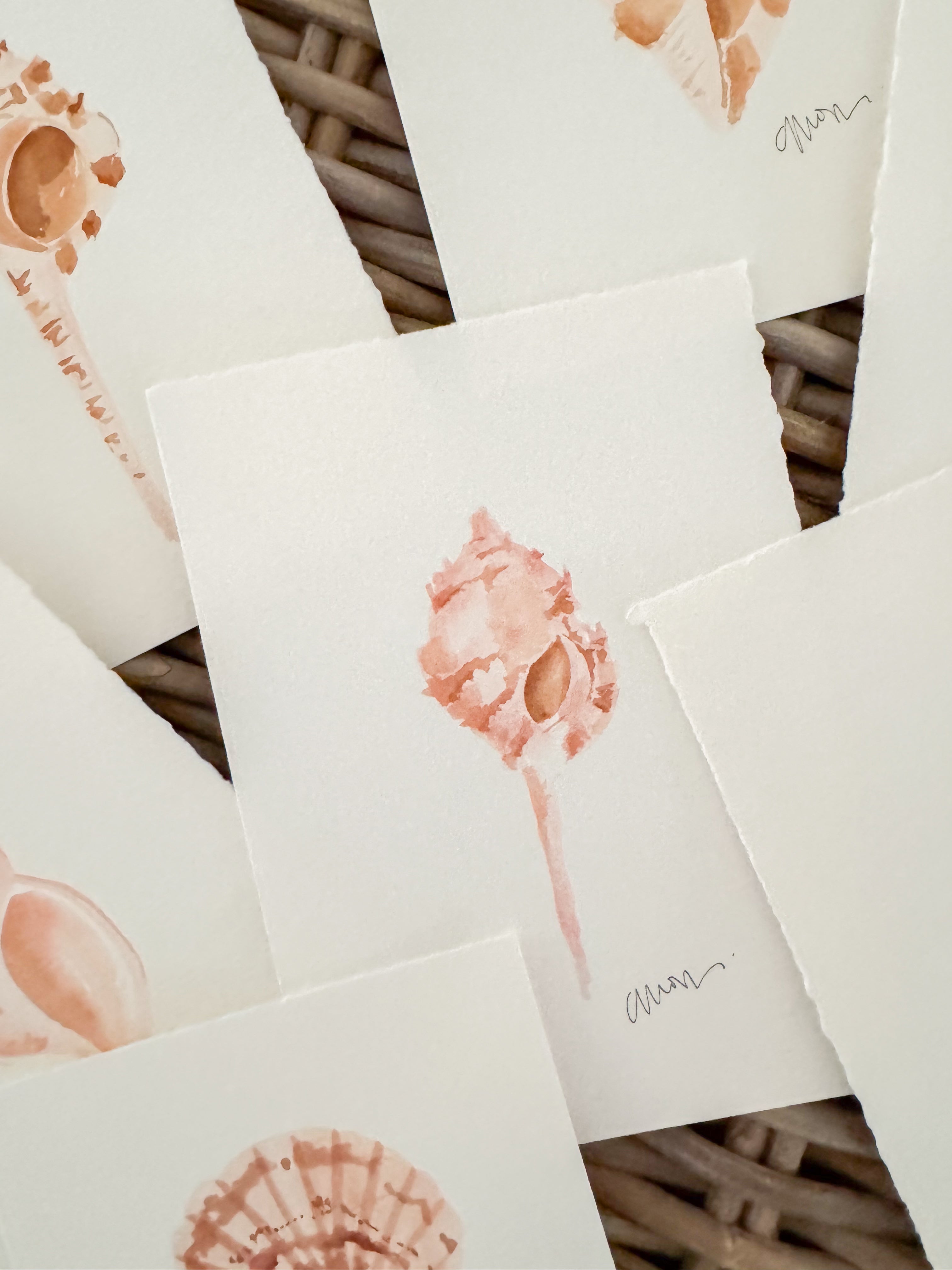 This original work by Camilla Moss is a seashell watercolor painting on Arches watercolor paper measuring approximately 5 x 7 painted in July 2024 as part of the By the Sea collection.