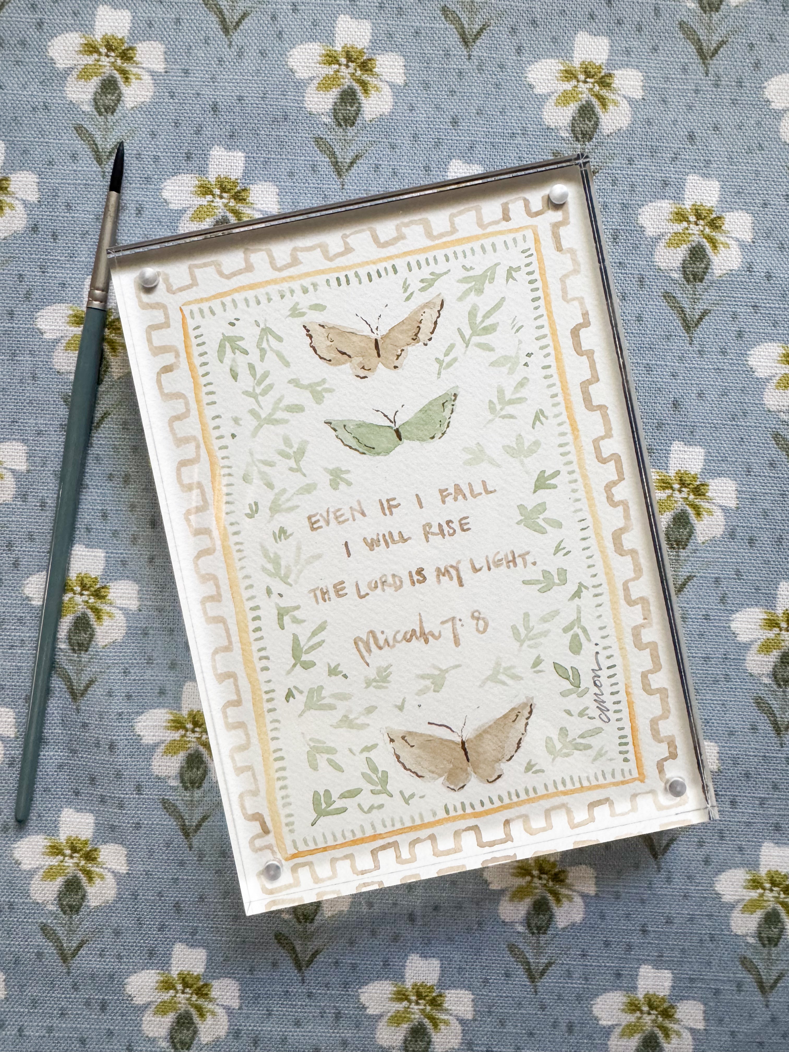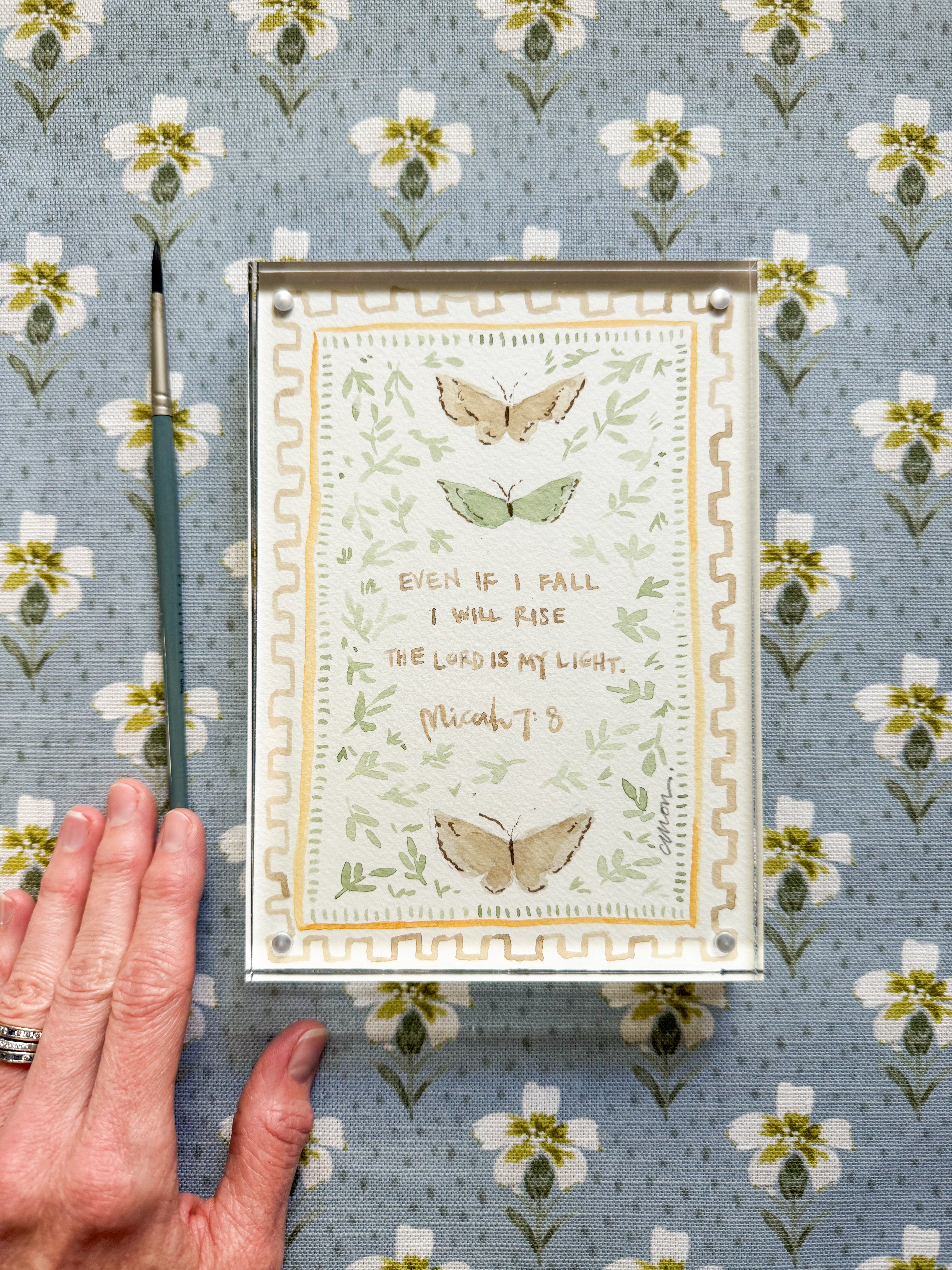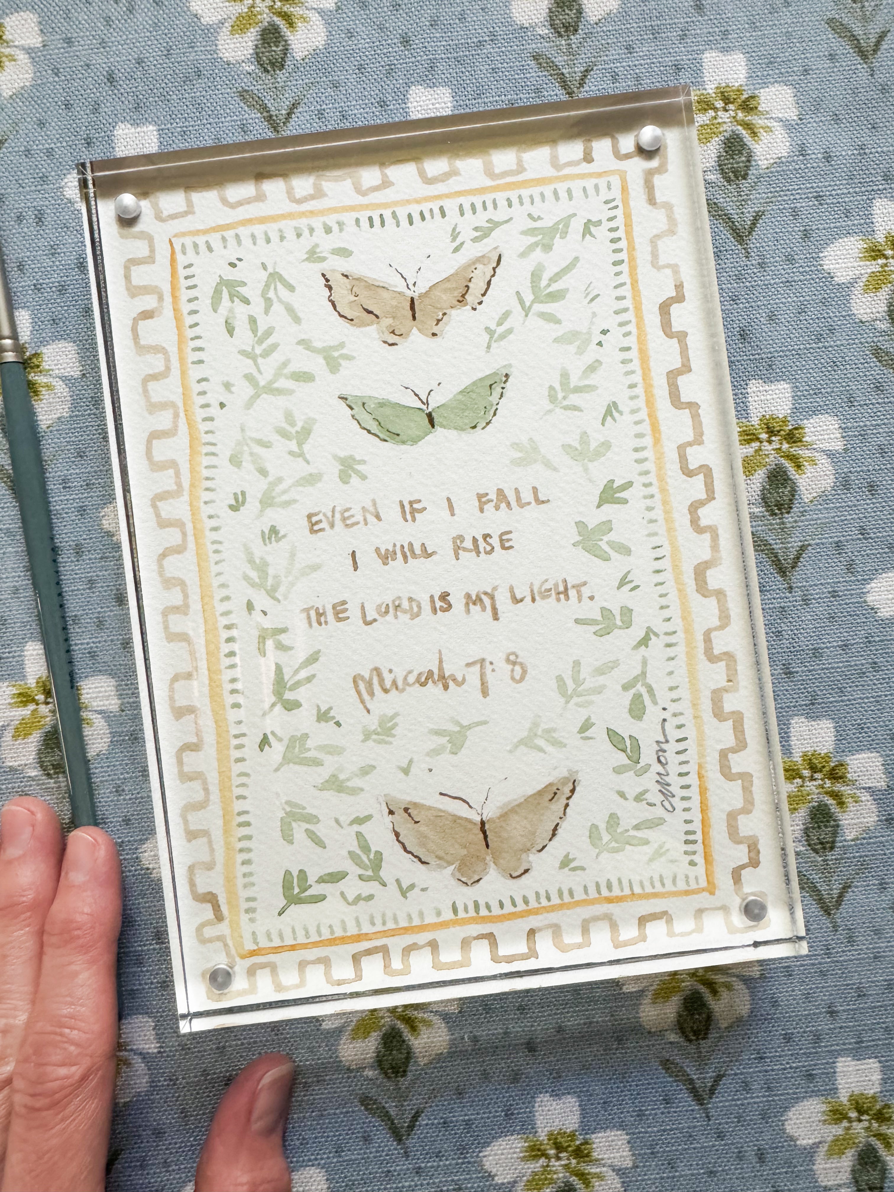 This original work by Camilla Moss is a watercolor painting on fine art watercolor paper, measuring 5x7 in an acrylic desktop frame.