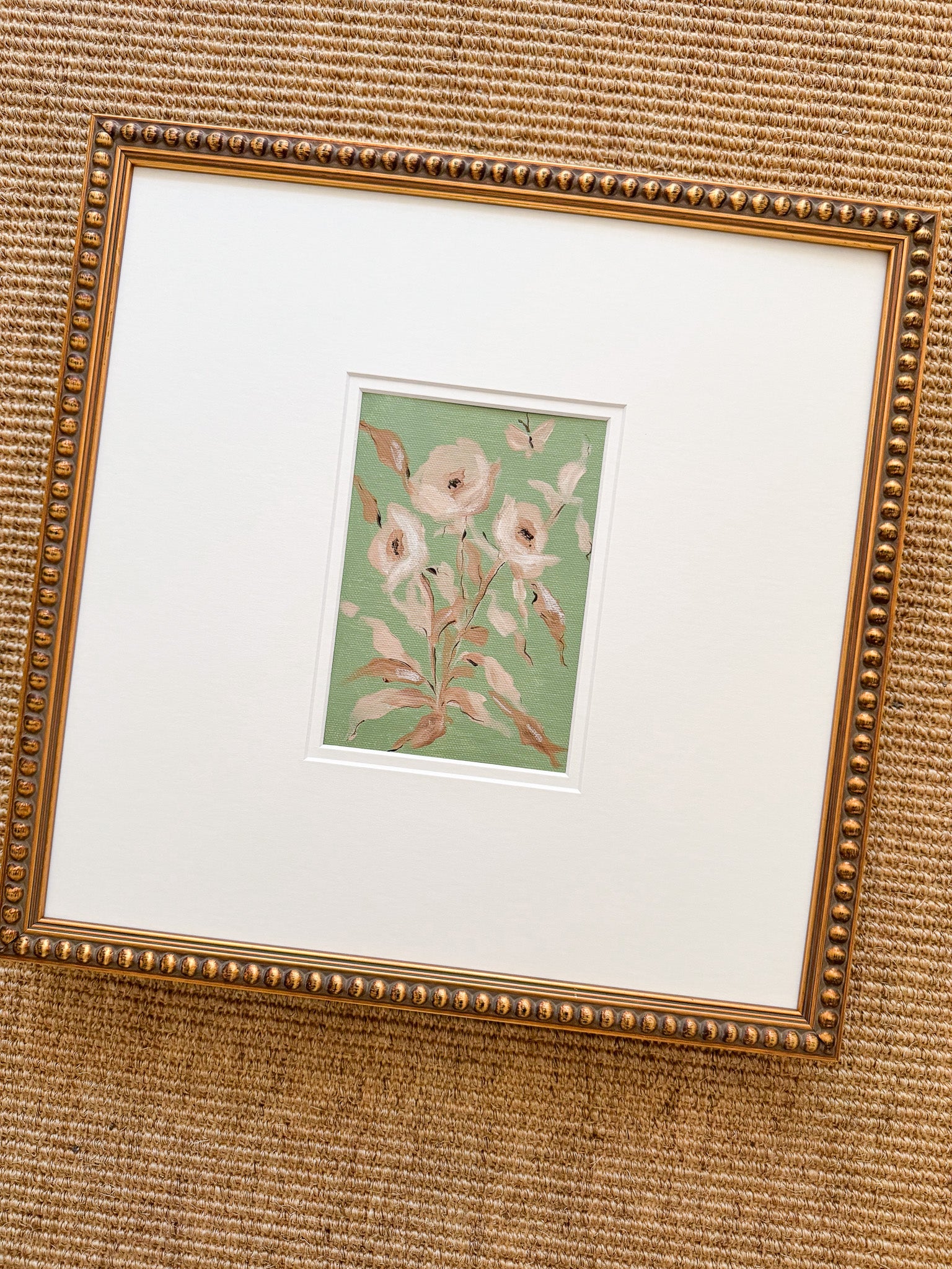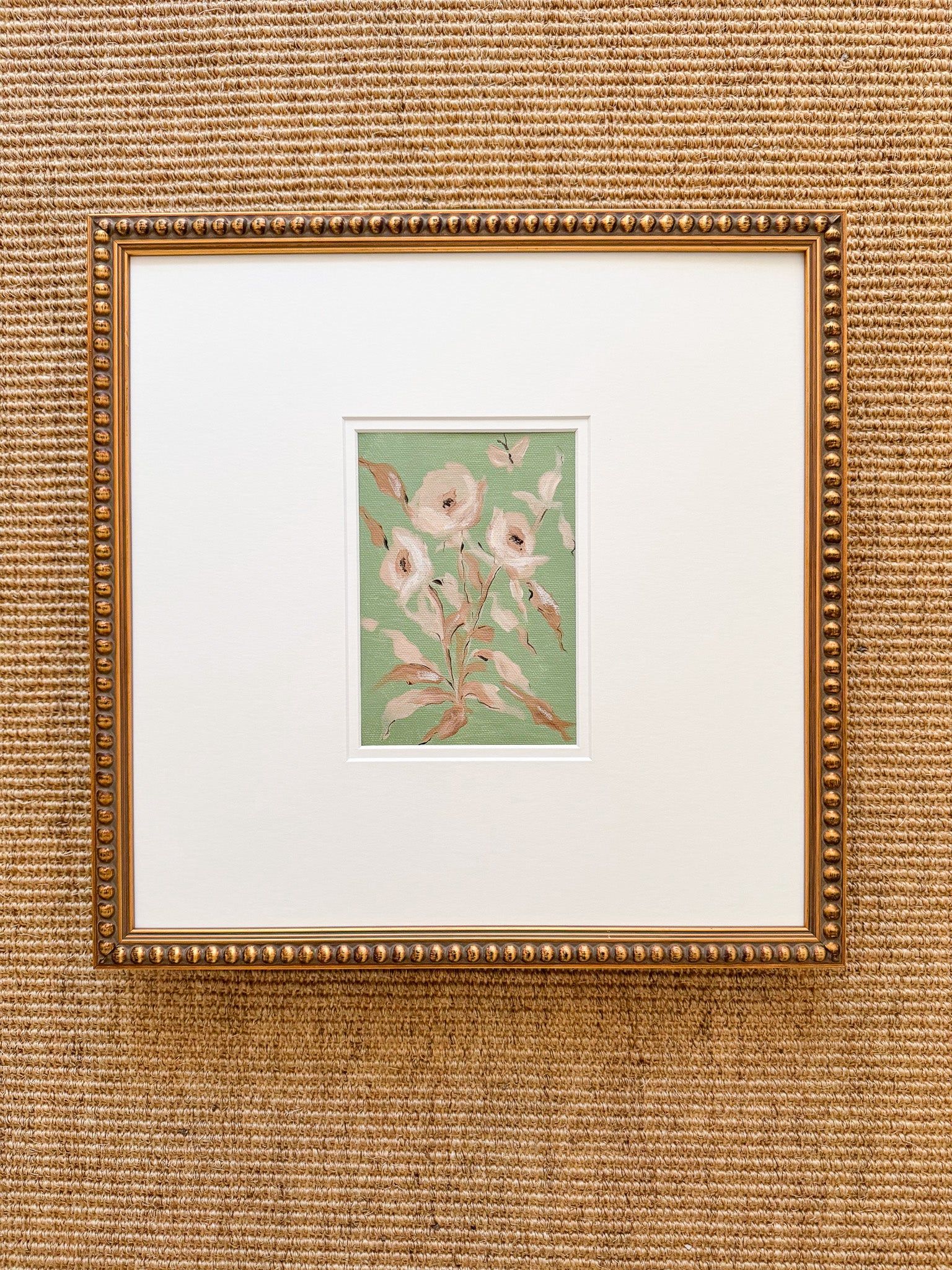 This original work by Camilla Moss is an acrylic floral wildflower painting measuring 5x7 on canvas in a custom 14 x 14 double mat, unframed. Frame shown is not included.